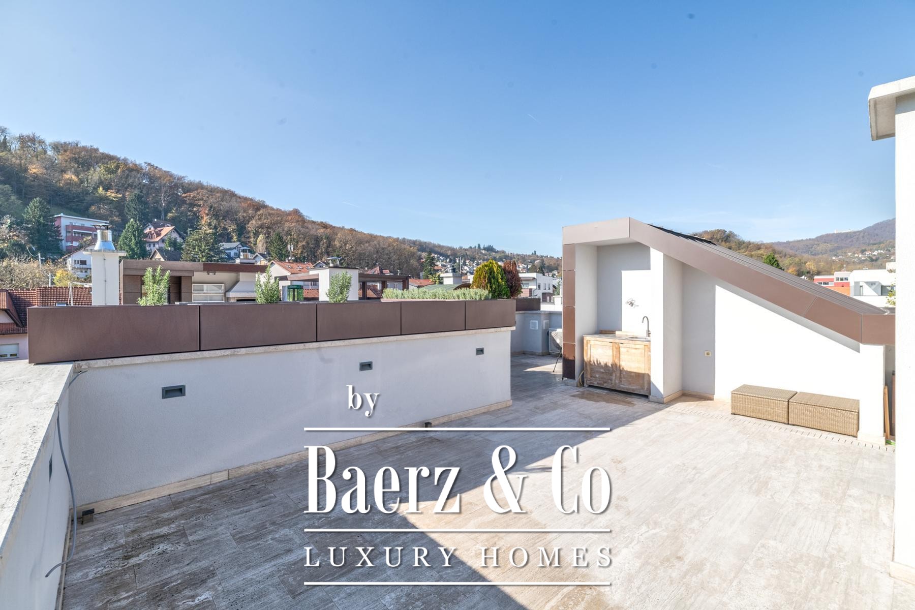 Une terrasse couverte sur le toit de 47 m², la climatisation dans tous les espaces principaux, un chauffage central au gaz et un chauffage au sol dans la cuisine et les salles de bains viennent renforcer le confort. Les vues dégagées sur le Sljeme et le Medvednica accentuent l’atmosphère paisible et retirée. Trois places de stationnement extérieures privatives sont incluses. À proximité, l’échangeur Mihaljevec donne accès au tramway et au bus et rapproche commodément des écoles, commerces et de la place centrale Bana Jelačić de Zagreb.