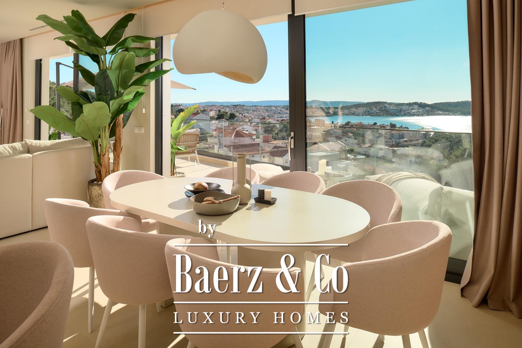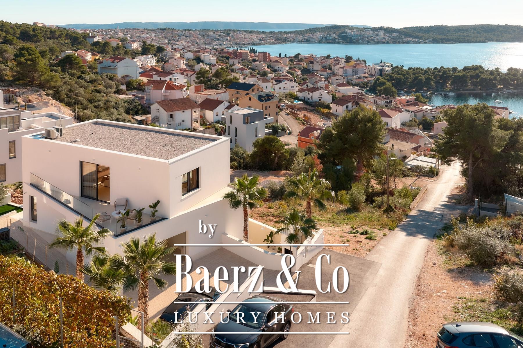 Située à quelques pas de la mer, à seulement 330 mètres de la plage, 500 mètres des commerces, ainsi qu’à proximité de Trogir, de l’aéroport de Split et de la ville de Split, cette villa moderne à vendre à Trogir incarne le luxe discret pour qui recherche une résidence familiale raffinée ou un investissement d’exception.