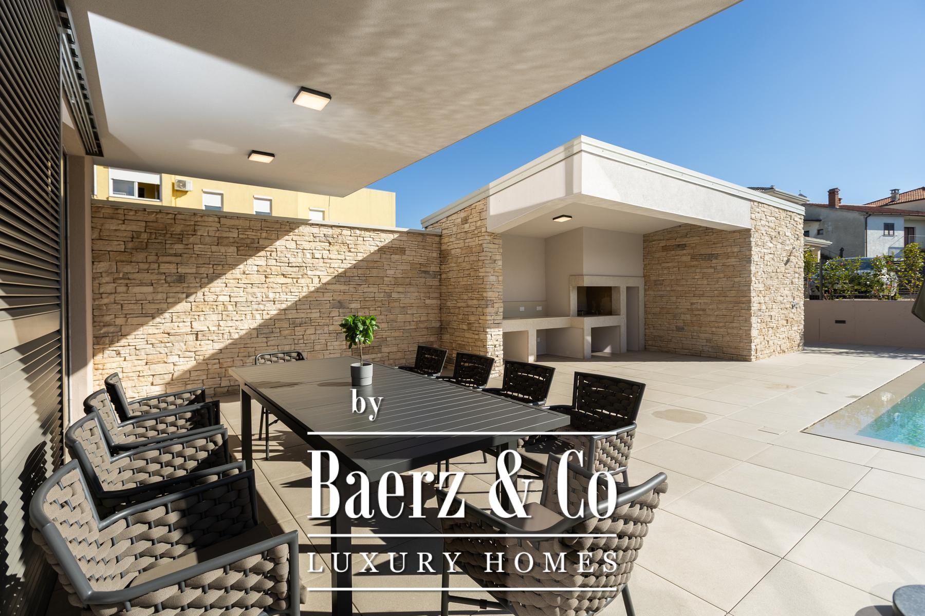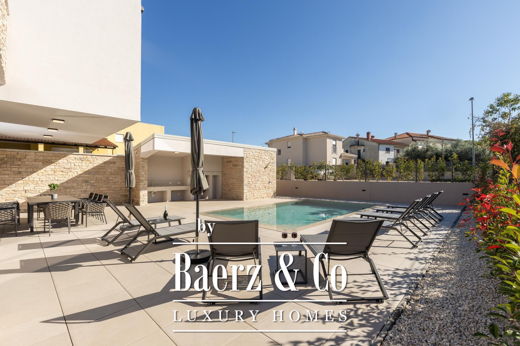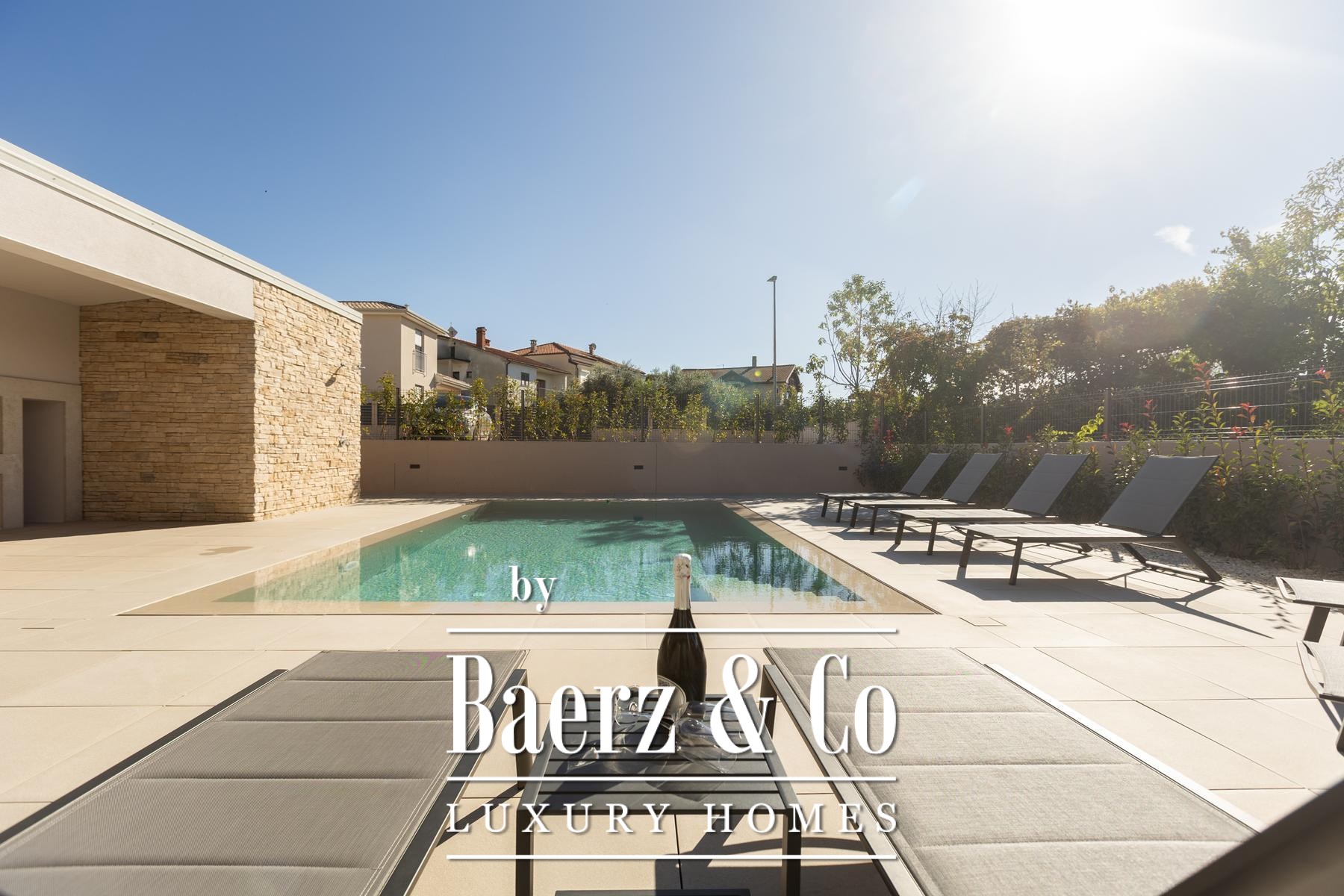 La villa moderne Umag offre une retraite méditerranéenne contemporaine dans l’enclave paisible de Finida. La façade marie des lignes épurées et modernes à des éléments en pierre naturelle, créant une atmosphère chaleureuse, empreinte d’un caractère régional subtil. Sur un terrain paysager de 888 m², le jardin est mis en valeur par une végétation choisie et des détails décoratifs raffinés, offrant à la fois intimité et espace pour se détendre. Une large terrasse et un solarium encadrent la piscine chauffée, propices à la détente et à la convivialité en extérieur.