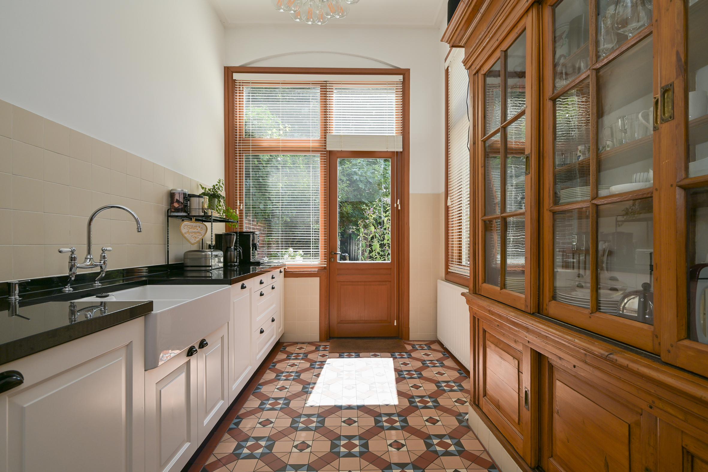 Indeling: entree, ruime hal met marmeren vloeren, tochtseparatie, brede gang met marmeren vloerdelen, fraai trappenhuis met spijltjes, open ruimte onder de trap, moderne wc met fonteintje. Royale brede kamers met marmeren schouwen (met in de voorkamer een houthaard), hoge geornamenteerde plafonds, suite separatie met schuifdeuren en vaste kasten en fraaie parketvloeren. De achterkamer heeft dubbele deuren naar de serrekamer en is eveneens in verbinding met de royale moderne keuken voorzien van (inbouw)apparatuur aan de ene zijde en een prachtige originele ingebouwde servieskast aan de andere zijde. Zowel de keuken als de serrekamer bieden toegang tot de ruime zonnige achtertuin met diverse schuurtjes en een achteringang (afsluitbare toegangsdeur aan de straat). Onder de keuken ligt een praktische kelderruimte van ca. 14 m2 en 1,81m hoog.