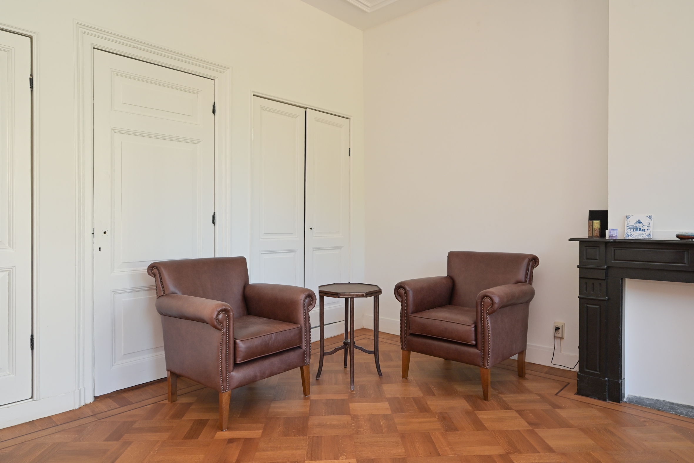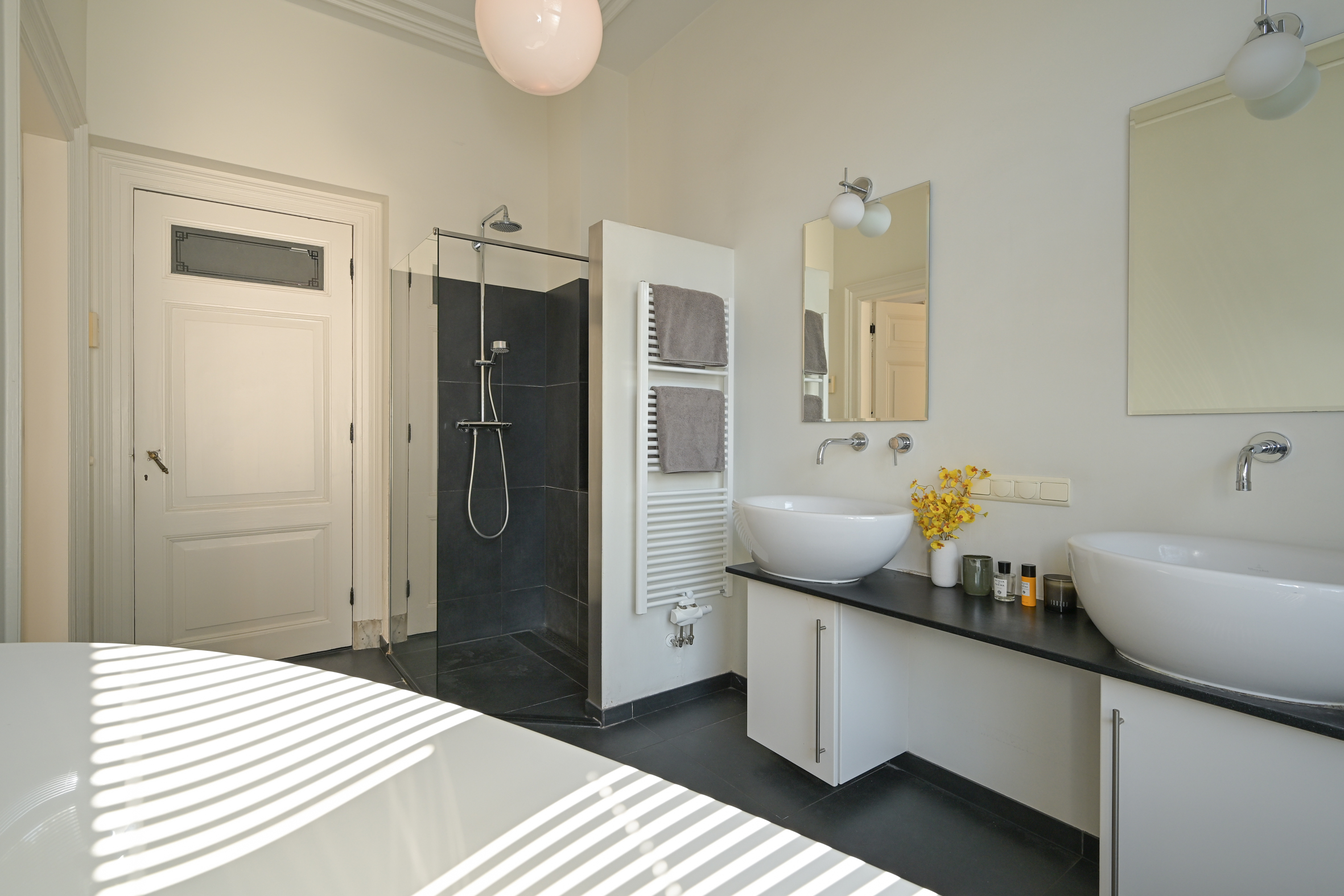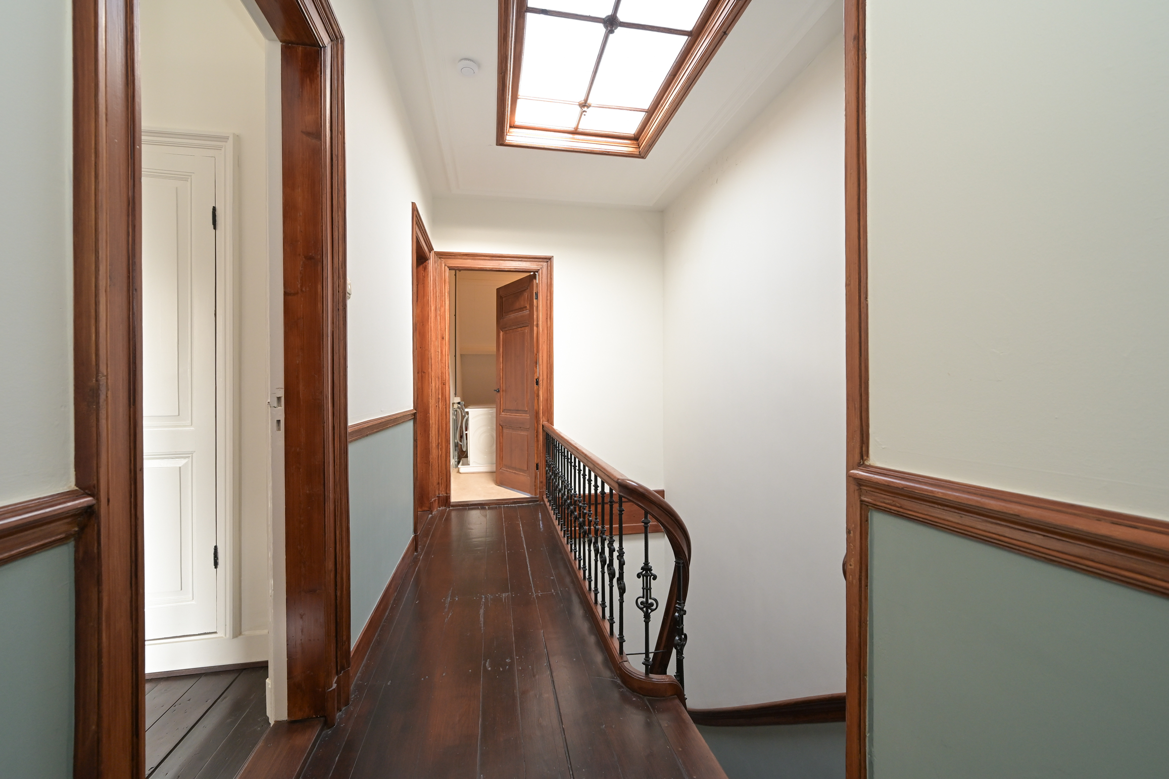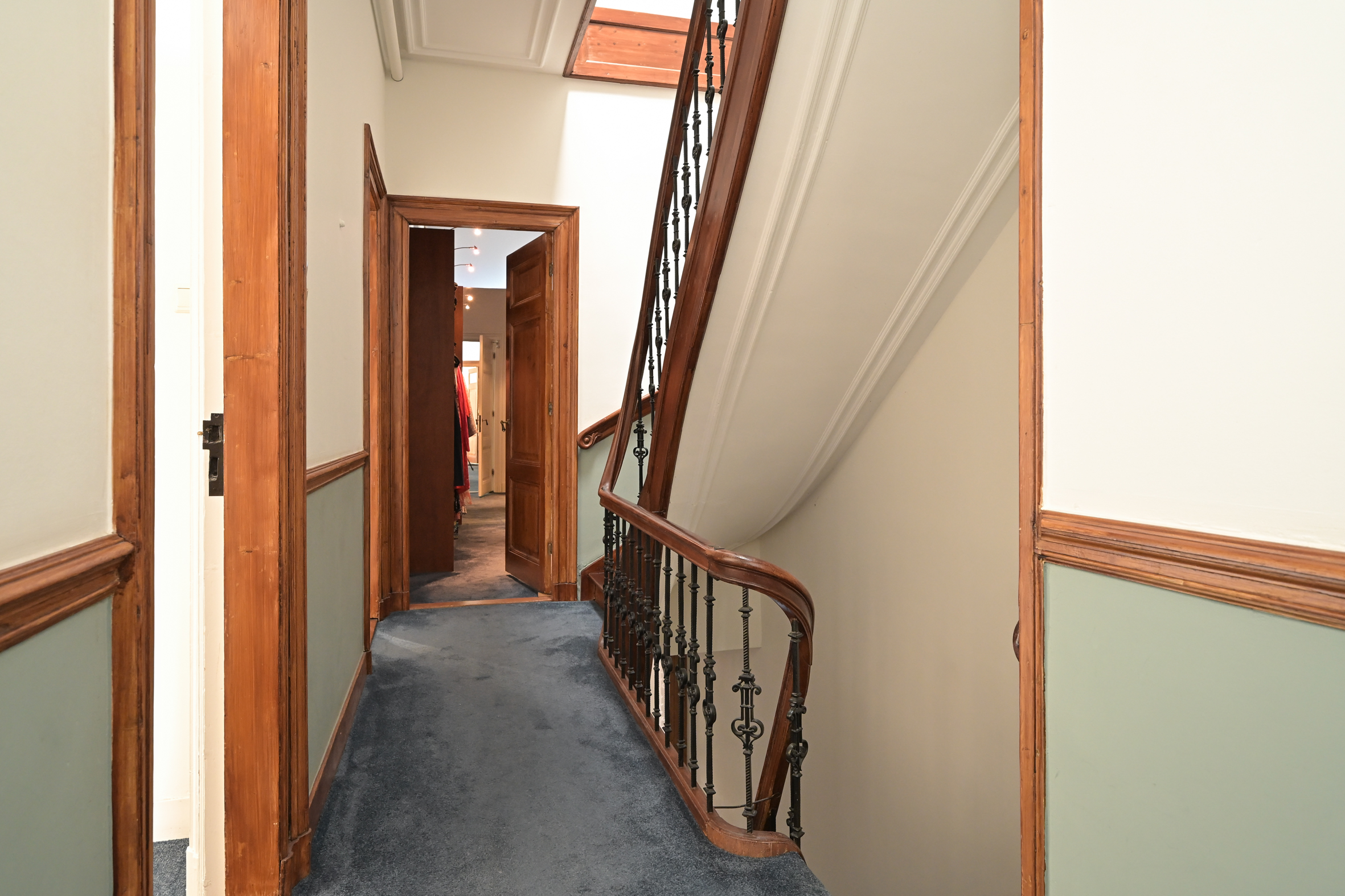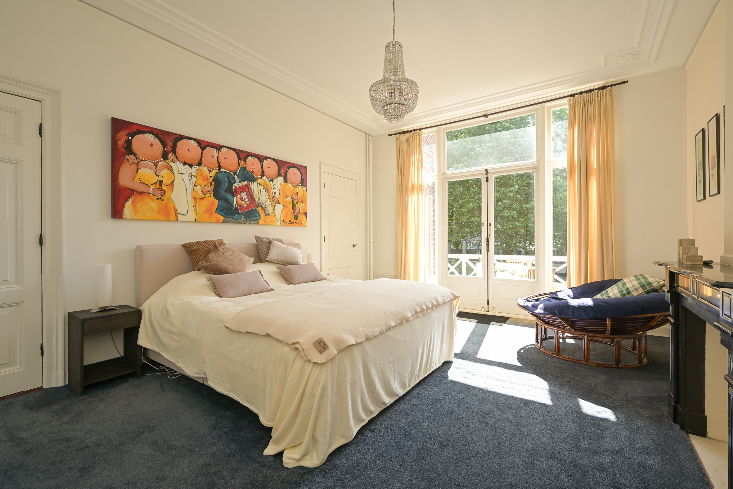De fraaie trap leidt naar de overloop met moderne wc met fonteintje, de voorkamer biedt vrij zicht en heeft een fraaie parketvloer, hoog plafond met lijstwerk, marmeren schouw en ingebouwde kasten. De voorzijkamer is thans in gebruik als inloopgarderobekamer maar kan ook als studeerkamer of extra slaapkamer fungeren. De achterkamer heeft eveneens ingebouwde kasten, een fraai plafond en marmeren schouw en biedt enerzijds toegang tot het ruime achterbalkon en anderzijds toegang tot de moderne badkamer met design ligbad, dito wastafels met ombouw en inloopdouche. De badkamer is voorzien van elektrische vloerverwarming en is ook vanaf de overloop bereikbaar.