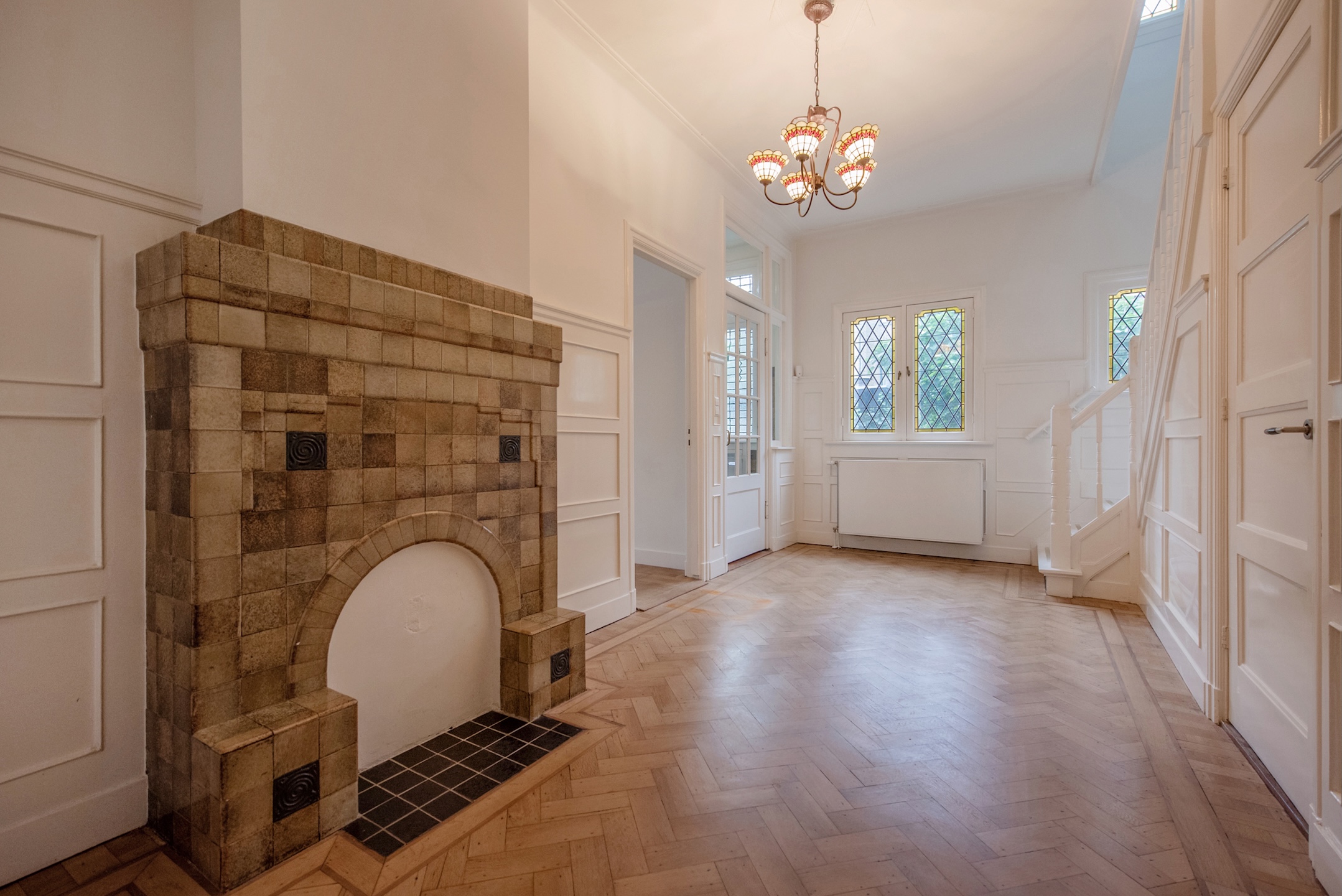 Naast de auto-opstelplaats bevindt zich de entree van de woning. Achter de voordeur bevindt zich een ruime vestibule met fraaie originele betegeling en een deur met glas in roedeverdeling naar een mooie representatieve ontvangsthal, voorzien van een visgraatparketvloer met dubbele bies.
