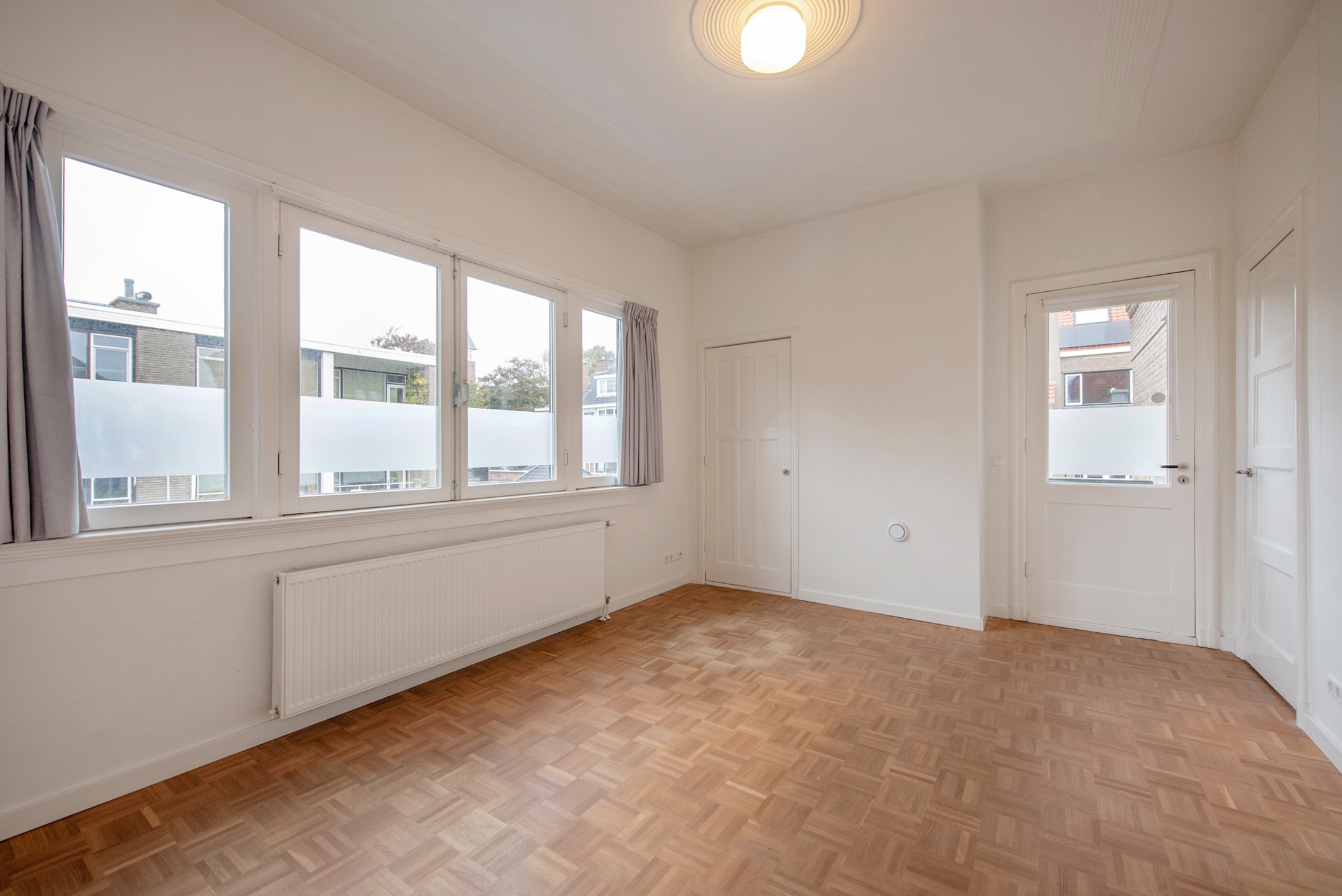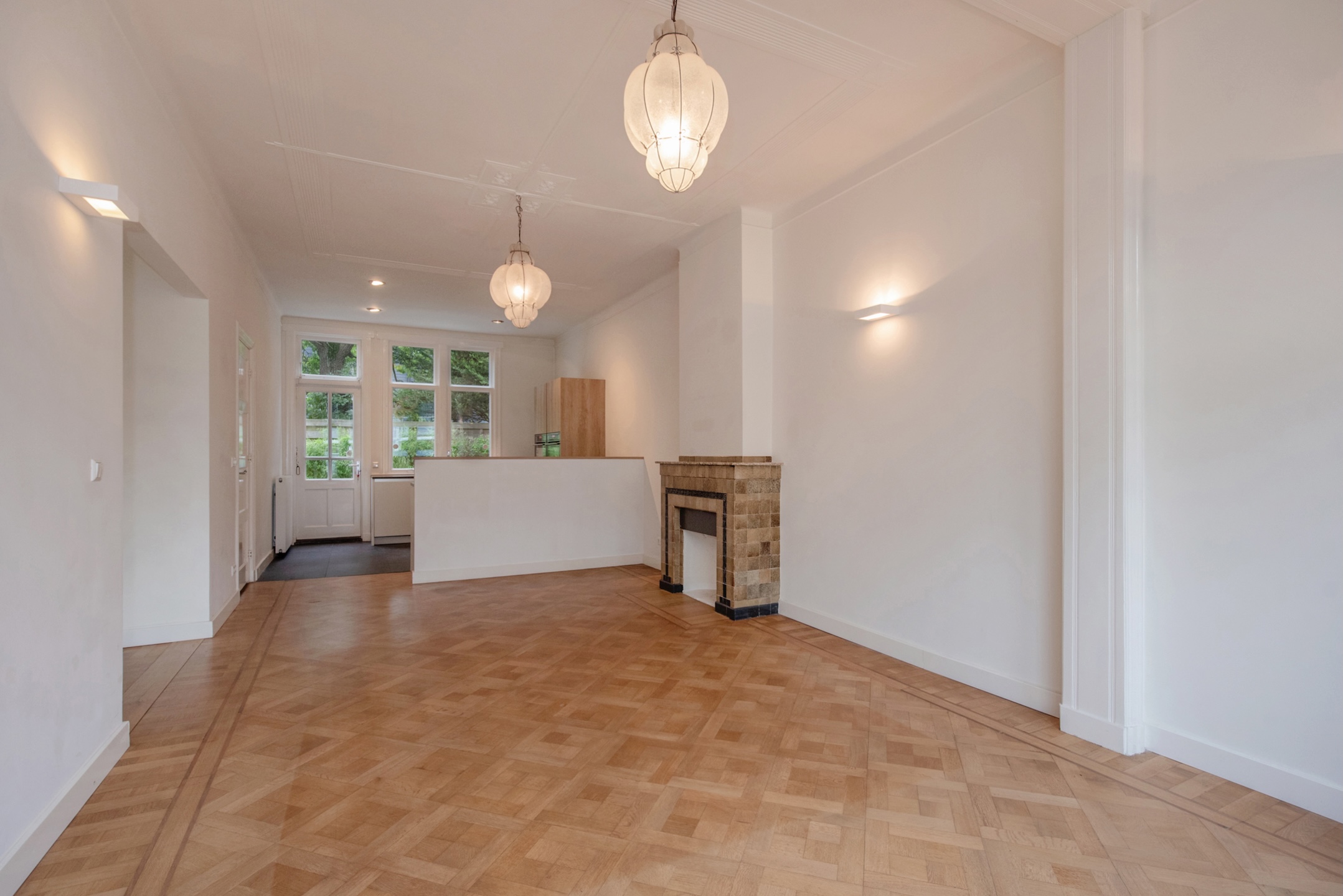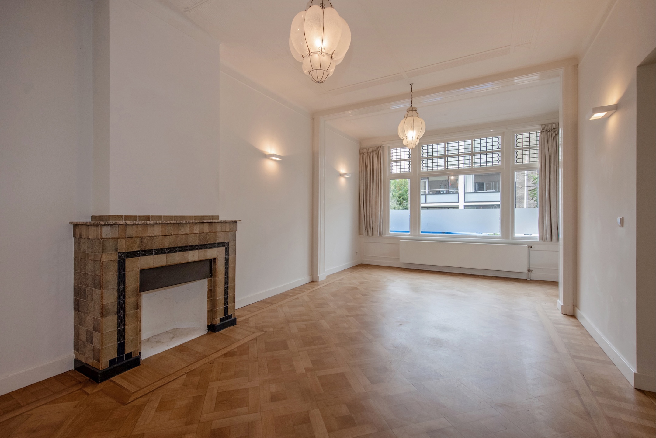 De woning heeft een lichte woonkamer met mozaïek parketvloer, een grote brede raampartij (HR++) met glas-in-lood bovenlichten, en een fraai hoog plafond voorzien van lijstwerk en ornament(en). Er is een brede doorgang naar de tweede woon-/eetkamer, met een fraaie mozaïek-parketvloer, een originele stenen schouw, een halfronde erker met glas-in-lood bovenlichten en een deur naar de voortuin. Deze kamer is ook rechtstreeks vanuit de centrale hal bereikbaar.