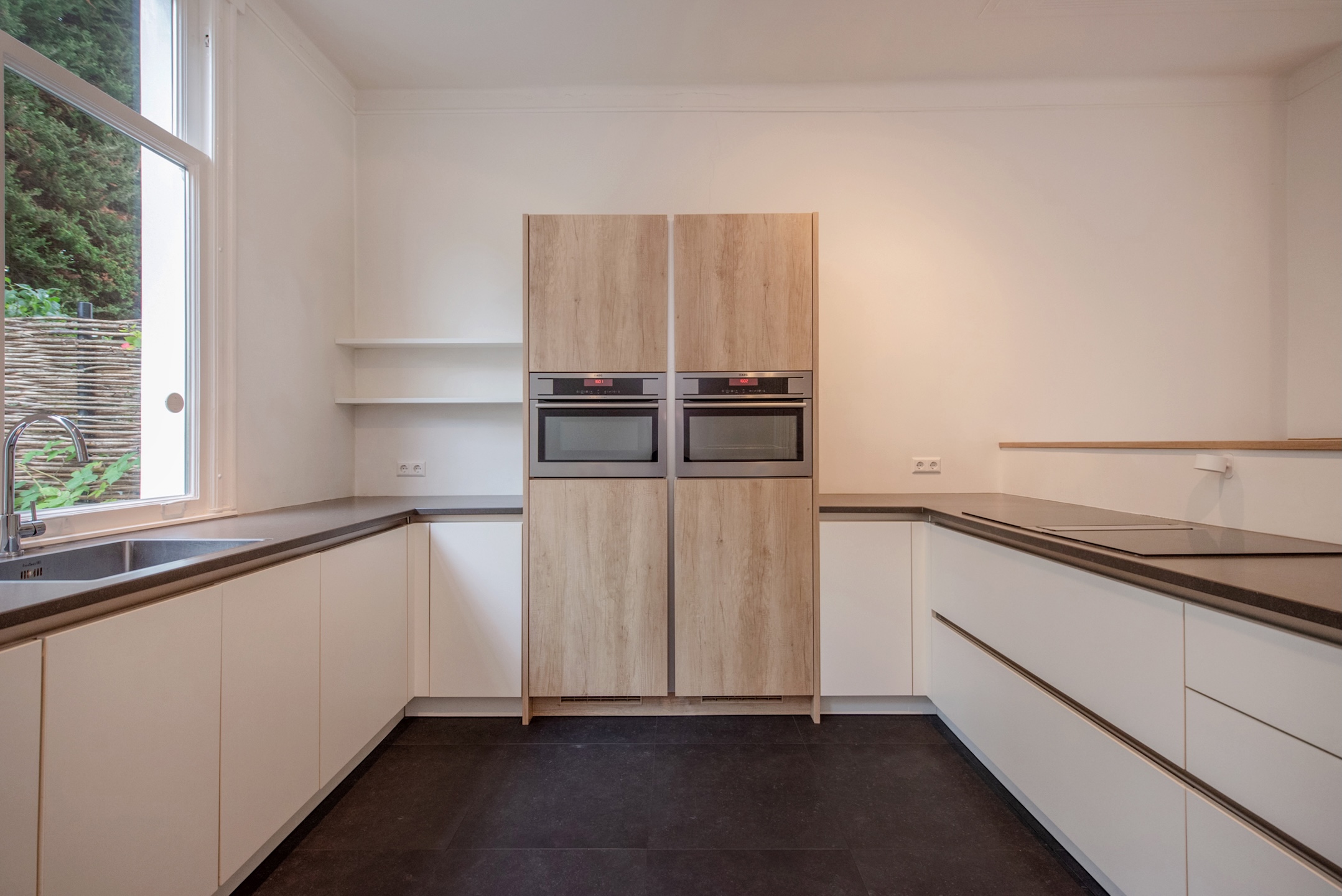 Aan de achterzijde van de woonkamer is een modern open keukeneiland in u-opstelling voorzien van een zwarte betegelde vloer met een witte kastenwand, en een donker aanrechtblad. De keuken heeft een brede inductie-kookplaat met geïntegreerde afzuiging, een hoge inbouw koelkast met een afgescheiden vrieskast, en een oven, magnetron en vaatwasser. Er is een deur naar een fijne achtertuin op het zuiden met voldoende privacy. De achtertuin is eventueel door te trekken naar de zij-tuin. Vanuit de tuin is een trapje naar de extra ruime kelders.