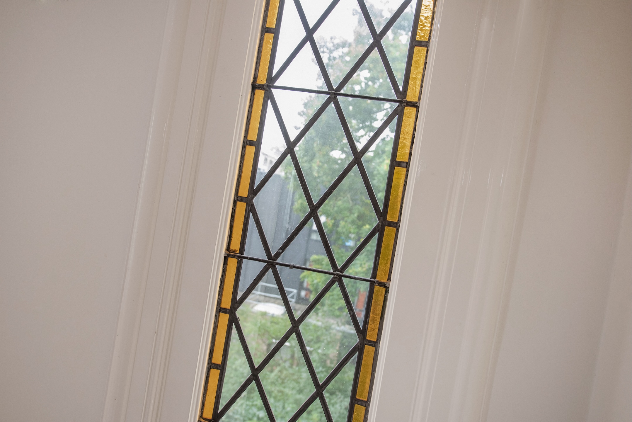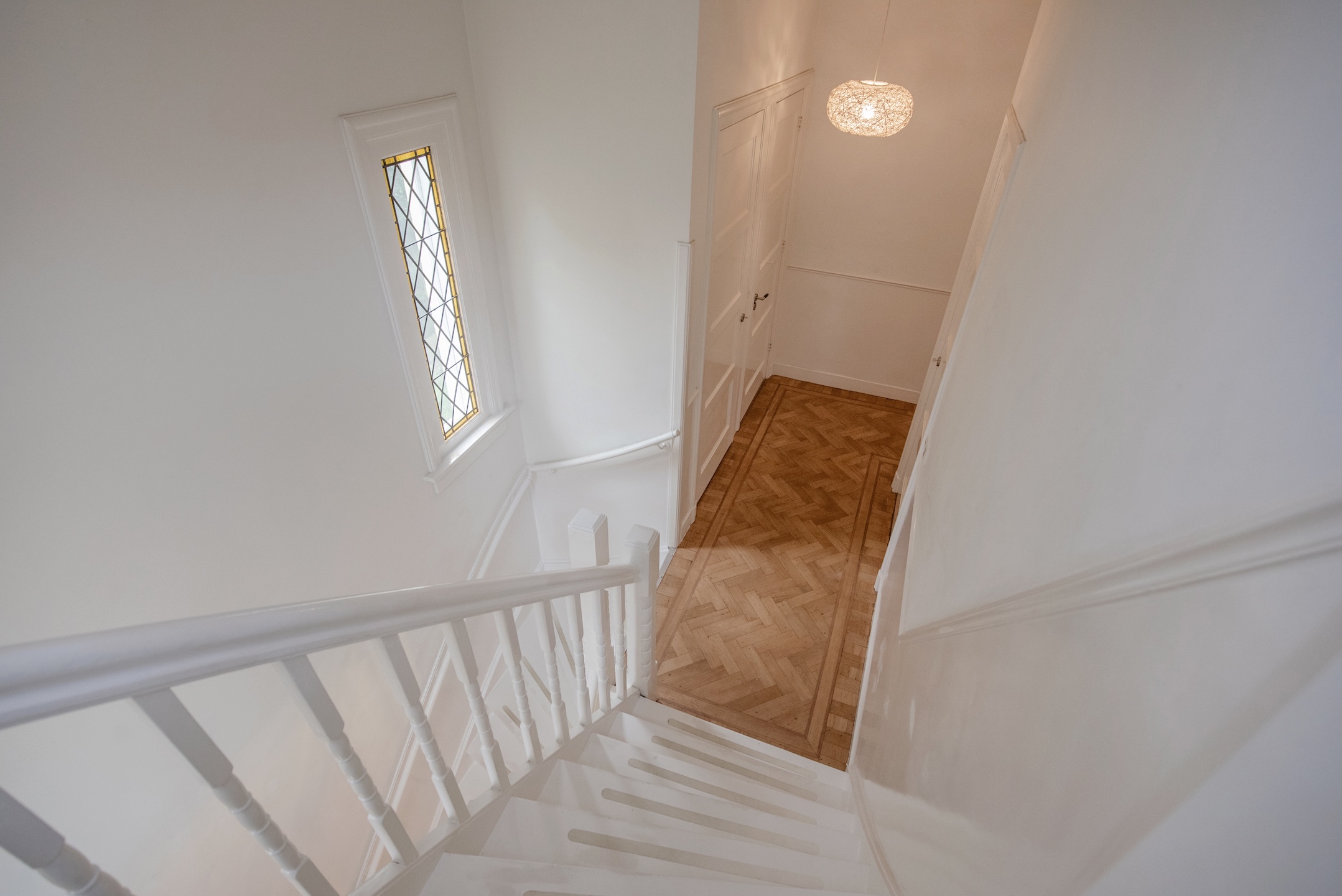 From the reception hall, there is access to a modern toilet and a separate door to the cellar. A beautifully detailed staircase with stained-glass windows leads to the upper floors.