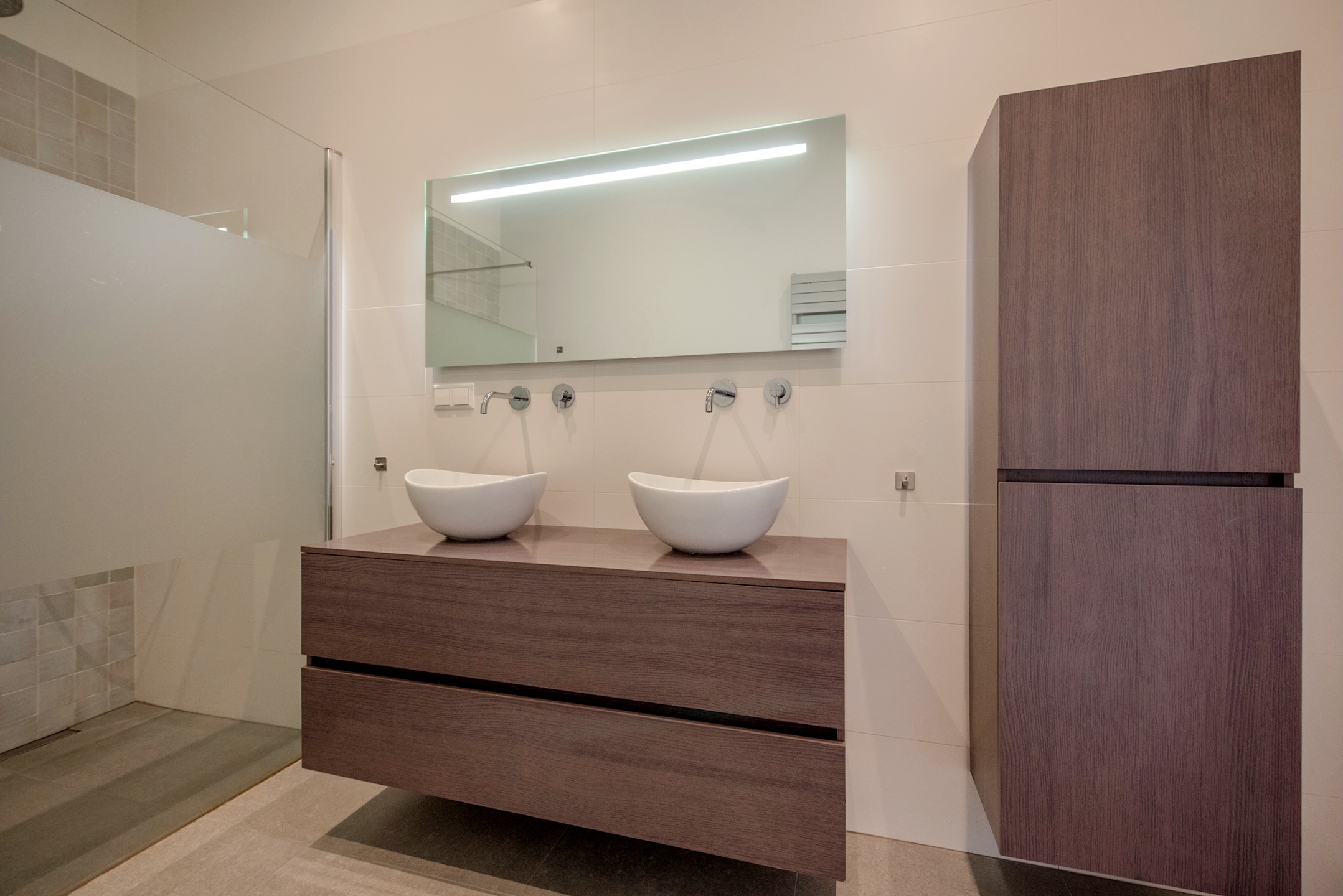 The modern family bathroom offers a light-grey tiled floor with underfloor heating, a large walk-in shower, double basins, and a wide mirror.