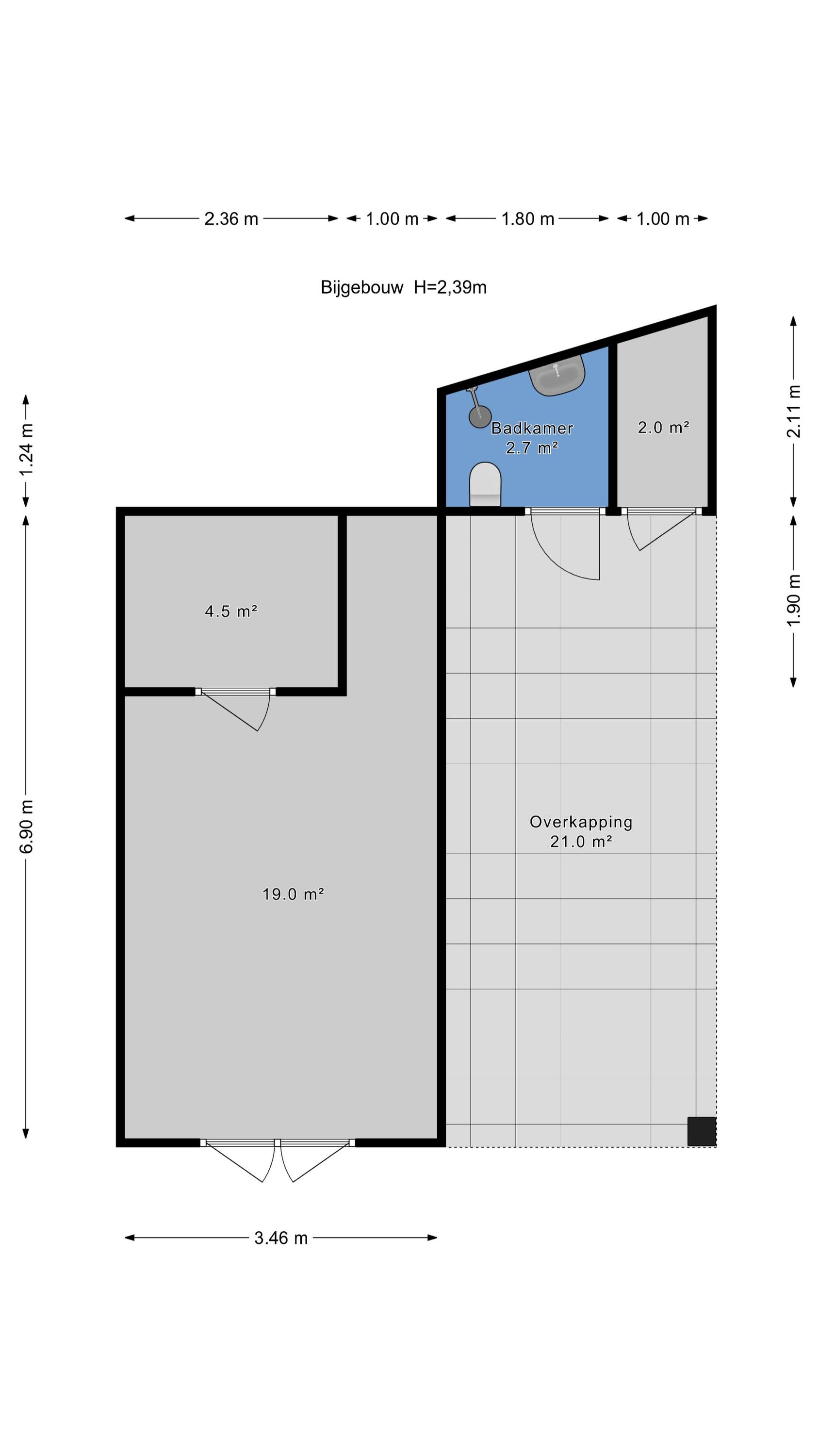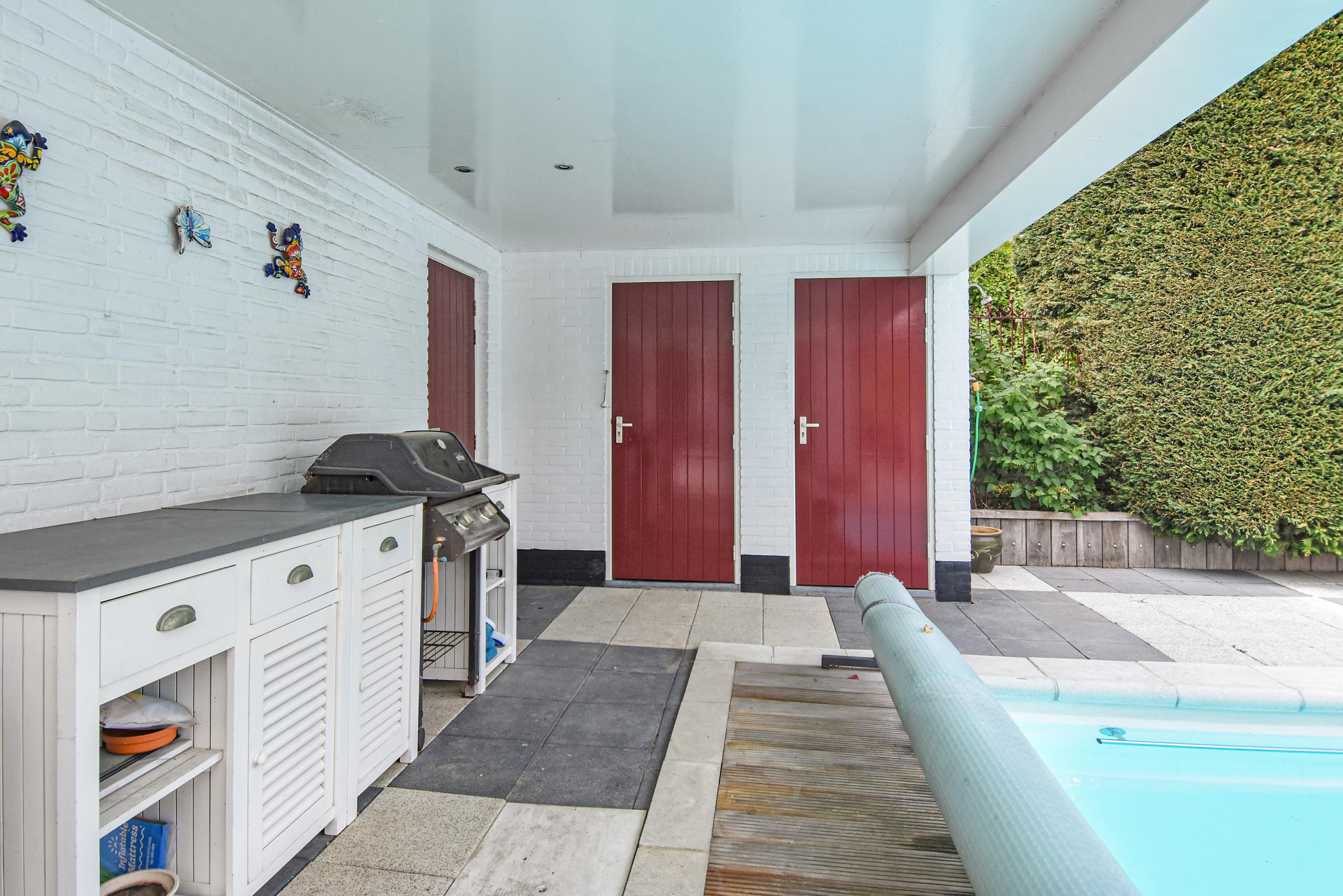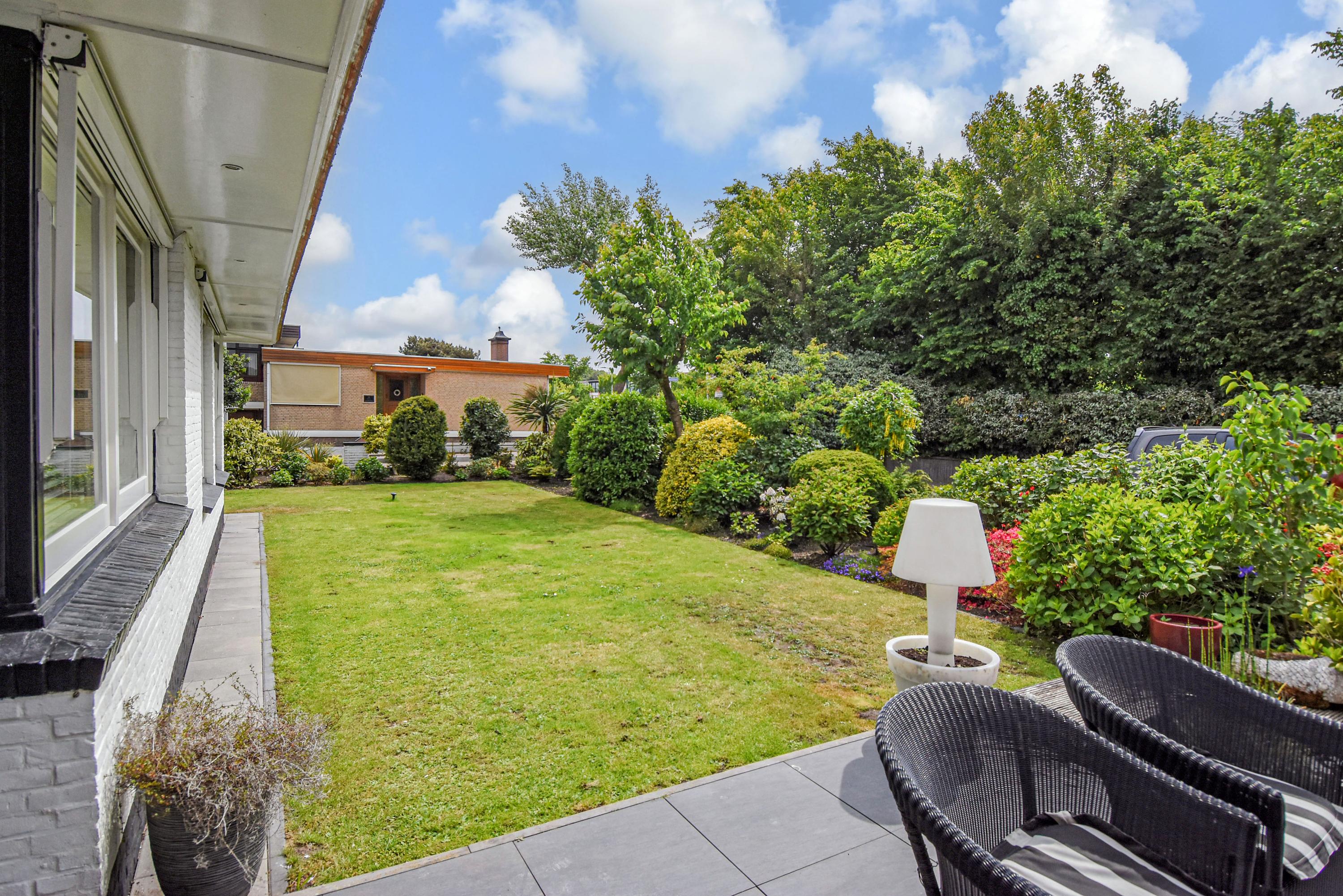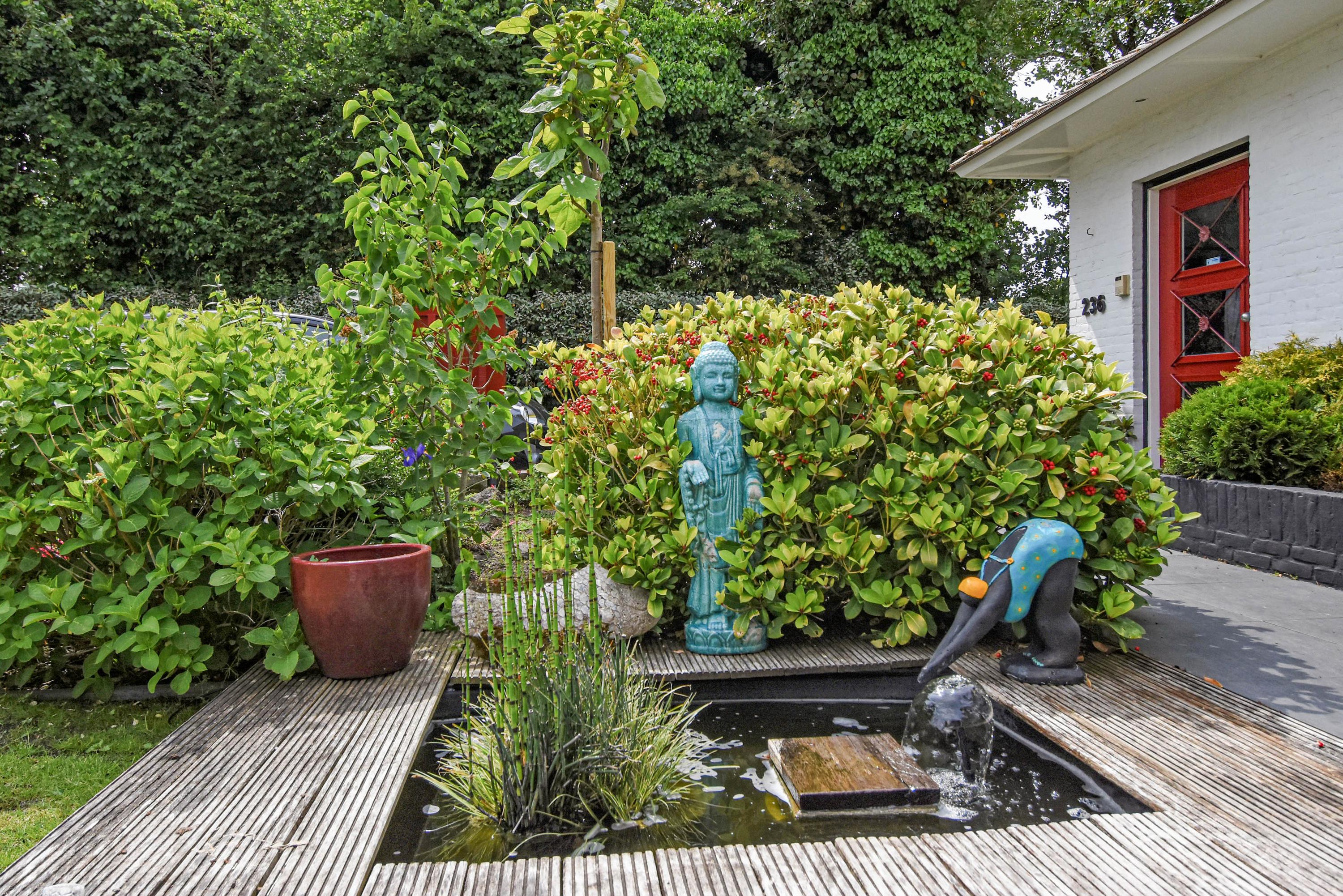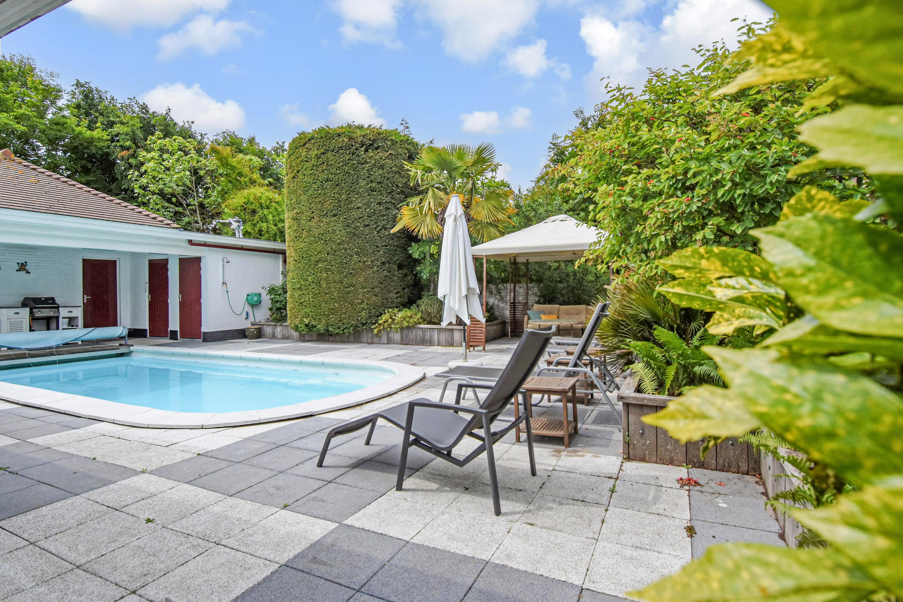 De buitenruimte is bijzonder royaal en veelzijdig. De voortuin is aangelegd met een gazon, een sierlijke vijver en een ruim terras dat ideaal is om te genieten van de ochtend- en middagzon. De zijtuin biedt een zeer groot terras dat gunstig is gelegen voor middag- en avondzon, perfect voor lange zomerse diners en ontspanning in de zon. De achtertuin is fraai aangelegd met meerdere terrassen, een zwembad en een overdekt zitgedeelte. Achter in de tuin bevindt zich een multifunctioneel bijgebouw, de voormalige garage, die dienst kan doen als gastenverblijf of berging, en beschikt over een eigen badkamer met douche, toilet en wastafel.
