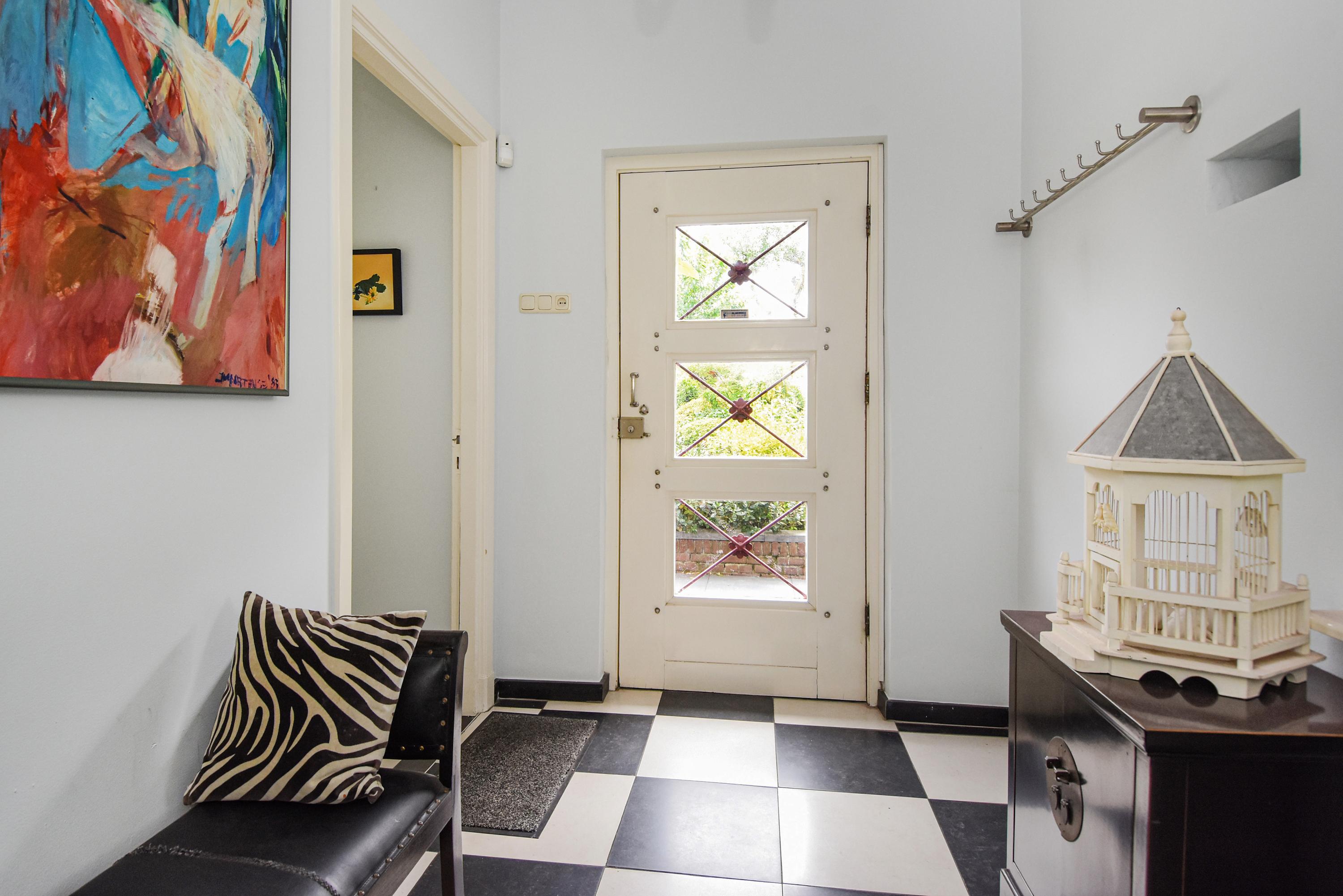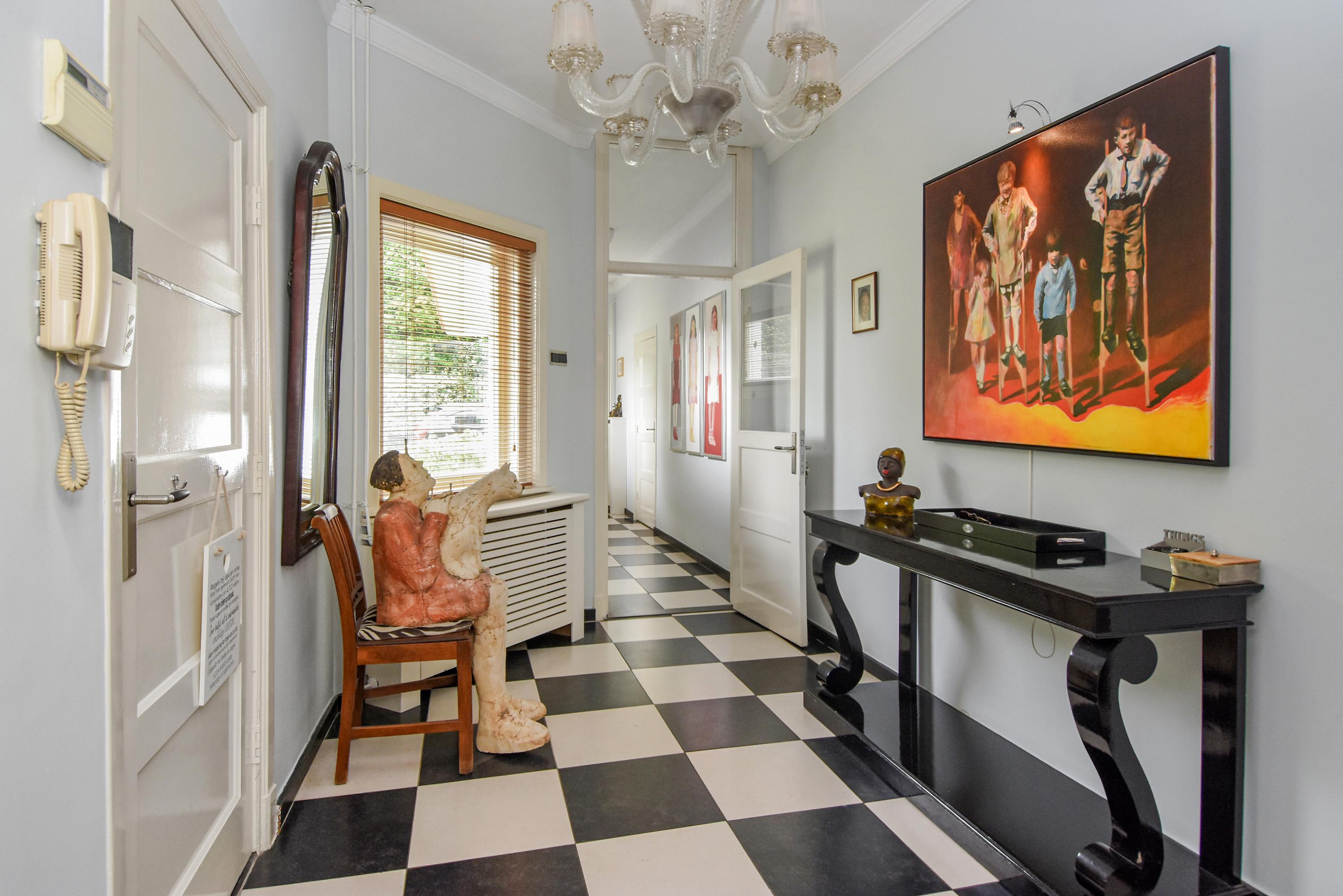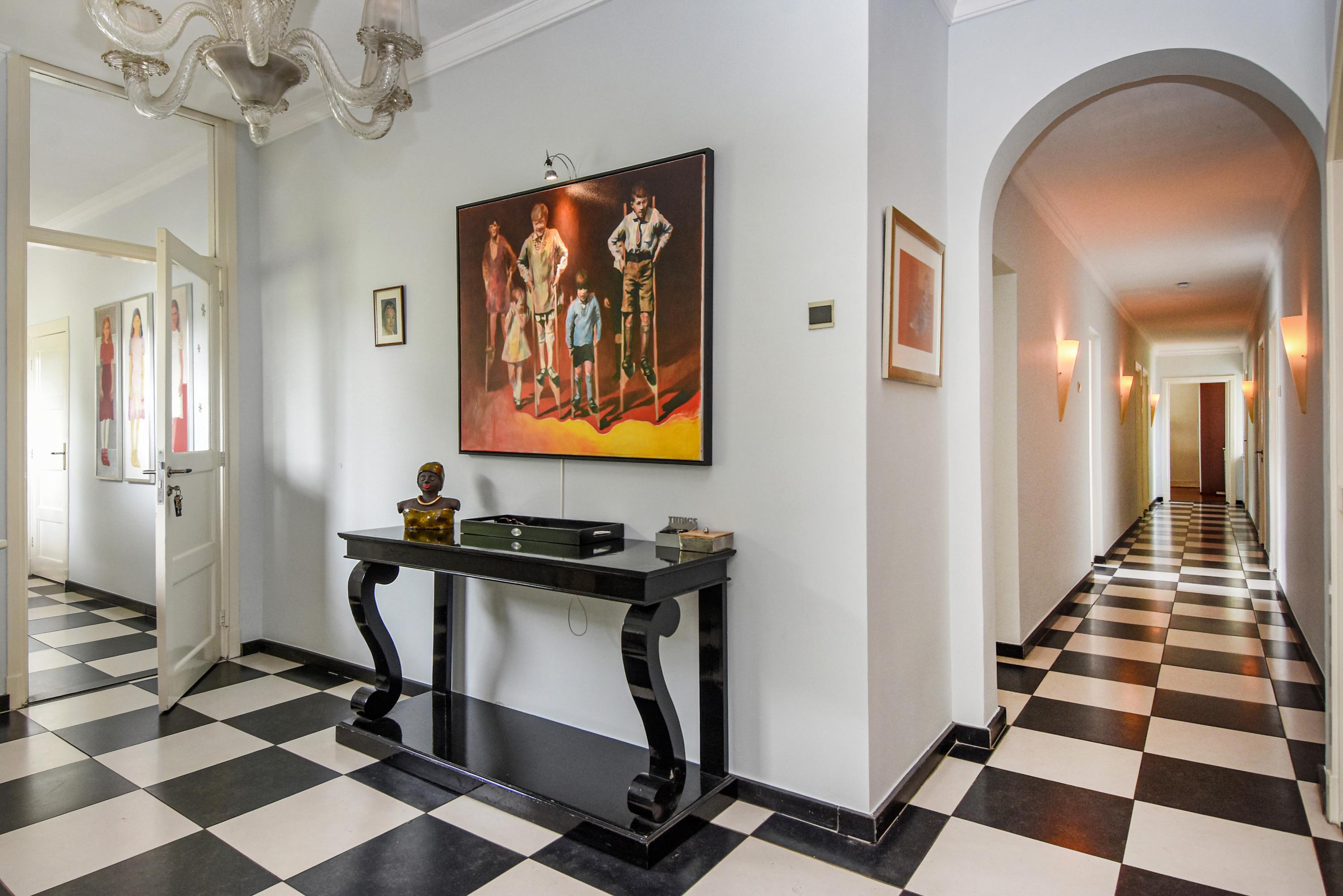 Begane grond: Binnenkomst via een charmante vestibule met zwart-witte tegels leidt naar een ruim toilet met marmeren wandtegels en verder naar de centrale hal.