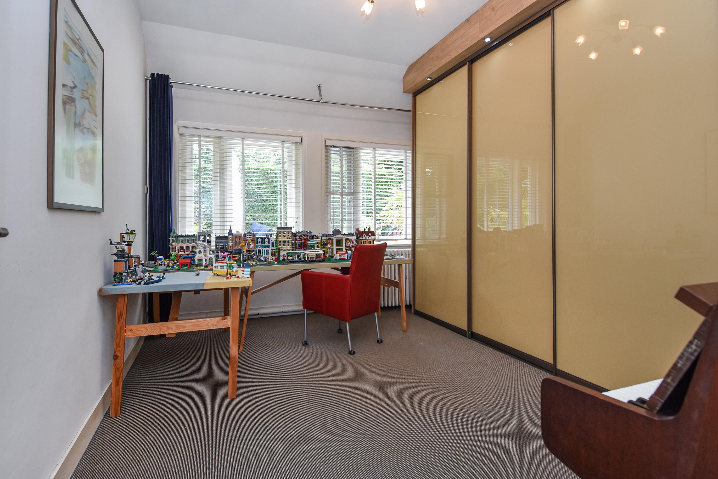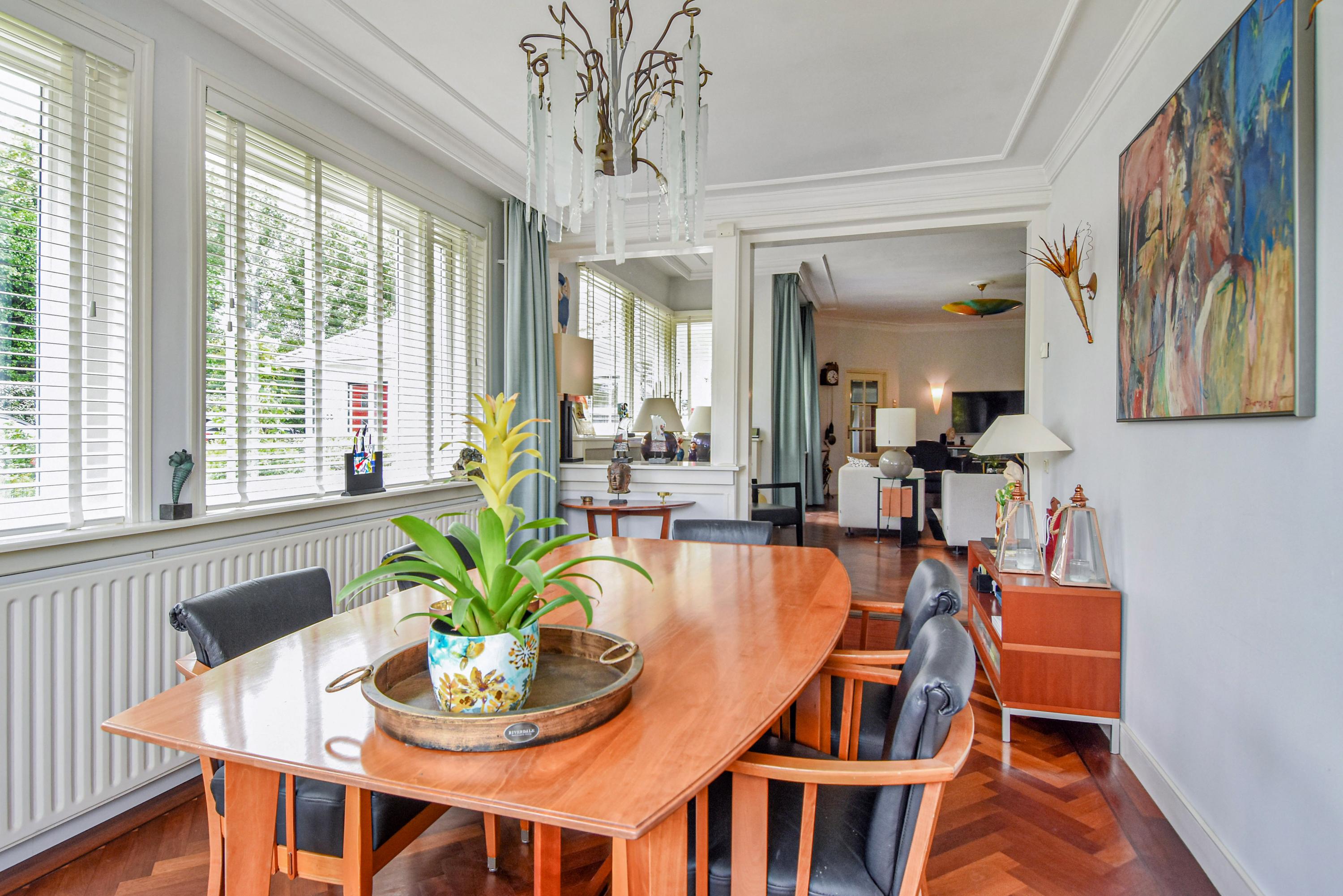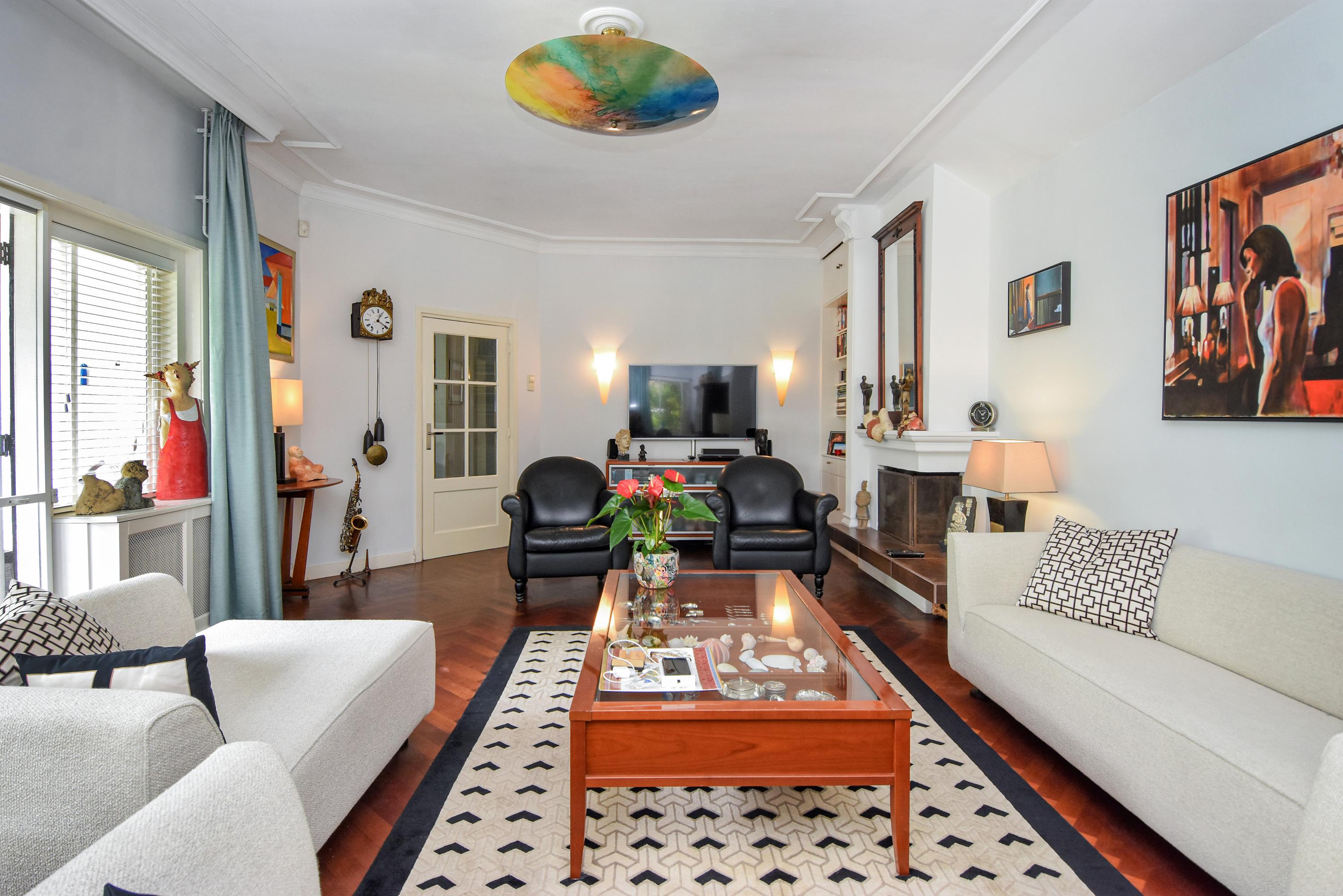 Aan de voorzijde bevindt zich een lichte studeerkamer/ slaapkamer. De woonkamer is voorzien van een klassiek visgraatparket, een open haard en openslaande deuren naar de zijtuin met terras. De eetkamer aan de voorzijde beschikt eveneens over visgraatparket en openslaande deuren naar de voortuin.