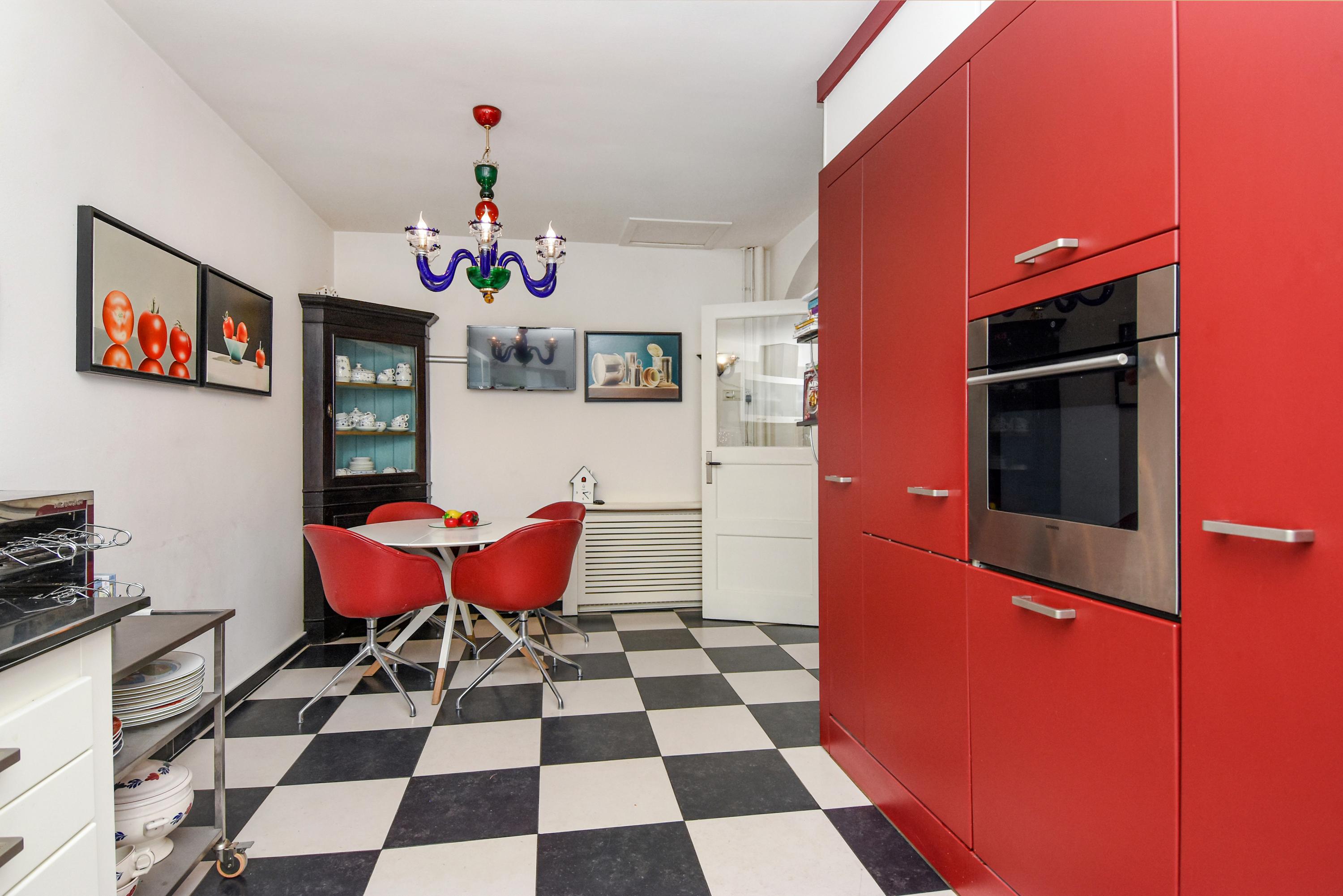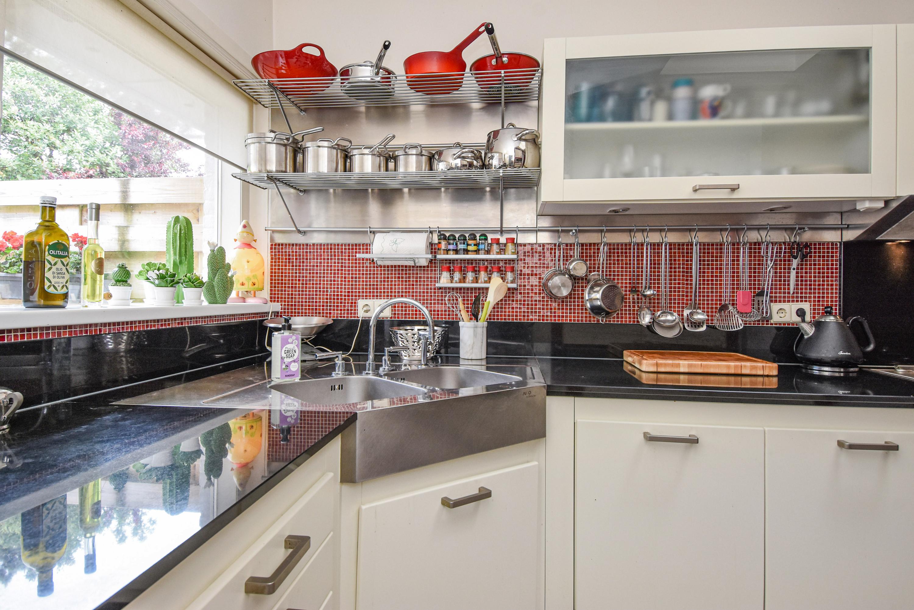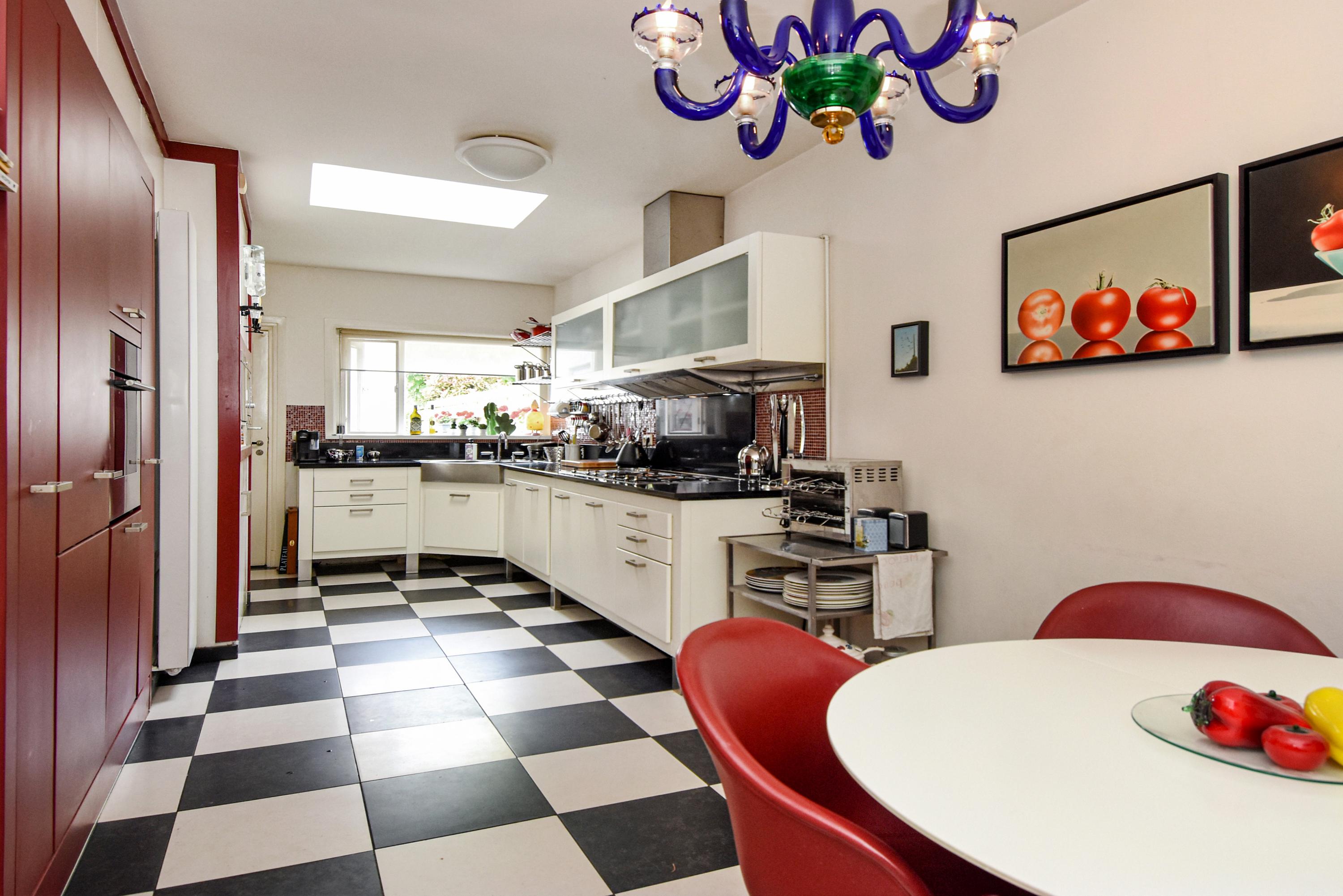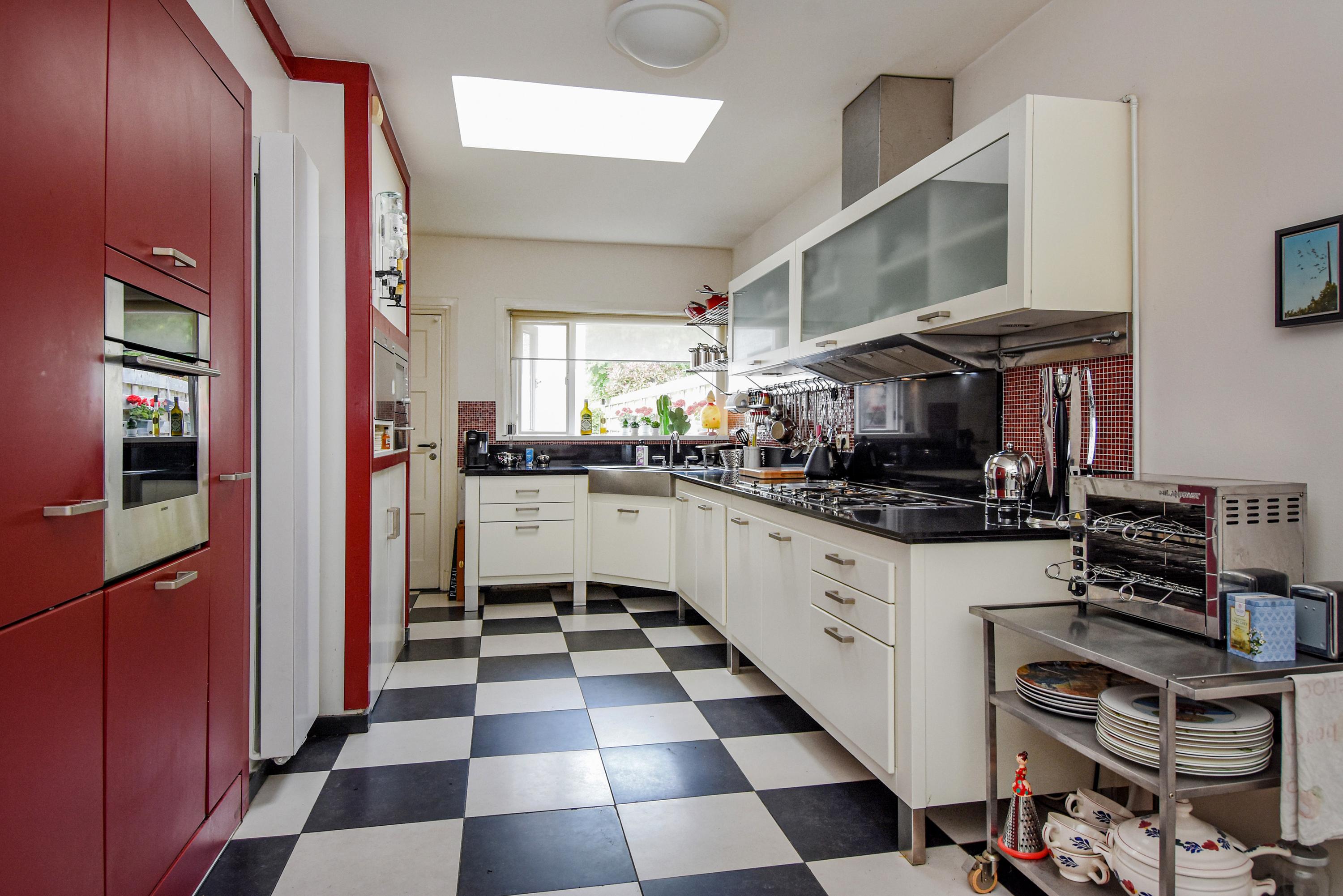 De ruime keuken is uitgerust met een dakraam, zwart-witte vloertegels, vaste kasten en diverse inbouwapparatuur, waaronder een oven, koelkast, vriezer en een aparte kast met de CV-ketel. Het stenen aanrecht beschikt over vijf gaspitten en een kookplaat, met een brede afzuigkap erboven.