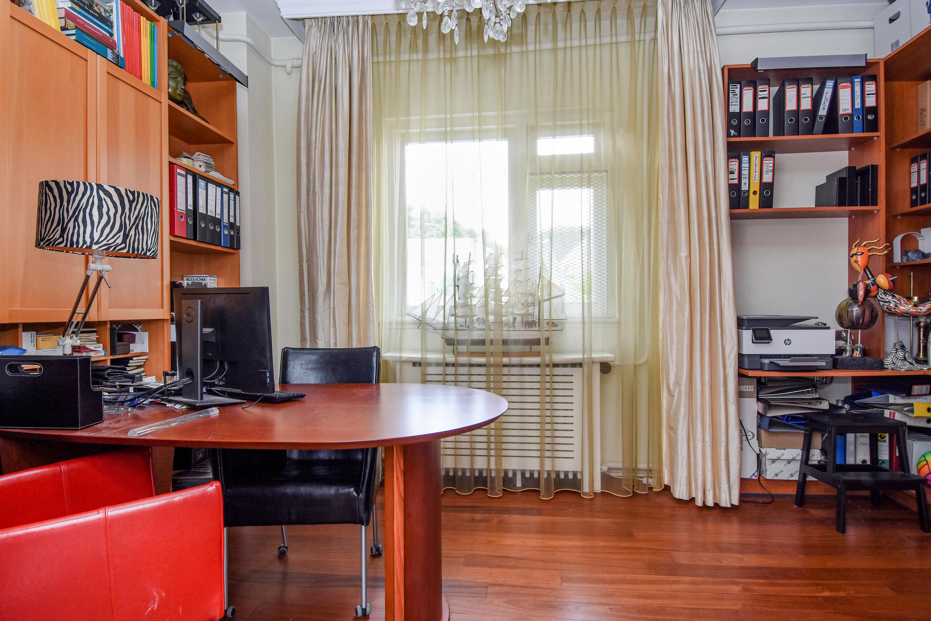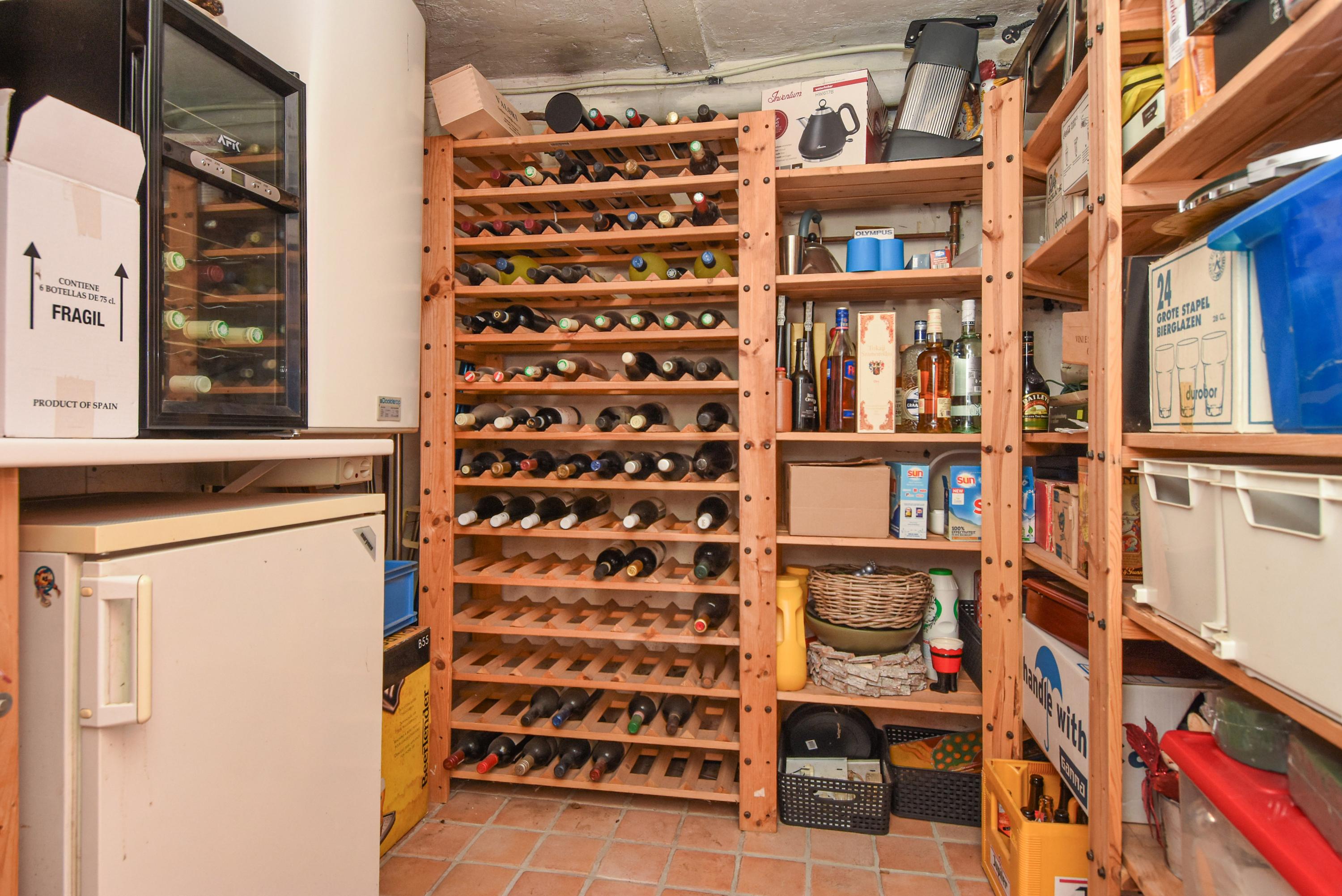 Een gang leidt naar de slaapkamers, met werkkamer met doorgang met dubbele deuren naar de achtertuin. De eerste badkamer beschikt over een voorportaal met vaste kasten met elektrische boiler, een inloopdouche, een breed wastafelmeubel en een toilet. De tweede badkamer beschikt over een douche, wastafel en een toilet. In de kelder bevinden zich de wasmachineaansluiting, een wijnkelder met houten rekken en een elektrische boiler.