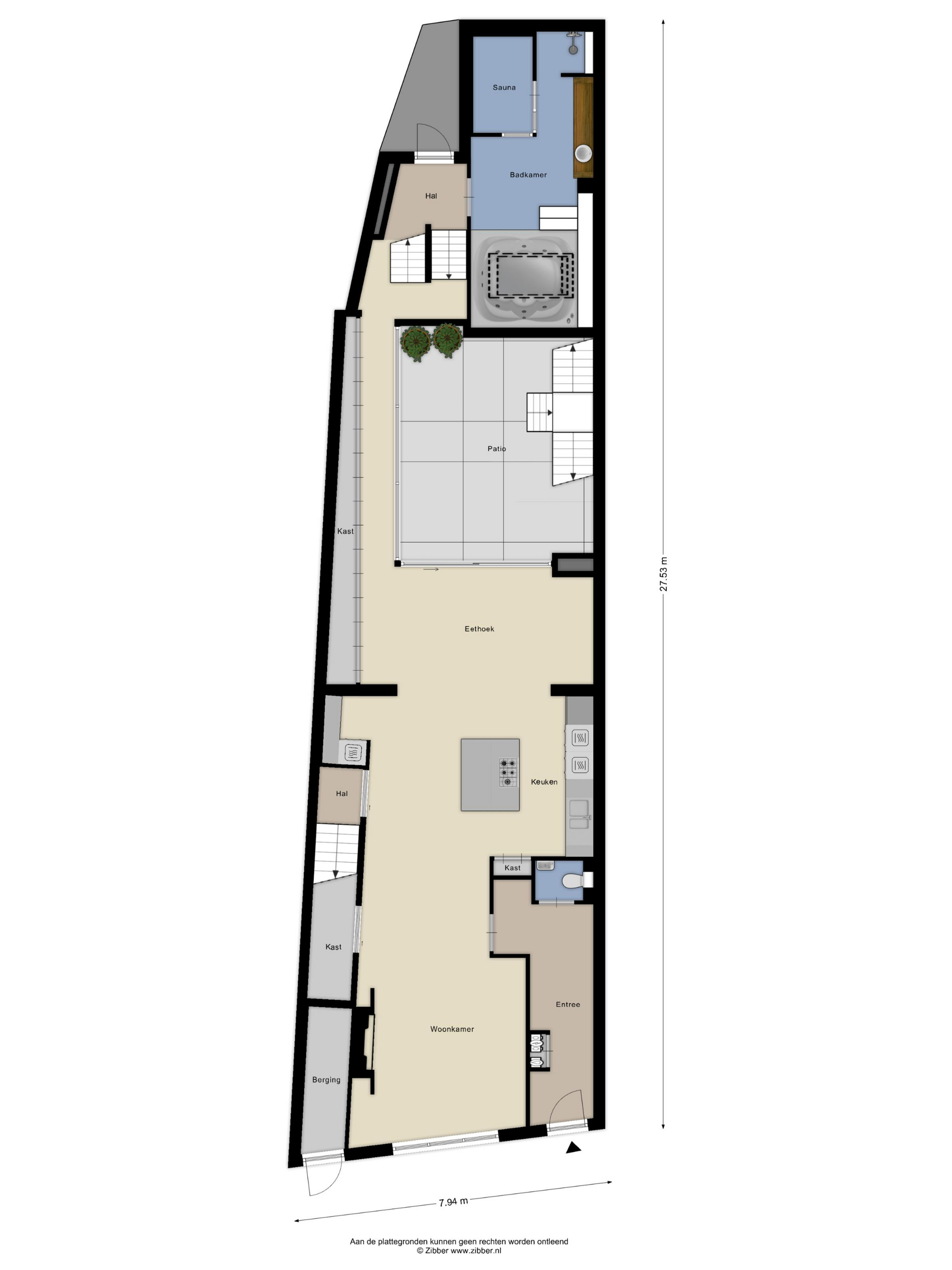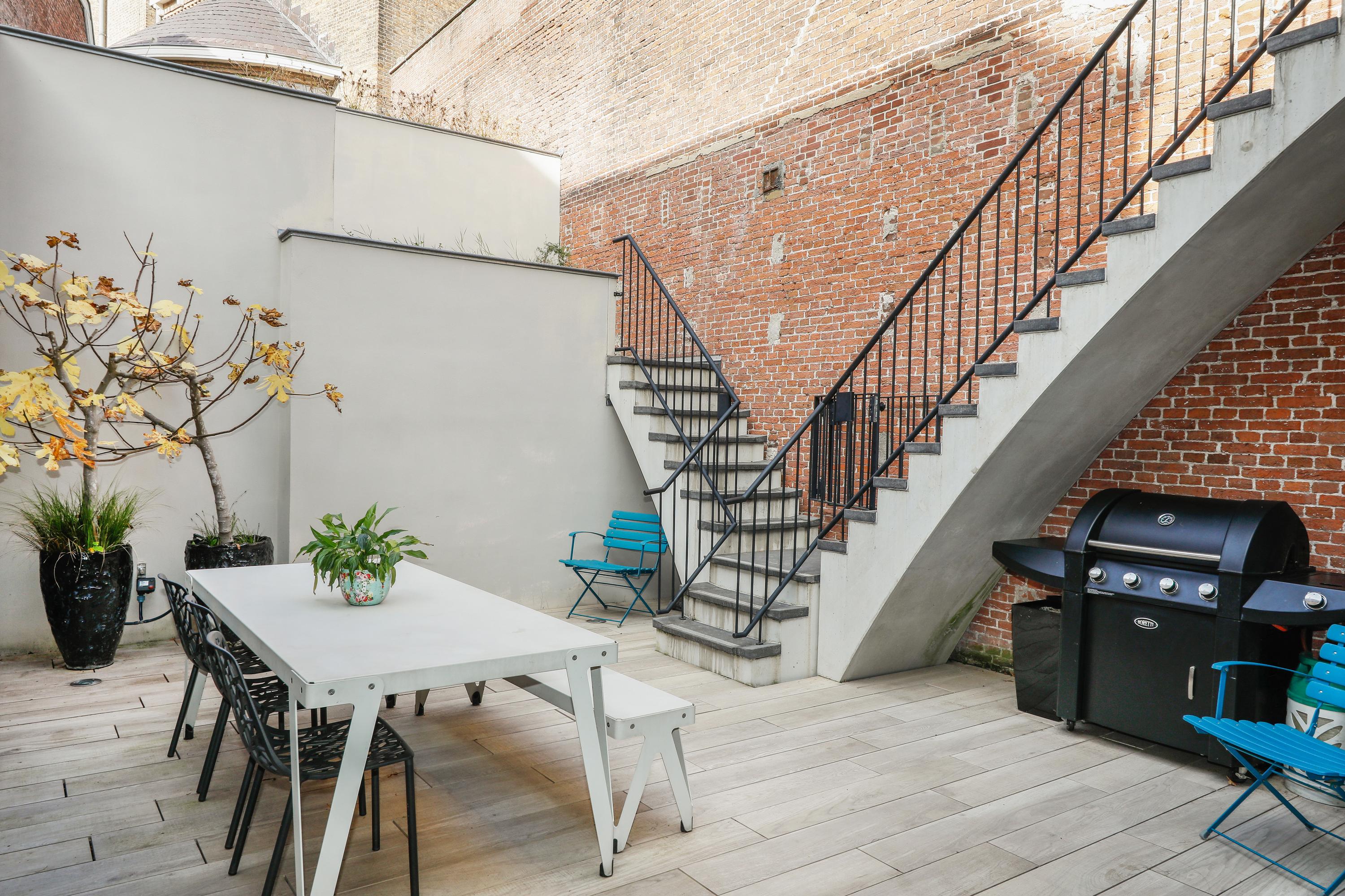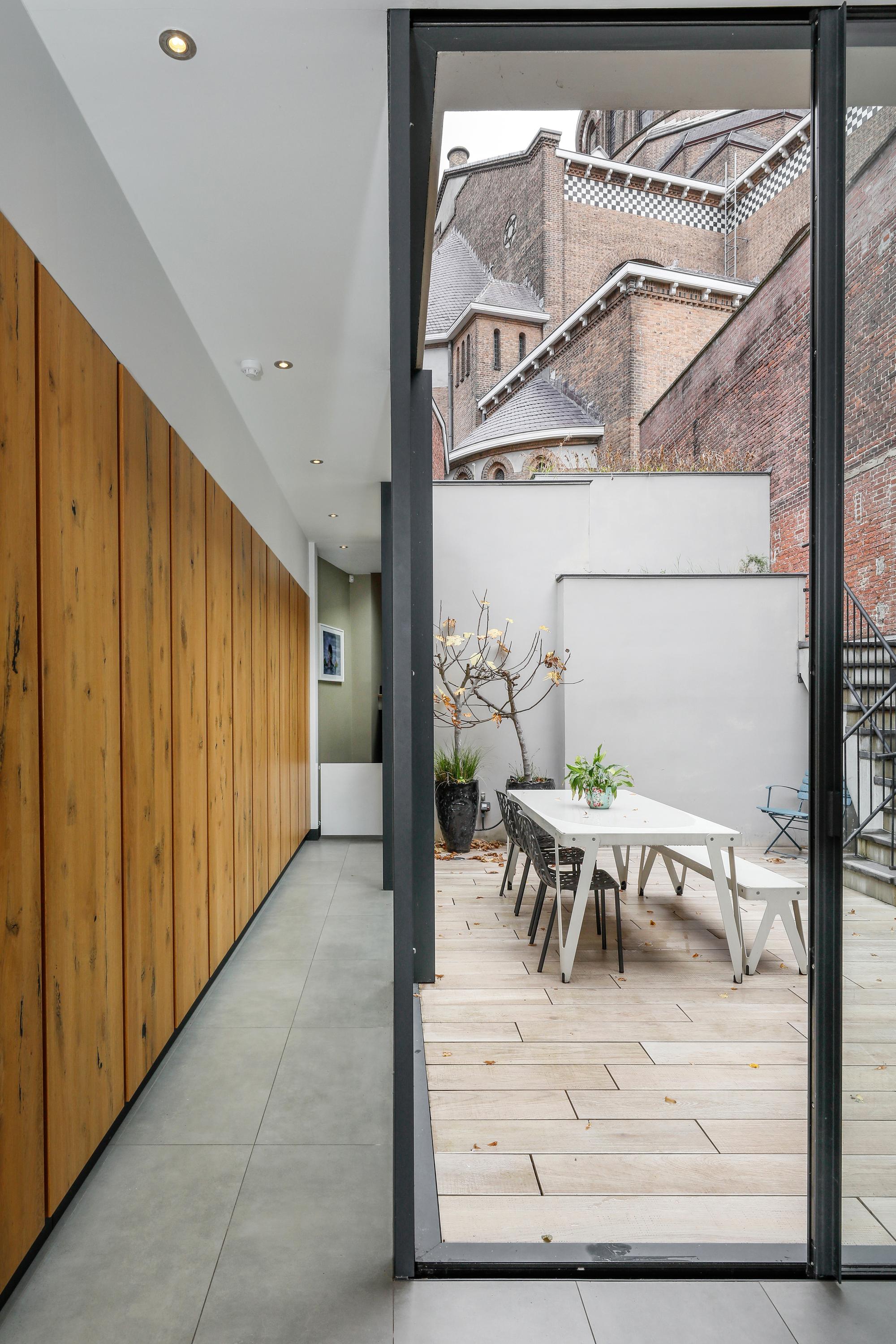 Natuurlijk kent iedereen de voorkant van de St.-Jacobskerk wel. Maar toch zal je bezoek verrast zijn door de kijk die je er van deze kant op hebt. Een verrassende kijk had de architect op dit plan. Door een enorme transparante wand te plaatsen is binnen buiten geworden en vice versa. De wand is vanuit de hoek naar twee kanten weg te schuiven. Het is overdag een heerlijk lichte plek voor een gezellige eettafel en ’s avonds eten met dit bijzondere uitzicht. De lange kastenwand maakt wederom je huis heel praktisch en smaakvol. Ook aan de hoeveelheid buitenruimte biedt deze woning meer dan gebruikelijk in de binnenstad. Naast een flinke binnentuin zijn er twee dakterrasjes. Zelf kiezen dus voor zon, schaduw, boek lezen, samen nog een wijntje of lekker buiten dineren.
