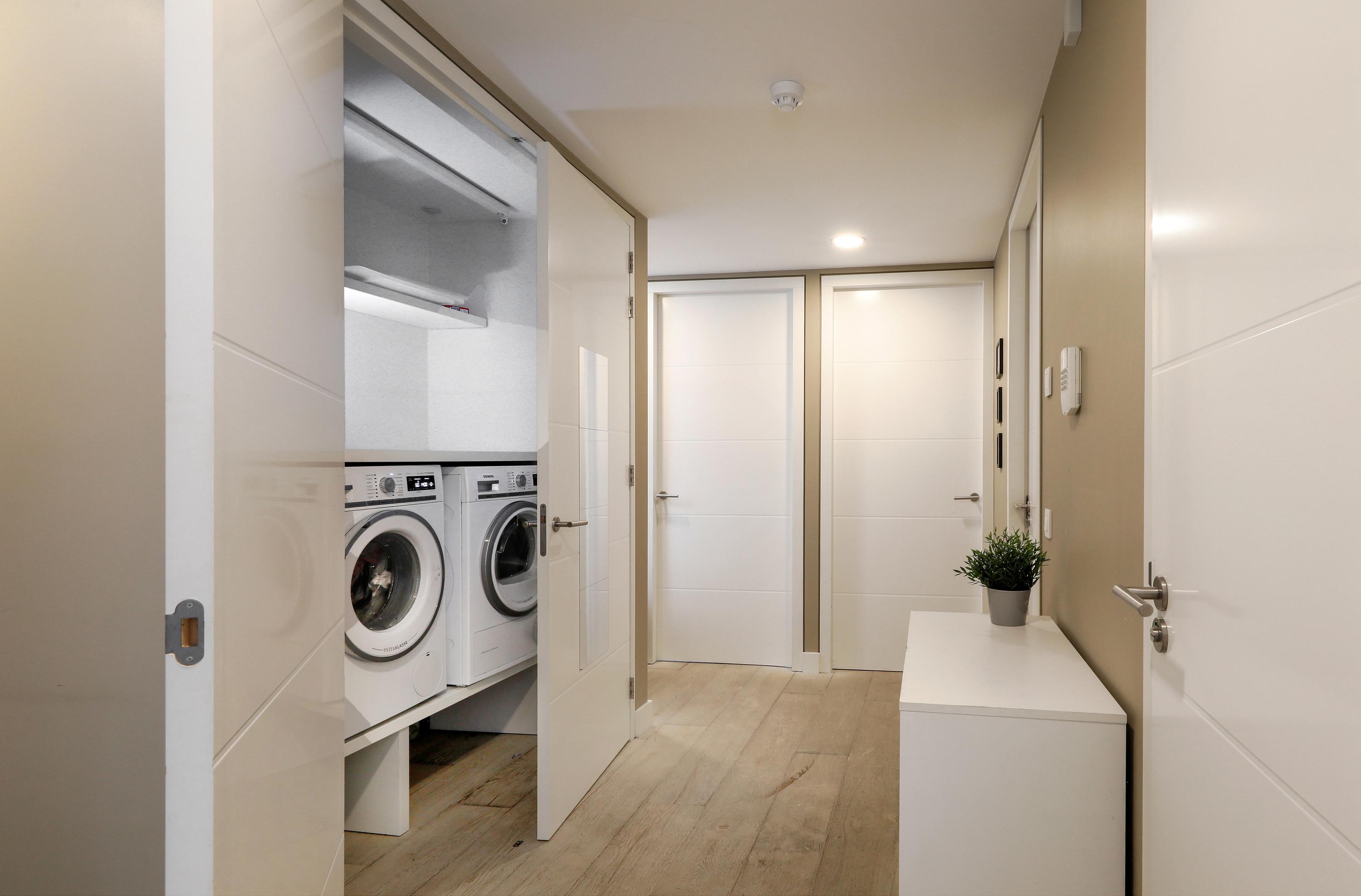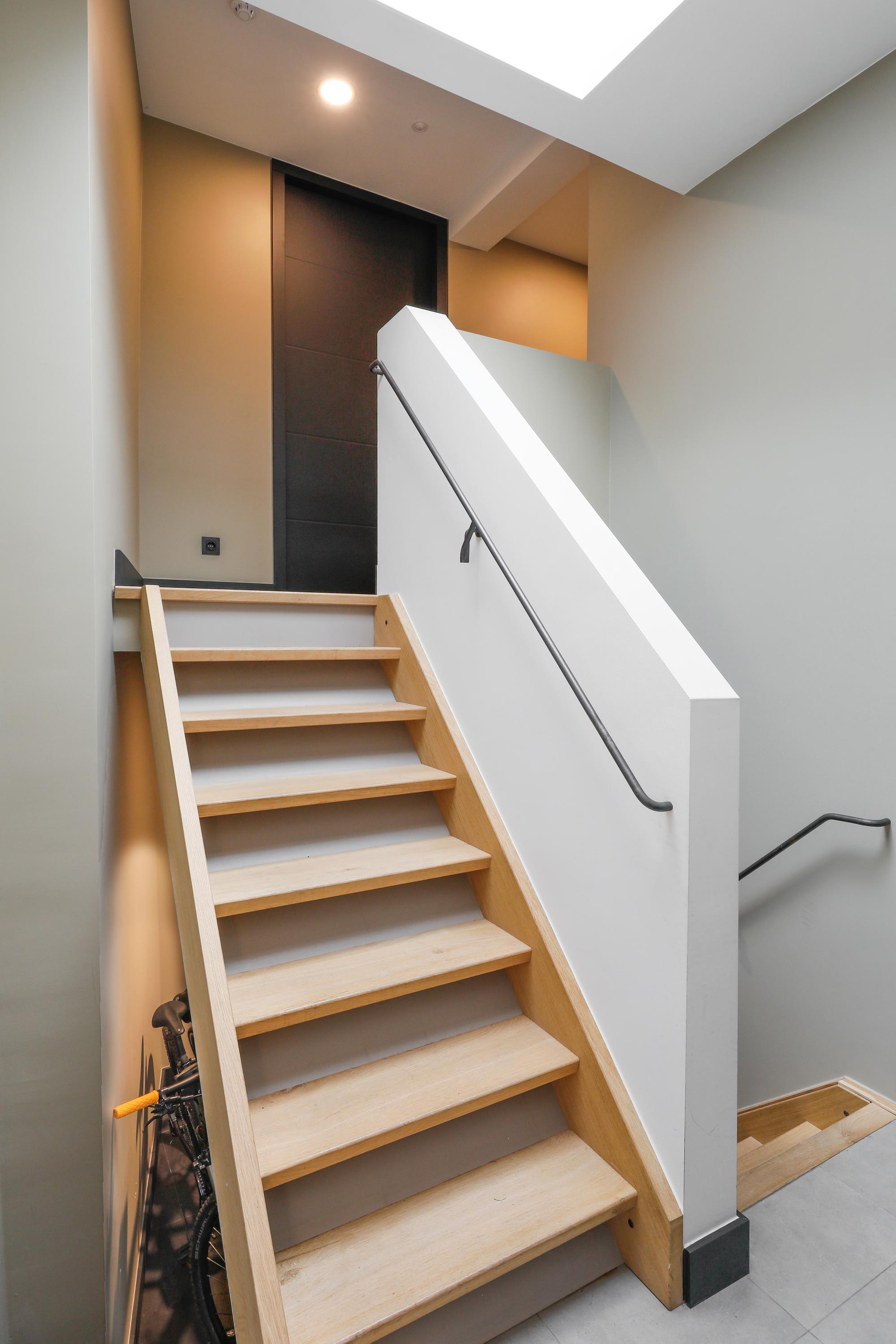 Ooit waren dit een boven- en benedenwoning. Door de samenvoeging kon er een trap verwijderd worden. De huidige trap is mooi weggewerkt achter een schuifdeur. Aan de trapleuning herkennen wij deze architect. Maar ook in het lijnenspel bij deze trap en de lichtlijn tussen muur en het schuin vlak. Op de ruime overloop zijn de was-apparaten in een kast weggewerkt.