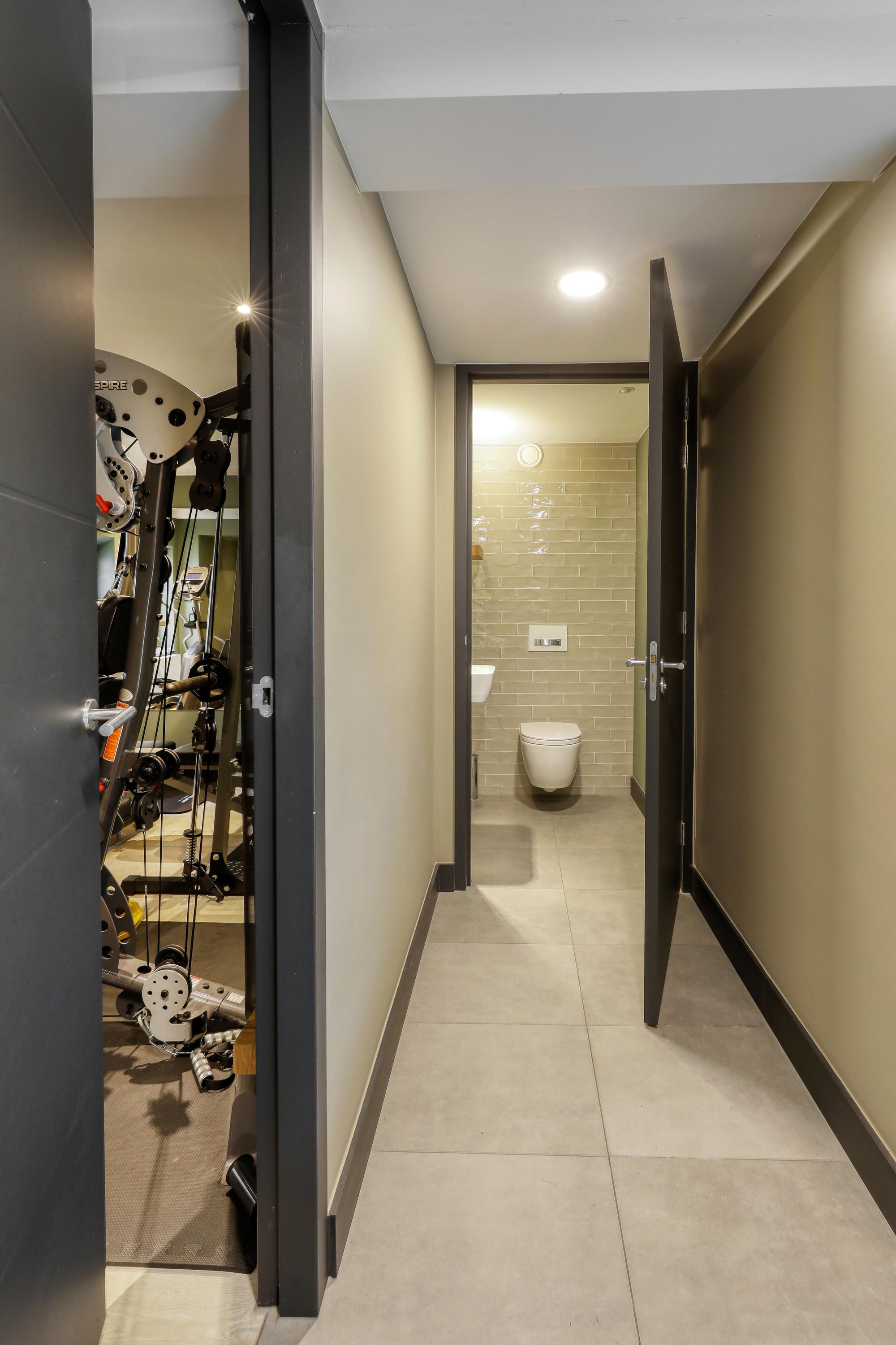 In het achterhuis vind je op de eerste verdieping een flinke kamer die geschikt is voor heel veel. Nu is deze in gebruik als gym. Hieronder liggen de technische ruimte voor de spa. Er is een sauna met, wederom, een grote glazen wand. De kachel staat vrij in de ruimte en er zijn ligbanken voor drie personen. De (dompel)douche vind je achterin. Misschien wel nóg mooier is de jacuzzi voor ca. vier personen. Op een verhoging en onder de sterrenhemel achter een glazen dak is dit toch wel optimaal relaxen, en dat gewoon thuis.