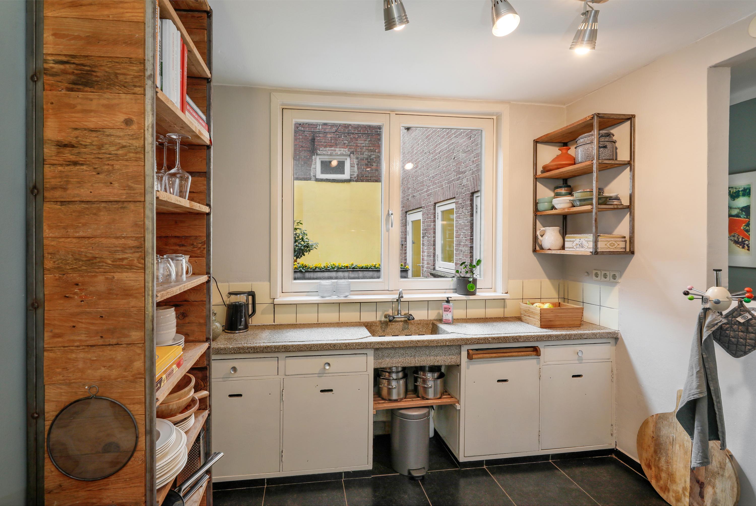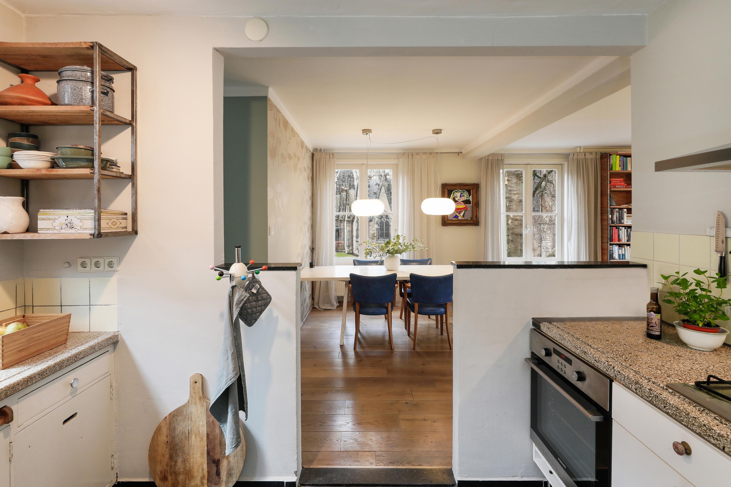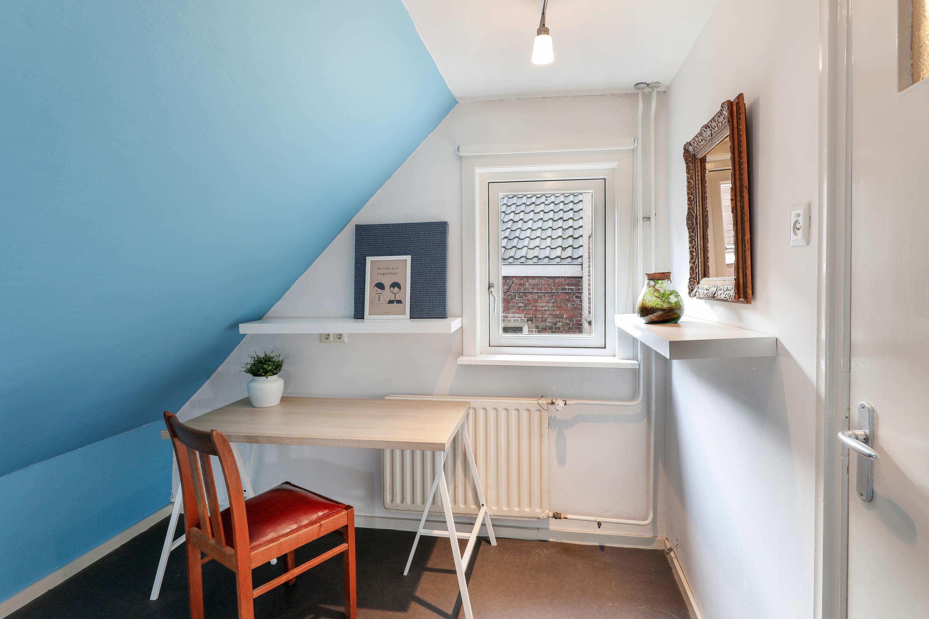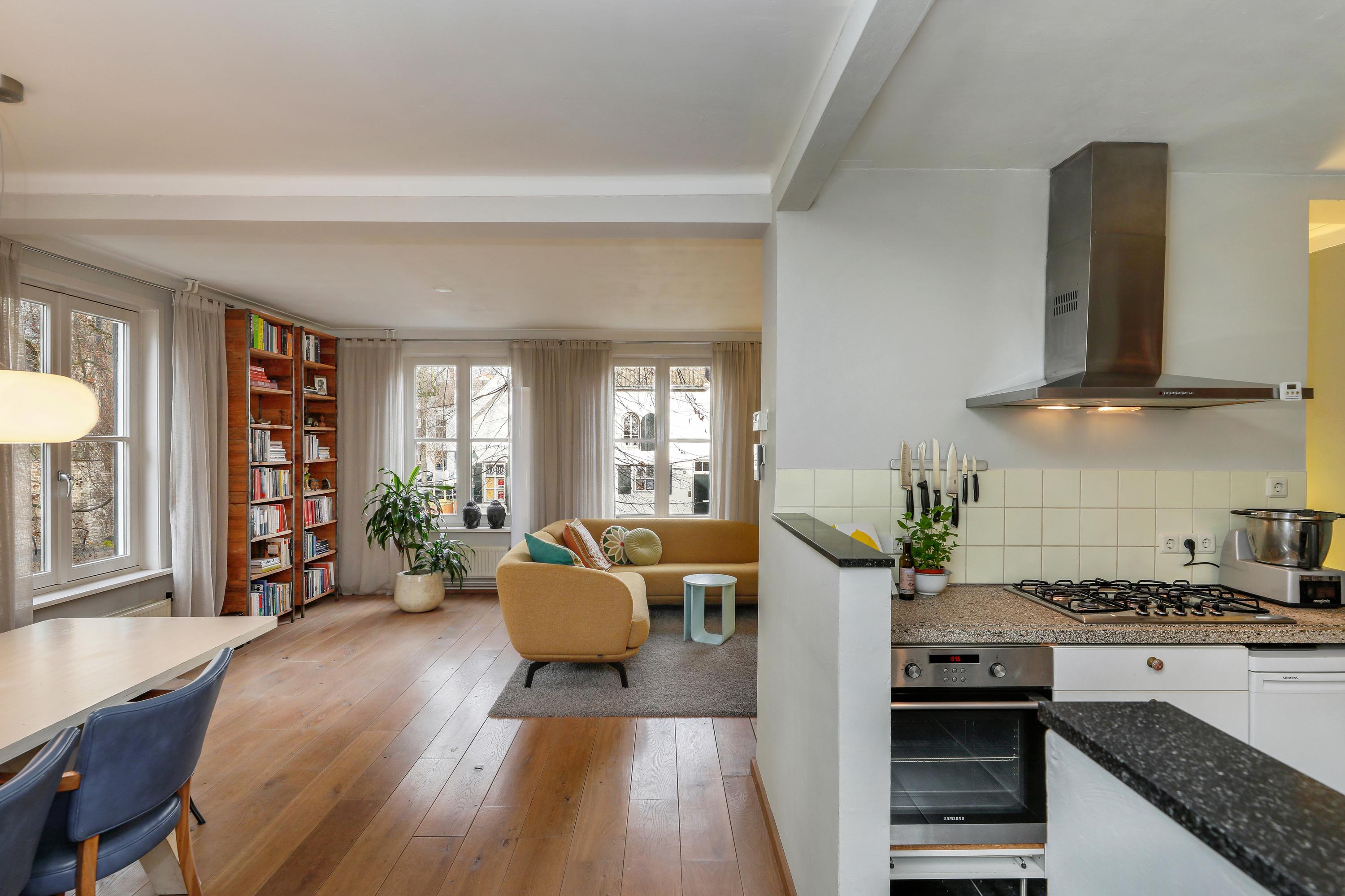 De woonkamer ligt op de hoek en heeft daardoor een mooi uitzicht op de Sint-Jan én het pleintje ernaast. De semi-open keuken is verbonden zonder dat je het gevoel hebt in de kamer te staan koken. Daarnaast bevindt zich op deze verdieping, naast het dakterras, ook een extra kamer, ideaal als werk- of logeerkamer.