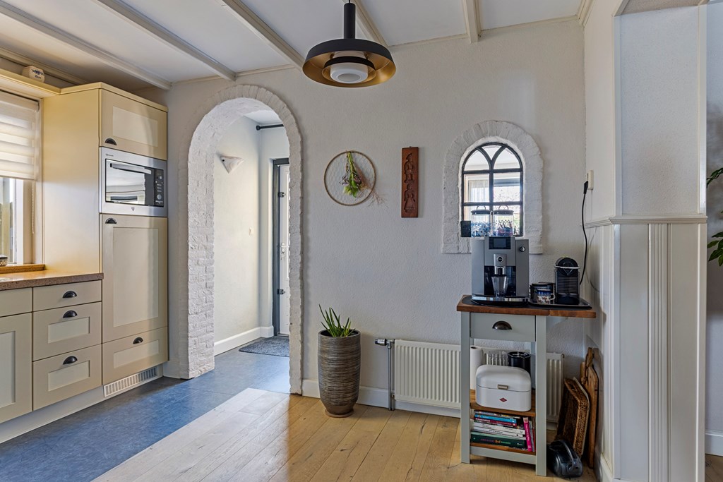 De keuken grenst aan beide woonkamers. Deze is goed onderhouden, beschikt over een langwerpig aanrechtblad en heeft allerhande inbouwapparatuur. Hoewel de keuken instapklaar is, kan deze ook naar eigen inzicht gemoderniseerd worden.