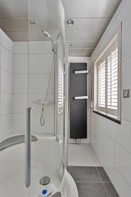 De badkamer grenst aan de hal is volledig betegeld en goed onderhouden. De moderne badkamer beschikt over een ligbad met douche, een dubbele wastafel en opbergmeubel.