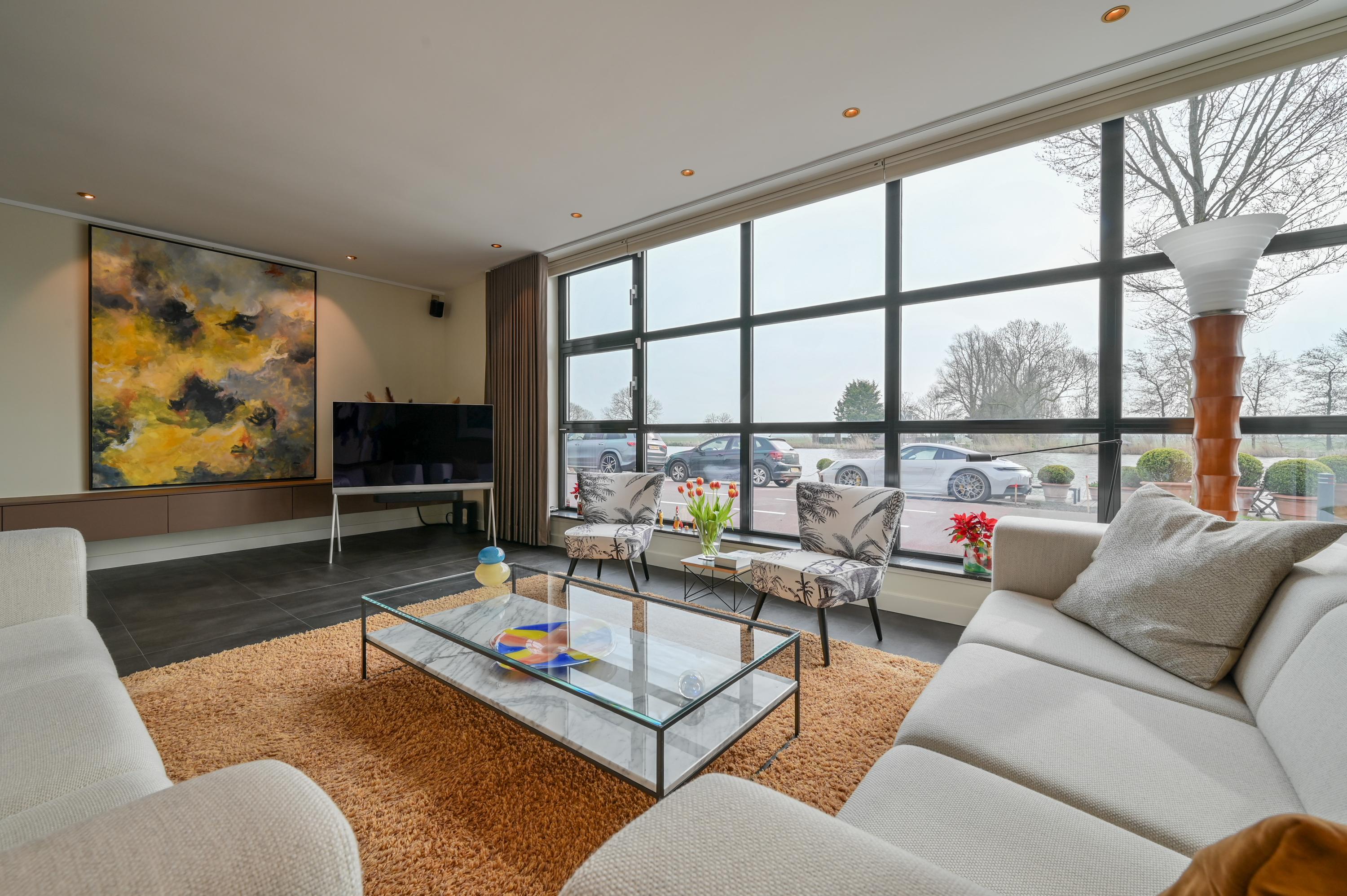 Via de oprit bereikt u de voordeur en de ruime hal, voorzien van garderobekast, toilet en trap naar de verdieping. De woonkamer ligt aan de voorzijde van de woning en biedt een adembenemend uitzicht over de Amstel. Grote raampartijen laten het licht binnenstromen, terwijl het gemotoriseerde gordijn via een app te bedienen is. Tevens hangen hier ook Luxaflex Silhouttes (gemotoriseerd, met stand geheugen). De stijlvolle zwarte plavuizenvloer met vloerverwarming, ingebouwde dimbare spots van Modular en de grote designkasten maken het geheel af.