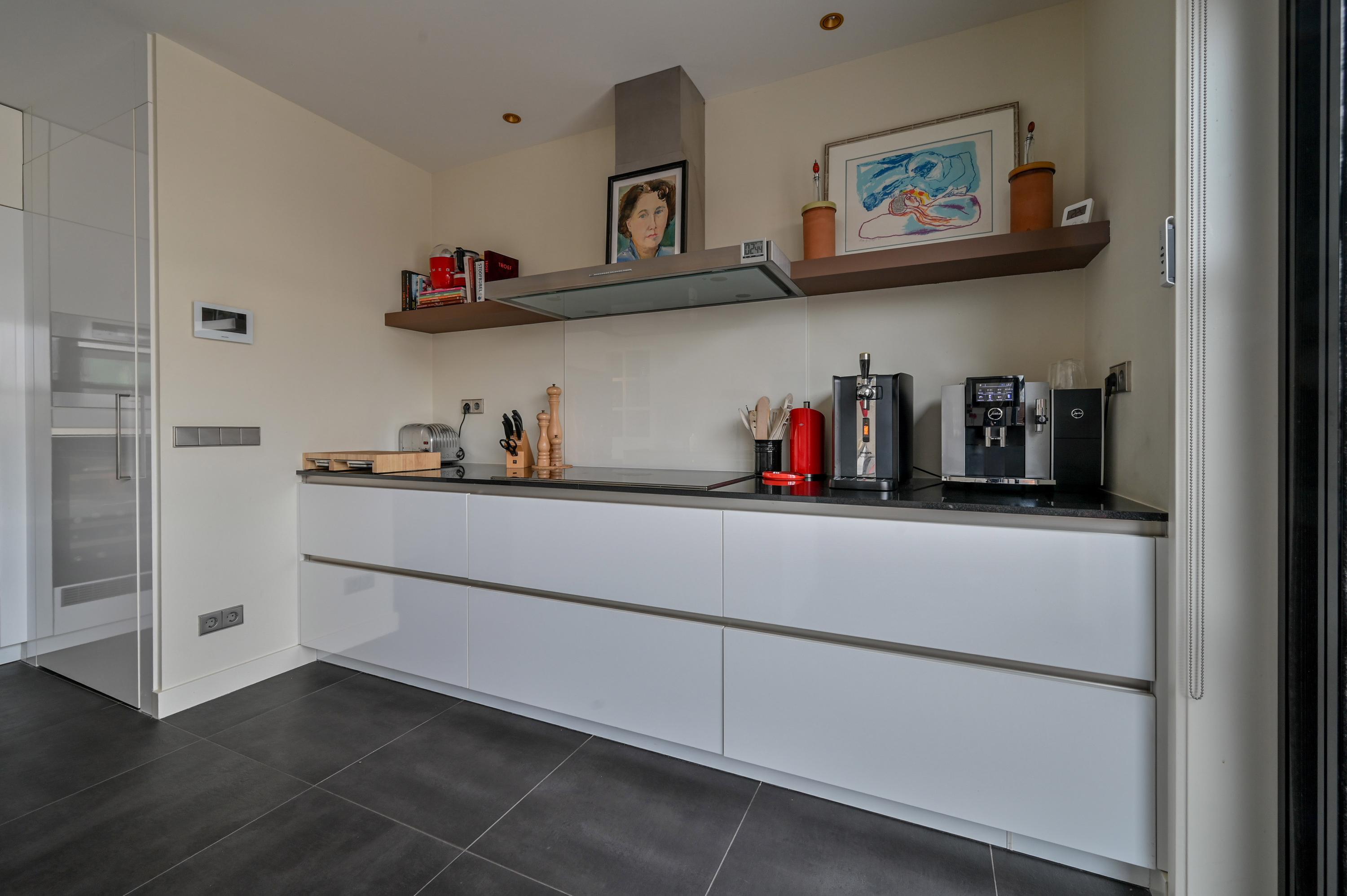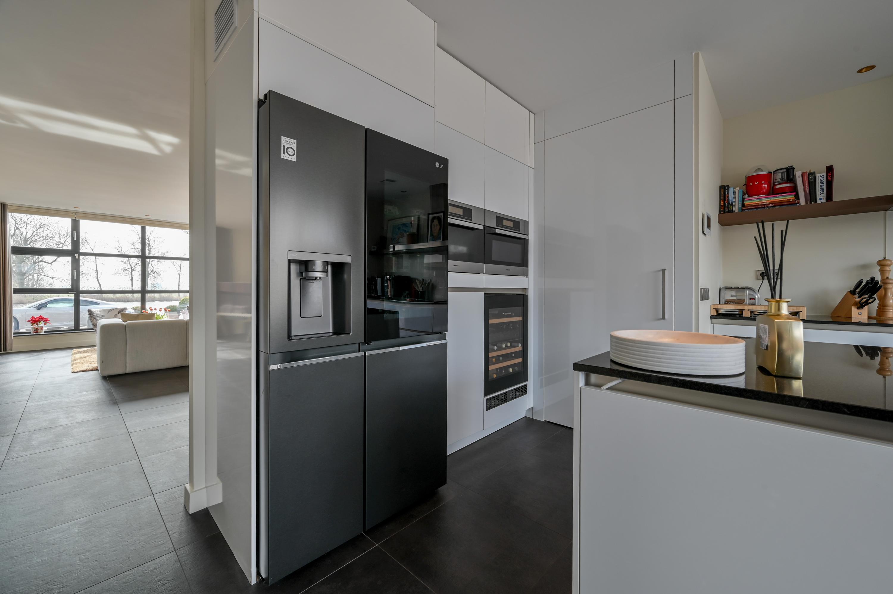 Aan de achterzijde bevindt zich de royale, luxe open keuken, ontworpen voor koken én leven. Het spoeleiland, de Qooker, vaatwasser, combi-ovens, inductiekookplaat met afzuigkap, grote LG-koelkast met vriezer en ijsblokjesmachine, Liebherr-wijnklimaatkast en uitgebreide kastruimte maken deze keuken tot een droom voor elke liefhebber van koken en gastvrijheid. Een vaste bank bij de grote eettafel zorgt voor een gezellige zithoek, terwijl dubbele openslaande deuren toegang geven tot de royale terrastuin, waar licht, ruimte en rust samenkomen.