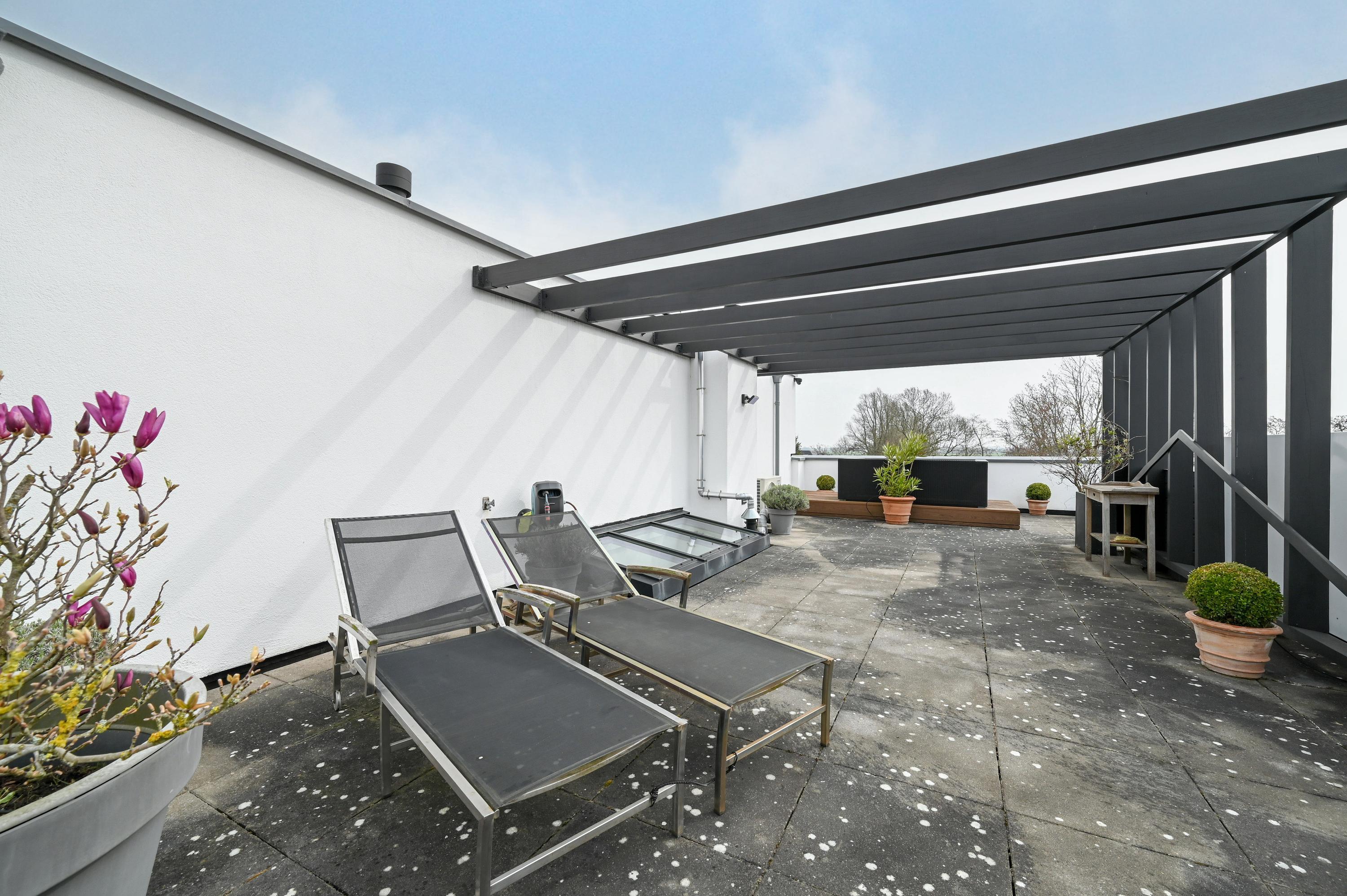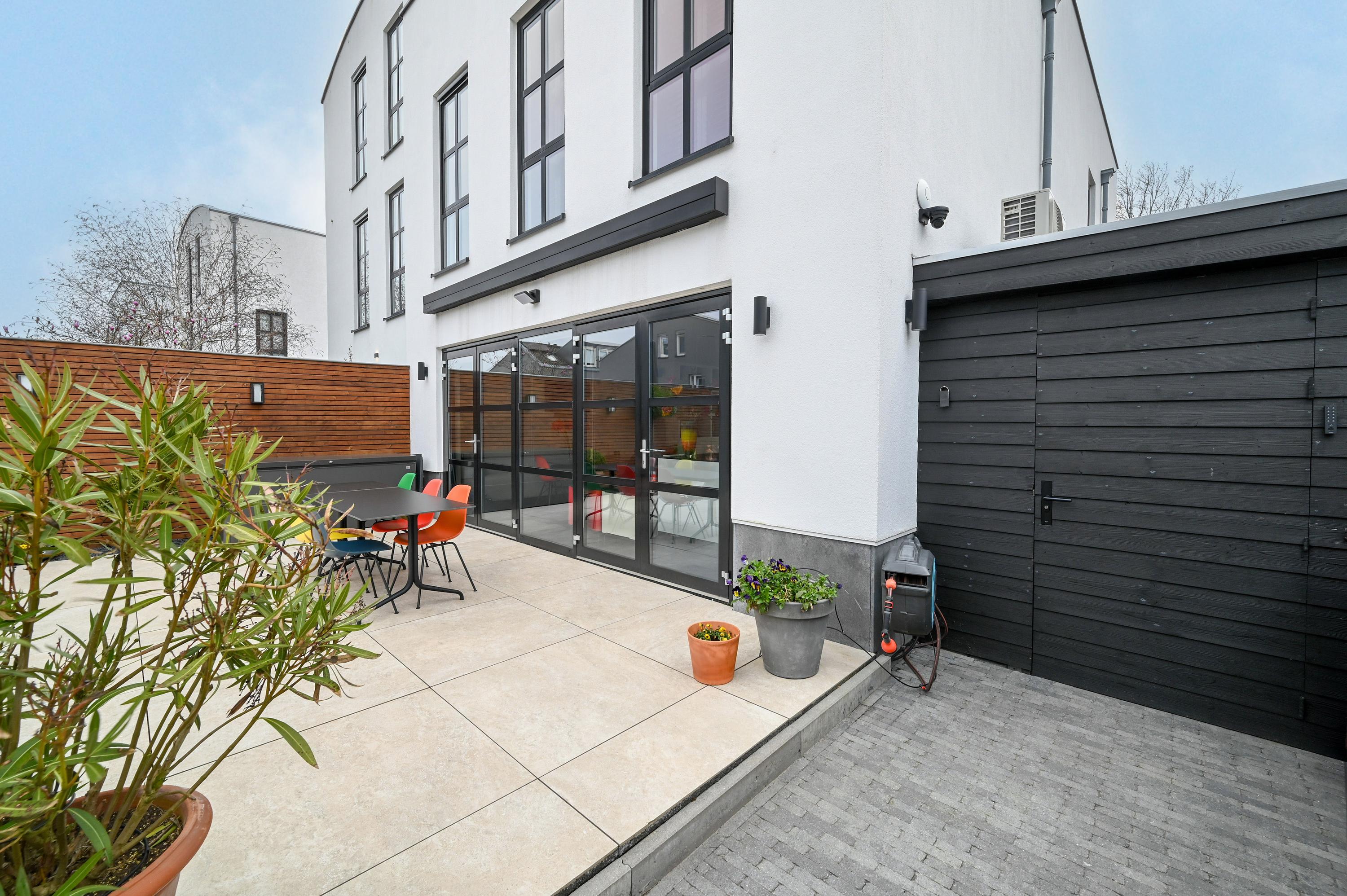 Het terras is volledig betegeld met grote, lichte tegels en omlijst met verzorgde beplanting langs de randen. Dankzij subtiele tuinverlichting ontstaat hier een stijlvolle en uitnodigende buitenruimte, waar u zowel overdag als ’s-avonds van het buitenleven kunt genieten. Het elektrische zonnescherm zorgt voor schaduw wanneer nodig.