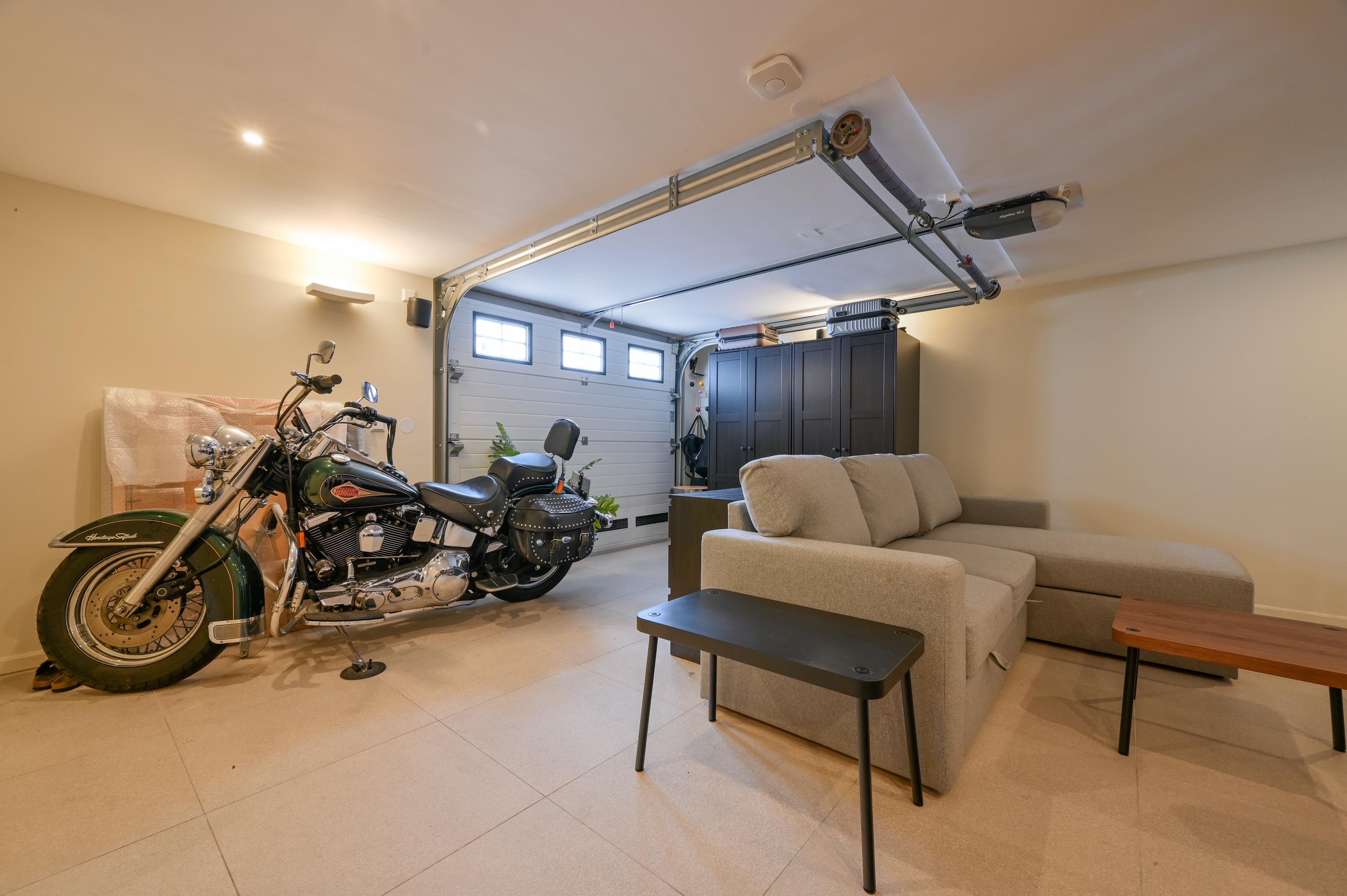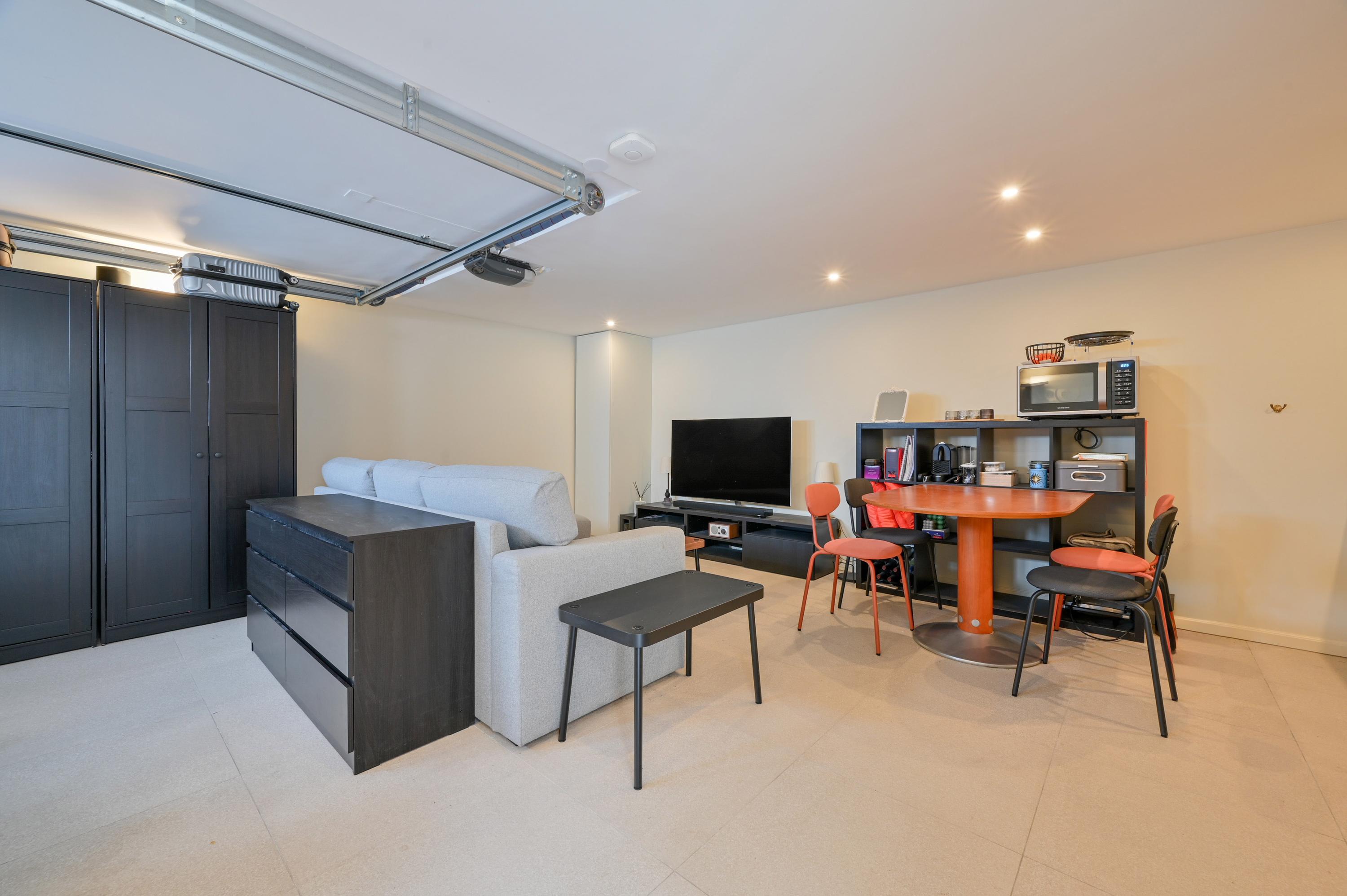 Onder het terras bevindt zich een garage die via een vaste trap bereikbaar is en die momenteel dienstdoet als studio, compleet met keukenblok, toilet, elektrische vloerverwarming en airconditioning. De garage is tevens bereikbaar via een elektrische deur aan de achterzijde van de woning.