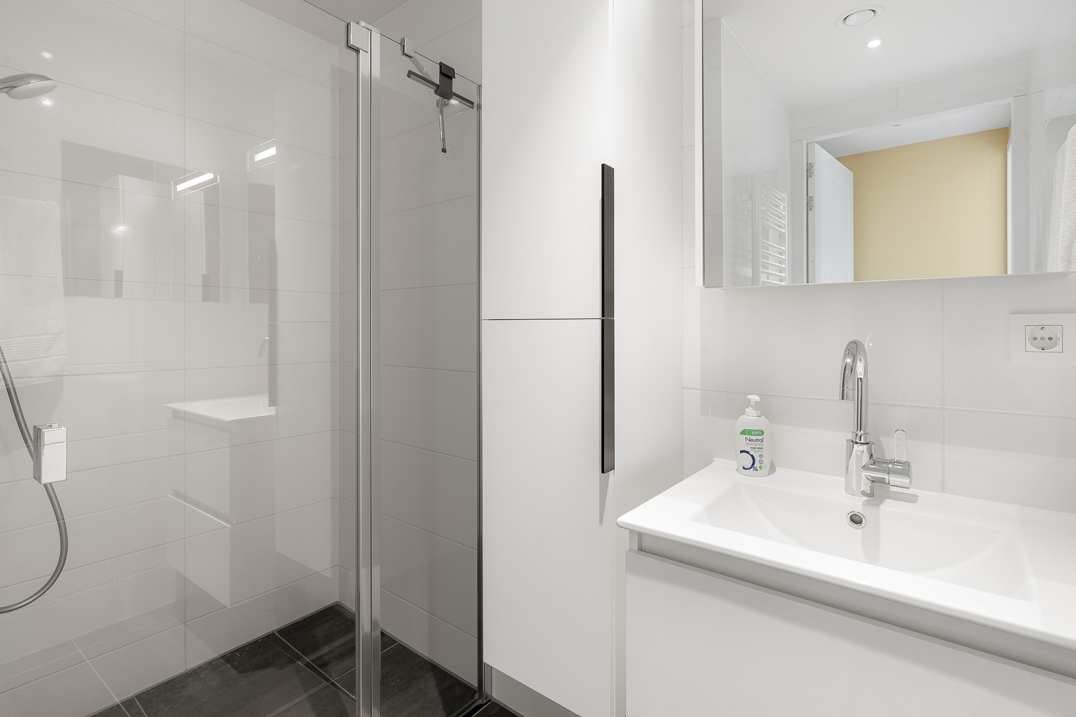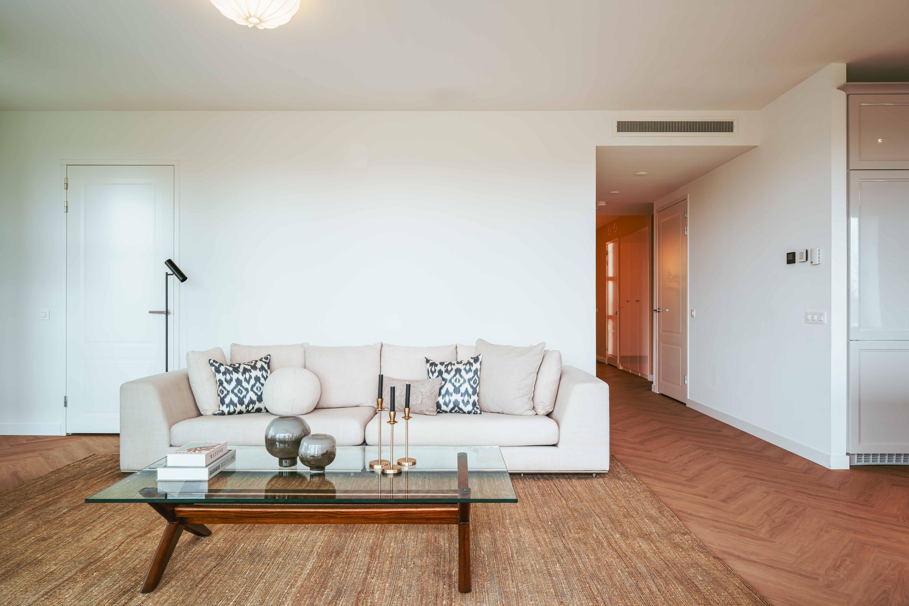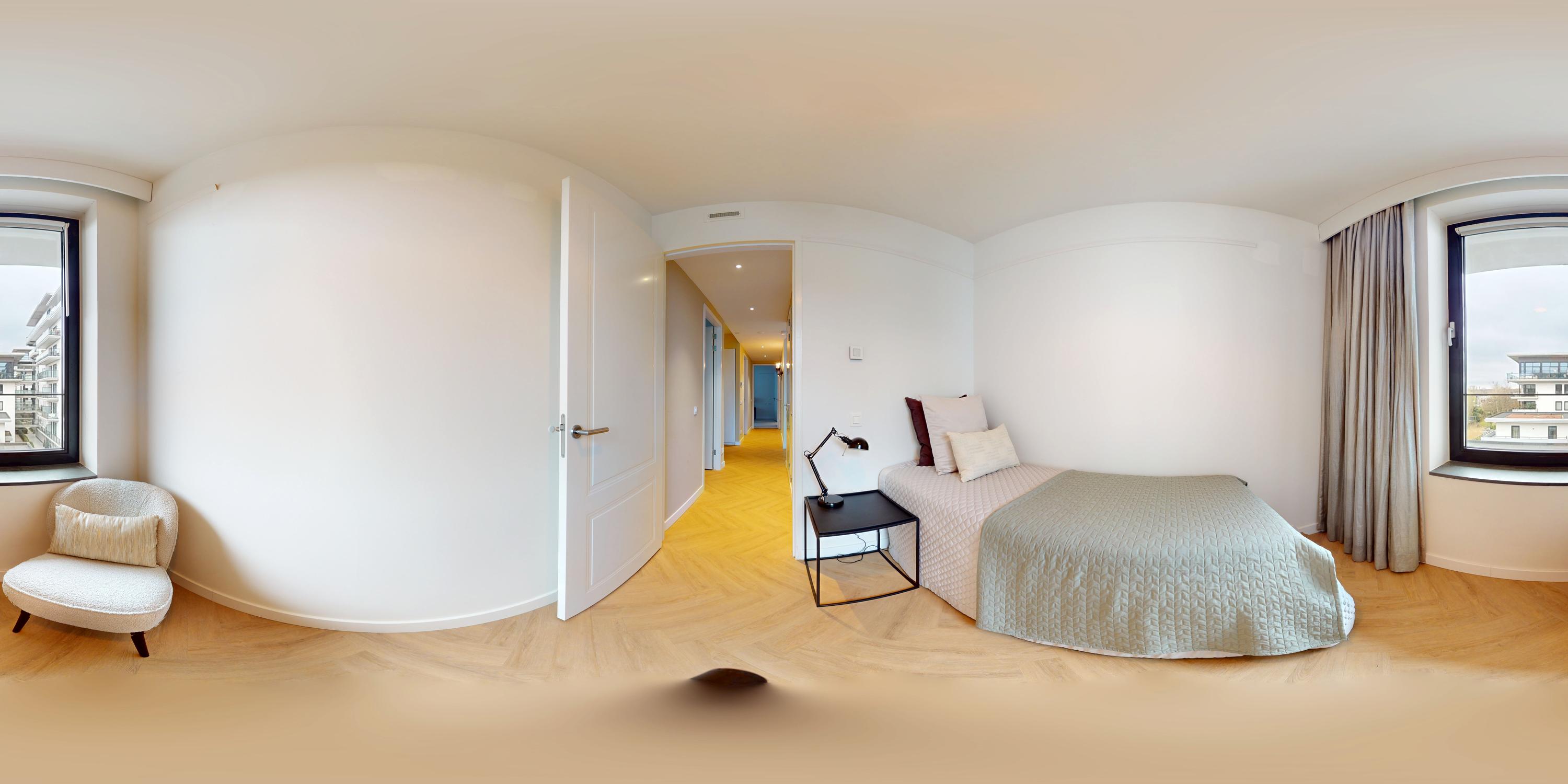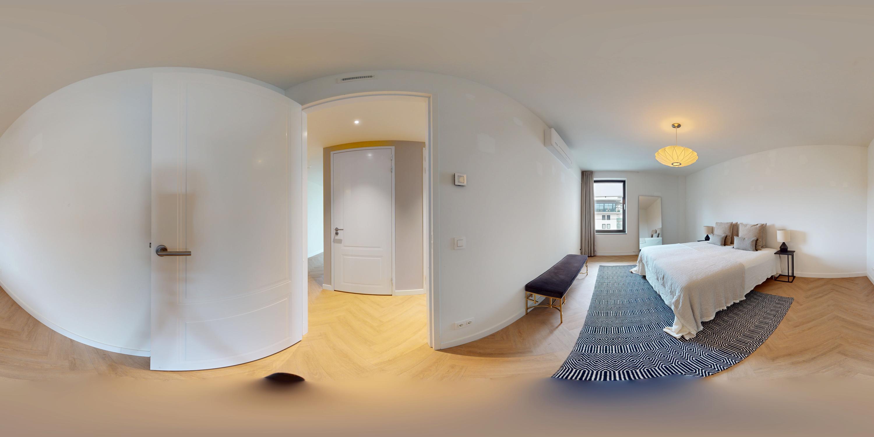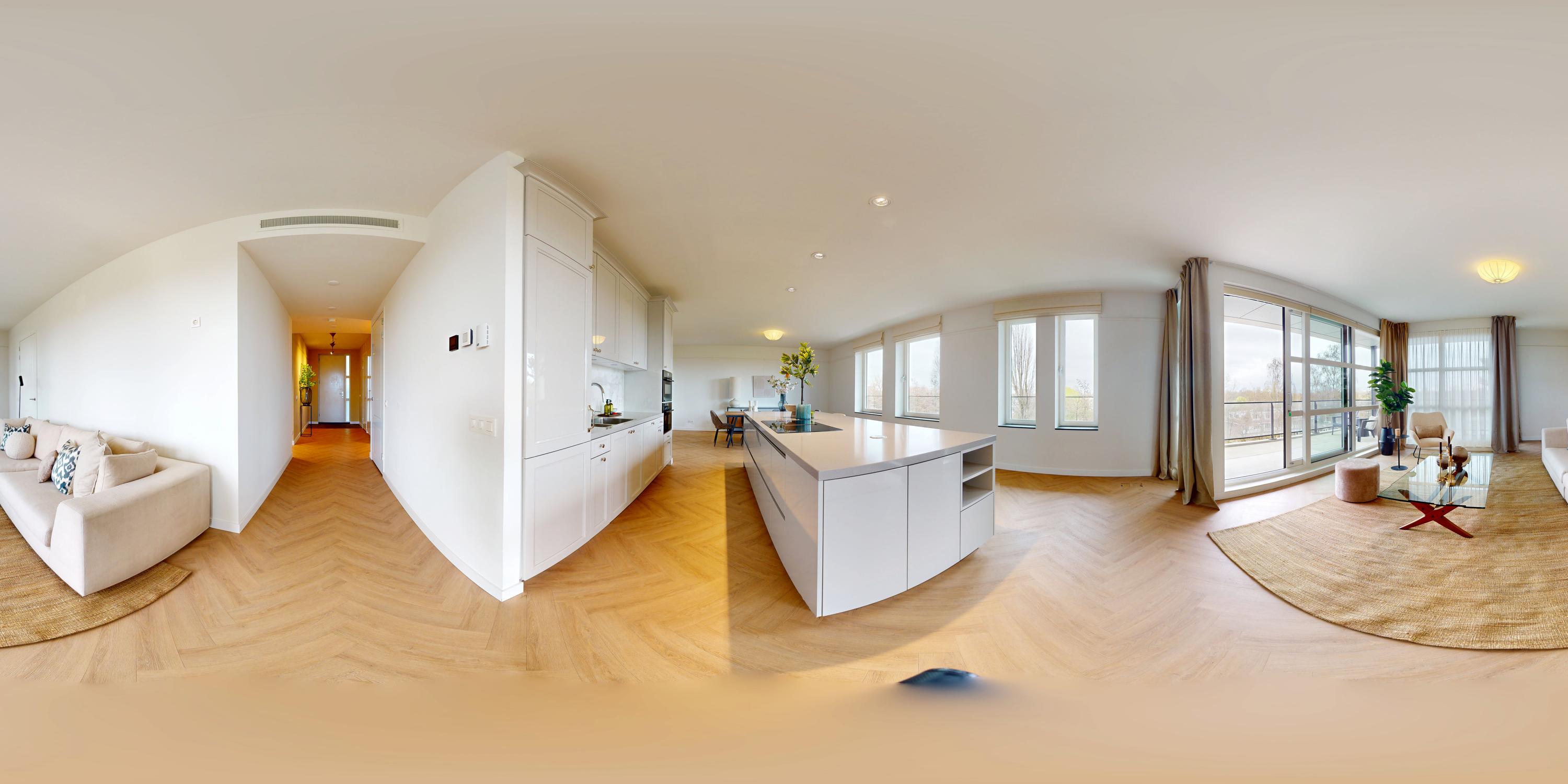 De entree bereikt u via een privé loopbrug. De royale hal biedt toegang tot alle vertrekken en inbouw garderobekasten. Het appartement is voorzien van een vloer gelegd in visgraat en is van PVC. Er is overal vloerverwarming en vloerkoeling.