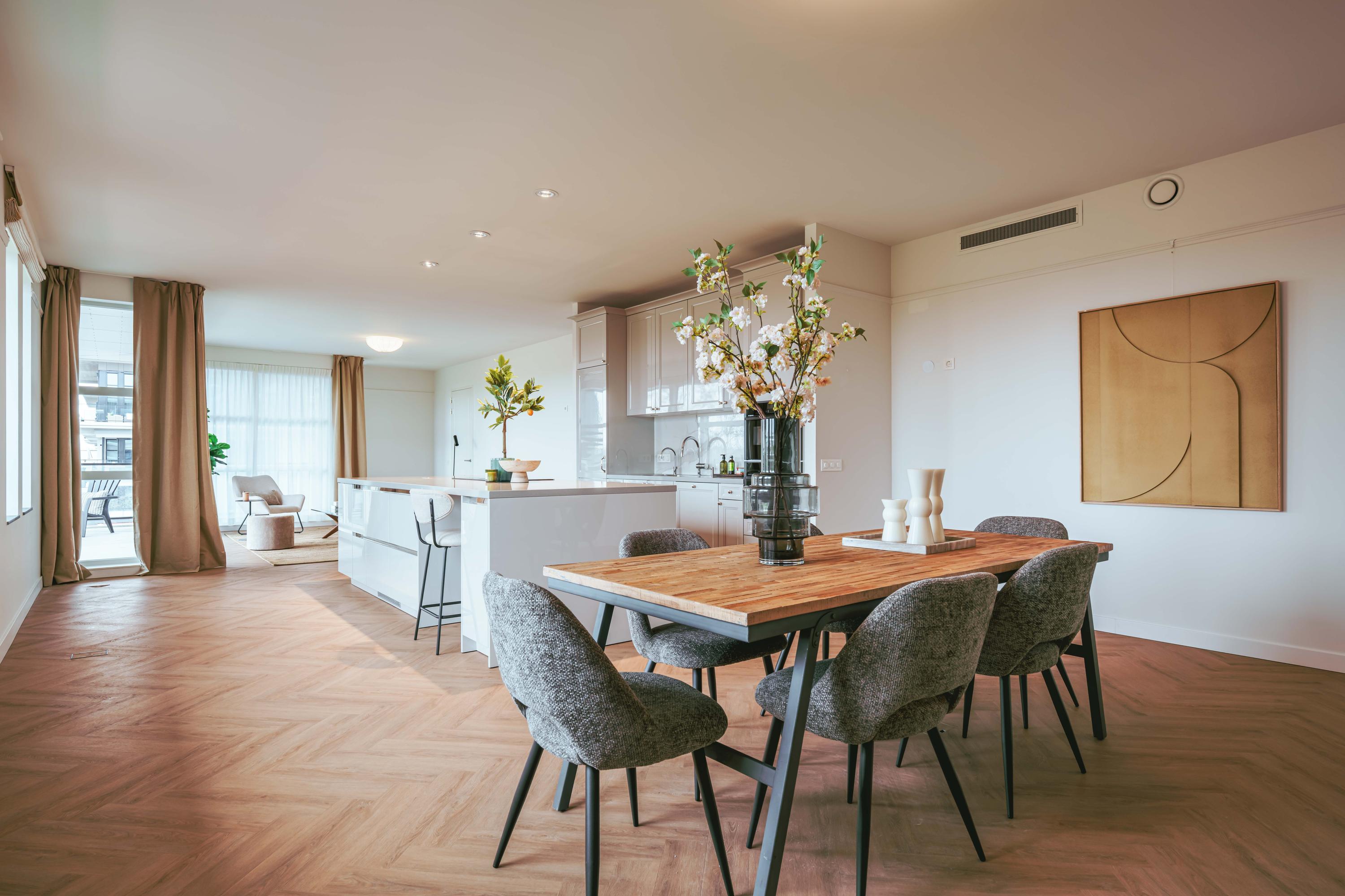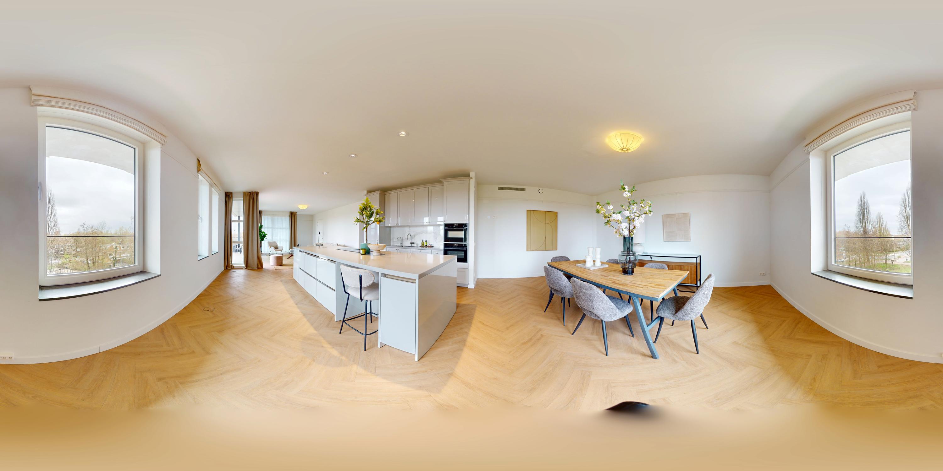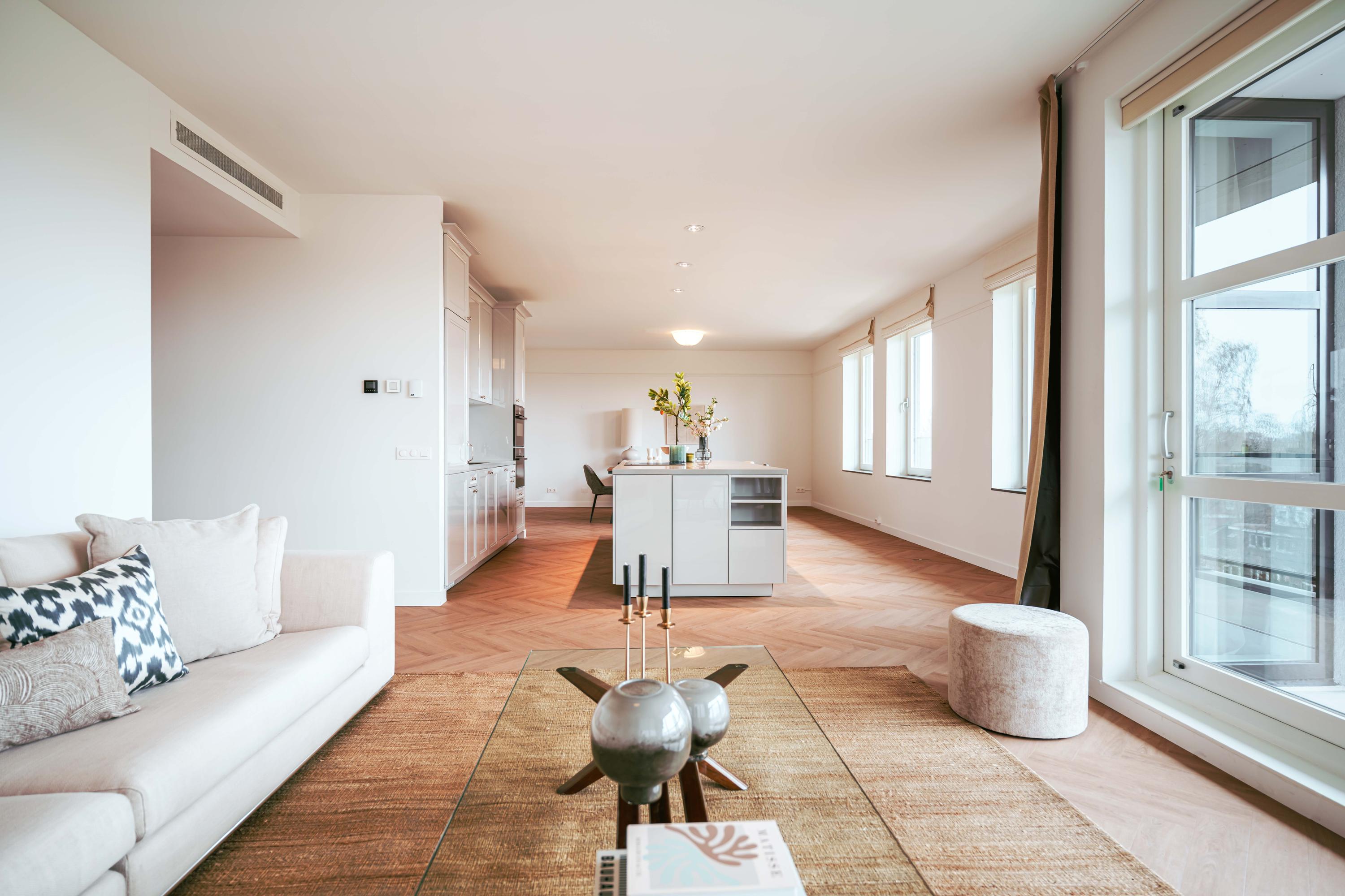 De mooie, grote woonkamer heeft veel natuurlijk licht via de vele ramen. Het Siematic kookeiland is een ware blikvanger. De keuken is uitgerust met diverse inbouwapparatuur, te weten: een inductiekookplaat met geïntegreerde afzuiging, oven (zelfreinigend), combi oven-magnetron, Quooker en een grote koelkast. Er is ook een aparte pantry aanwezig met ruimte voor een wijnklimaatkast en vriezer. Het zonnige balkon is gelegen op het zuid-westen en biedt een heerlijke plek om te ontspannen en te genieten van het vrije uitzicht.