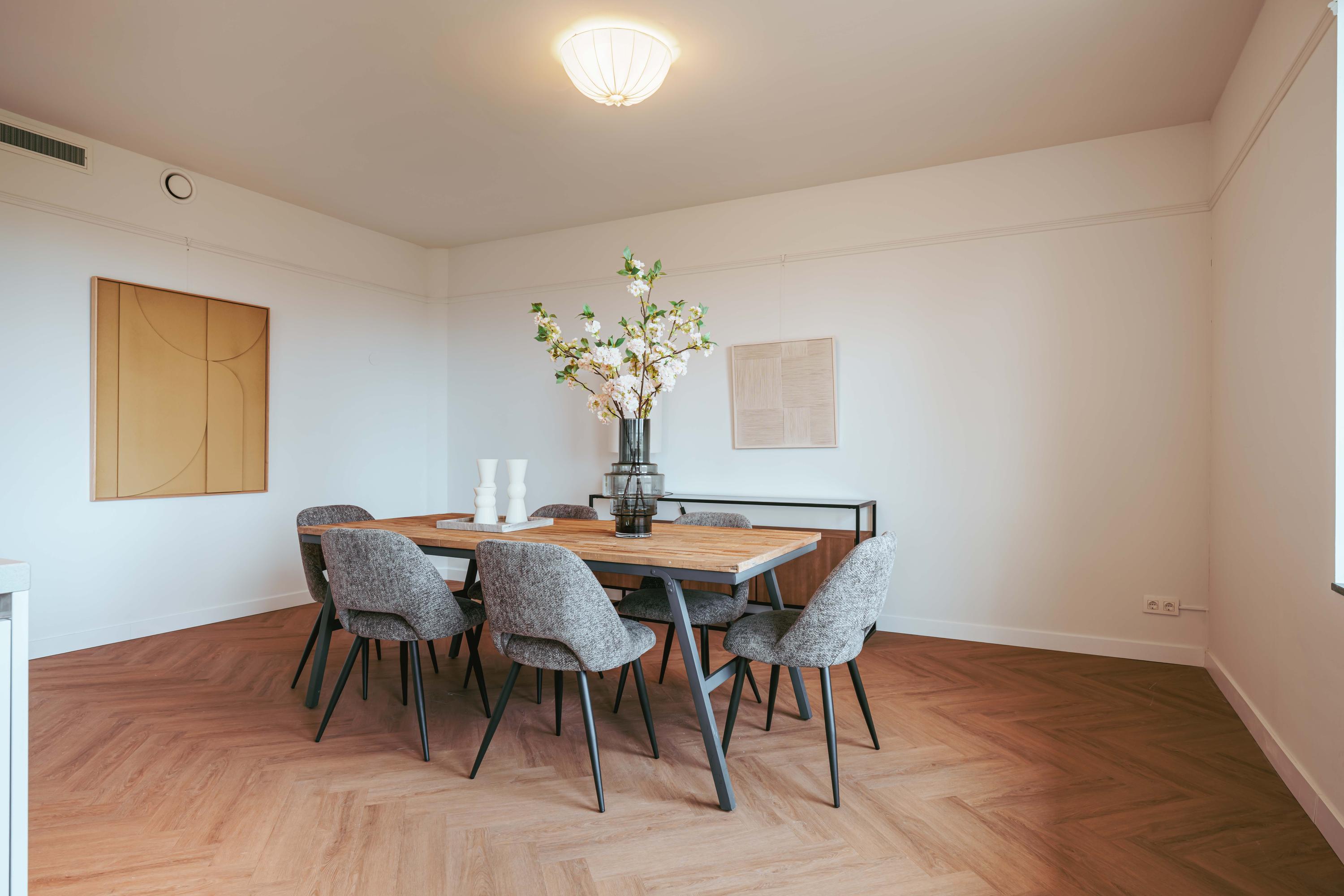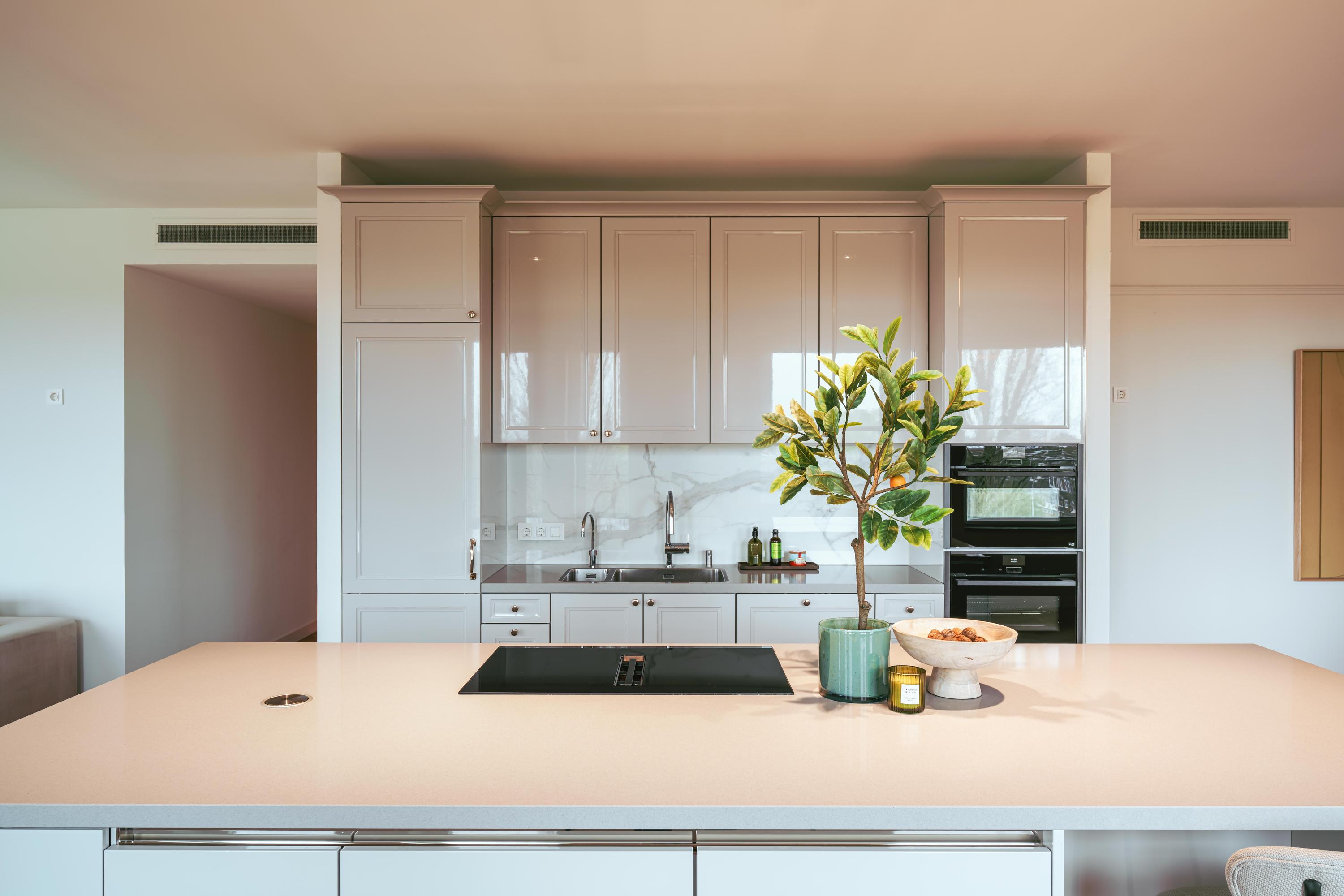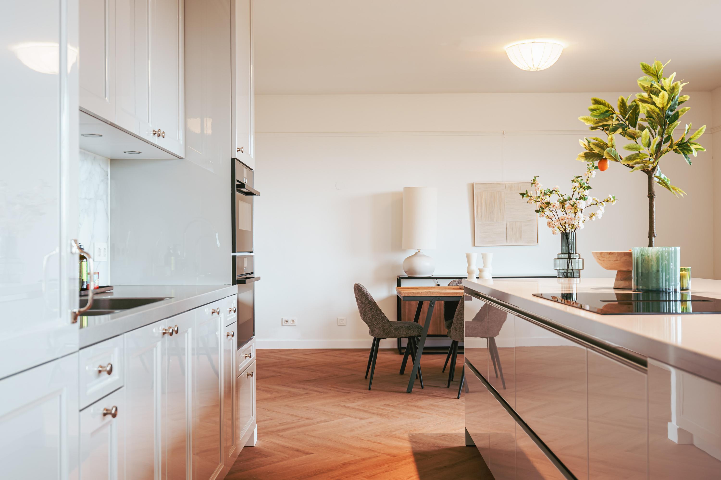De mooie, grote woonkamer heeft veel natuurlijk licht via de vele ramen. Het Siematic kookeiland is een ware blikvanger. De keuken is uitgerust met diverse inbouwapparatuur, te weten: een inductiekookplaat met geïntegreerde afzuiging, oven (zelfreinigend), combi oven-magnetron, Quooker en een grote koelkast. Er is ook een aparte pantry aanwezig met ruimte voor een wijnklimaatkast en vriezer. Het zonnige balkon is gelegen op het zuid-westen en biedt een heerlijke plek om te ontspannen en te genieten van het vrije uitzicht.