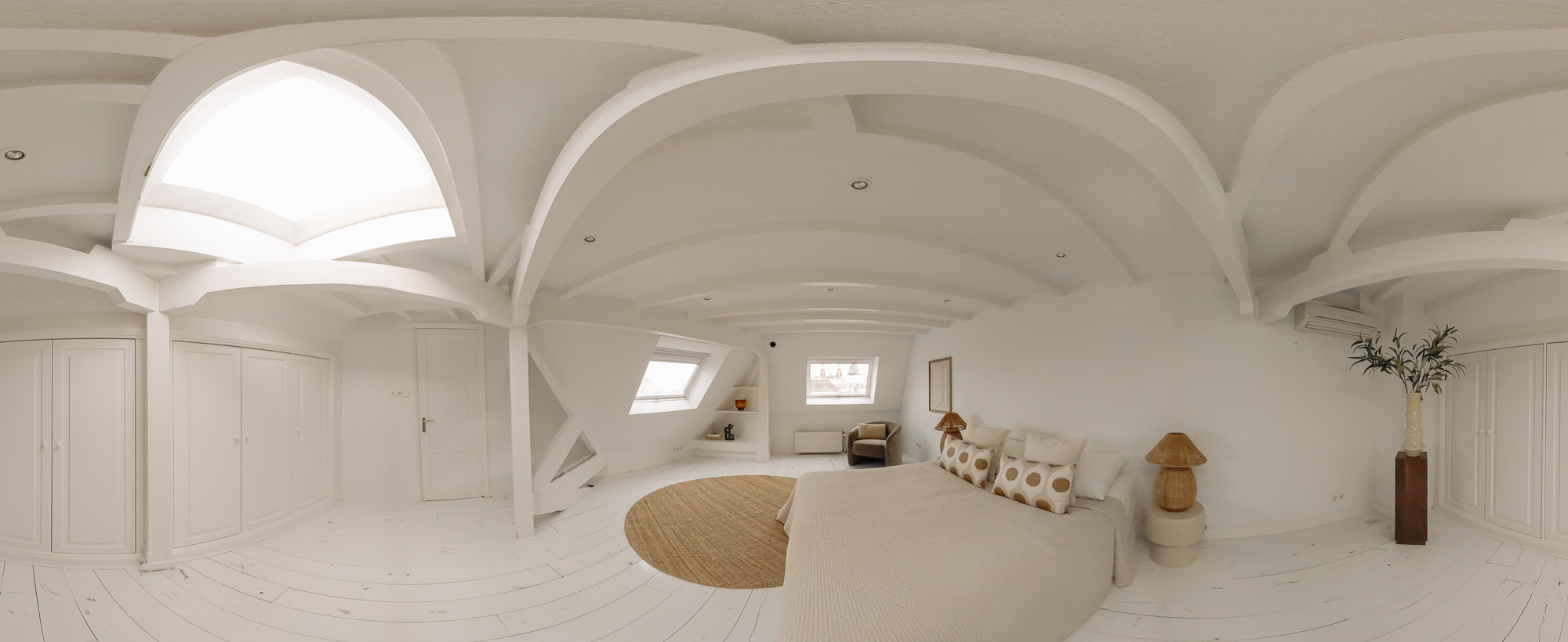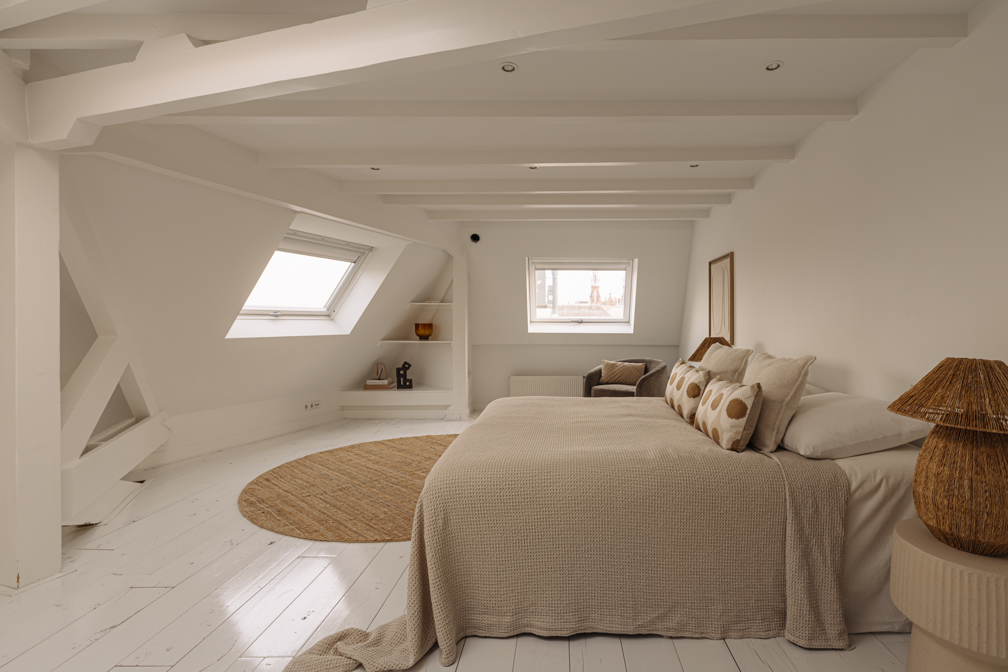 De eerste slaapkamer bevindt zich op de vierde verdieping en beschikt over een ingebouwd bureau en een handige bergkast. Via dubbele openslaande deuren heeft u toegang tot het riante dakterras (ca. 23 m²).