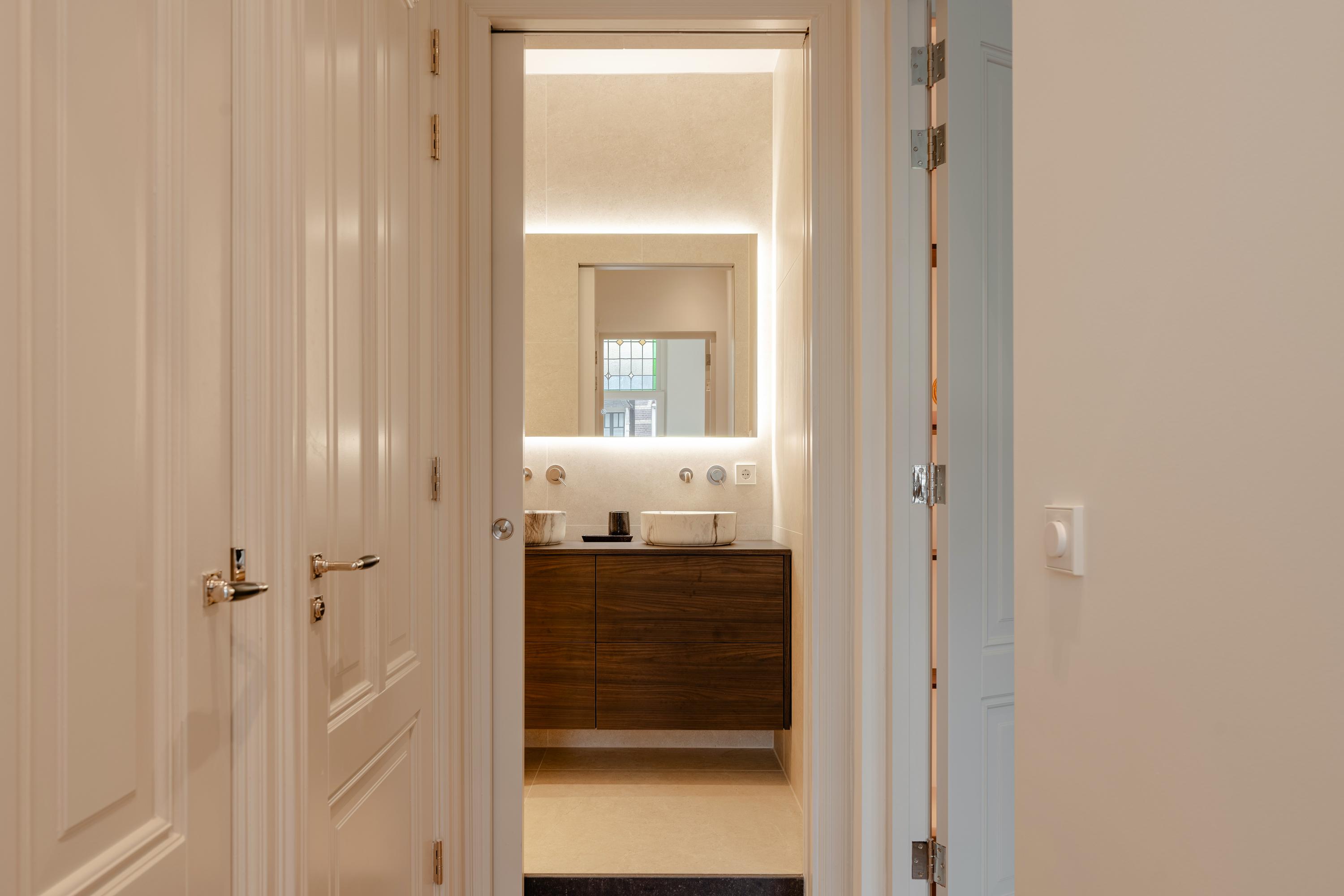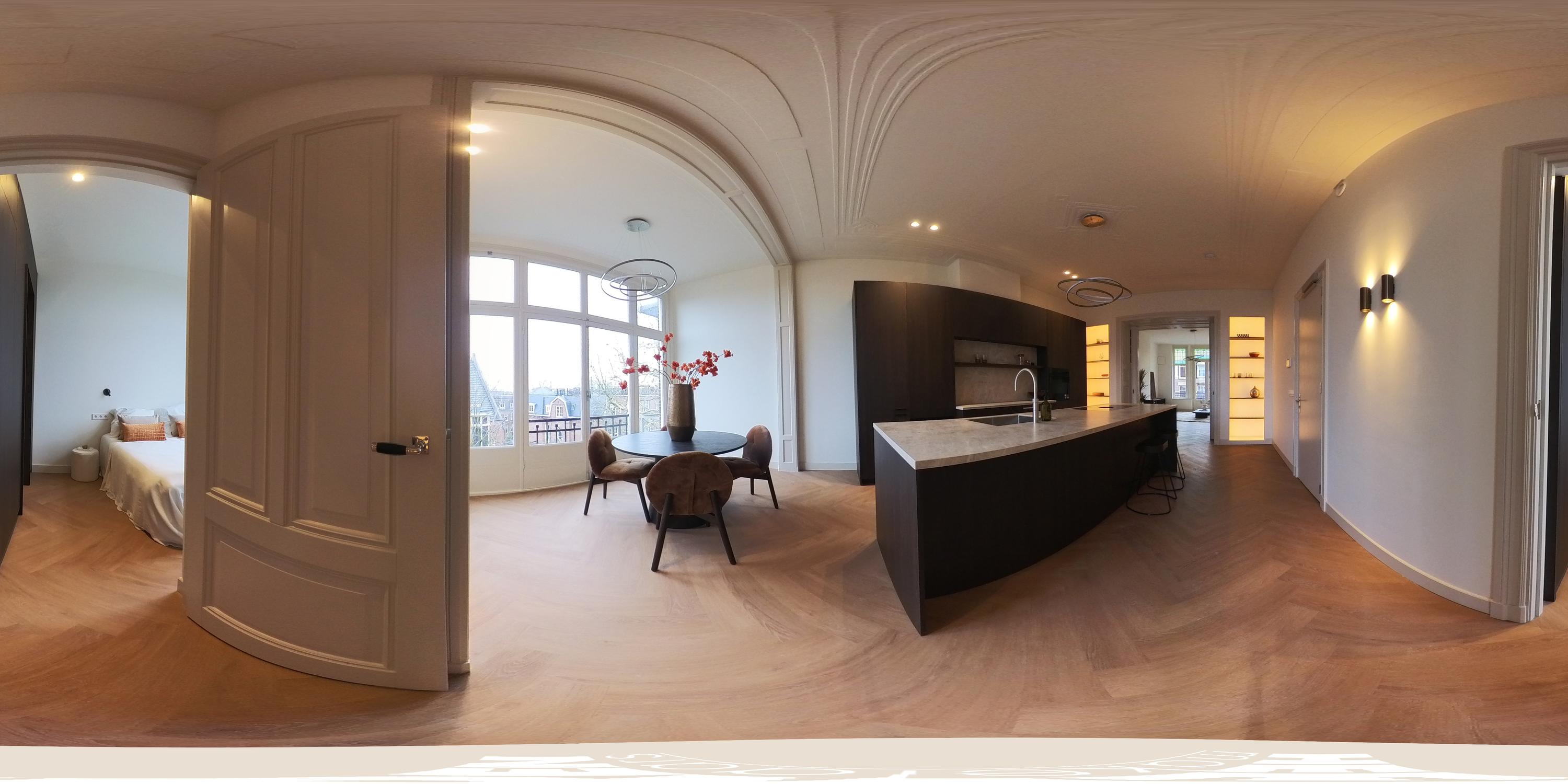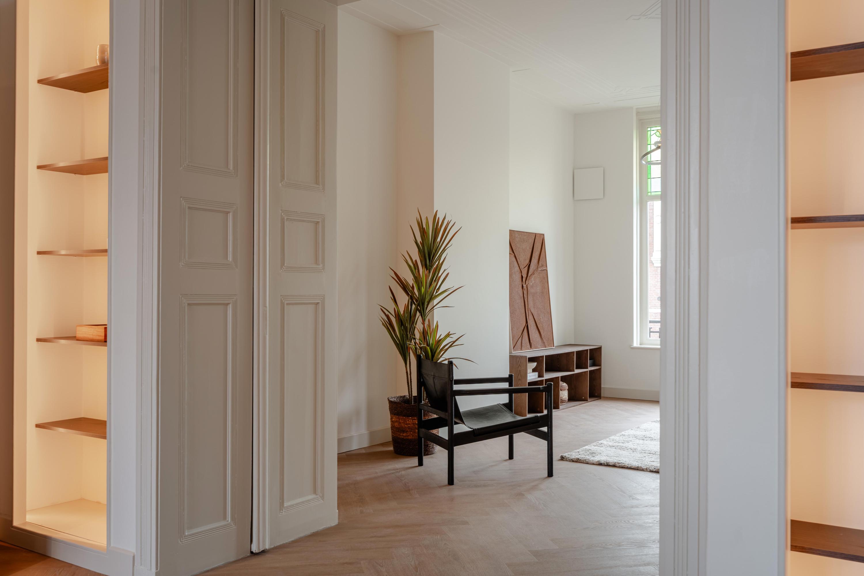 Dit luxe appartement is gelegen op de tweede verdieping en kenmerkt zich door een open en doordachte indeling, met grote raampartijen aan zowel de voor- als achterzijde die zorgen voor een aangename lichtinval gedurende de dag. Het gehele appartement is hoogwaardig en stijlvol afgewerkt. De royale woonkamer is gesitueerd aan de voorzijde van de woning en beschikt over een plafondhoogte van circa 3,28 meter. Vanuit de woonkamer is het balkon aan de voorzijde bereikbaar. Middels elegante schuifdeuren kan de woonkamer worden afgescheiden van de keuken en eetkamer, waardoor de ruimtes flexibel en naar wens in te delen zijn. In de wand tussen de woonkamer en de keuken zijn maatwerk inbouwkasten gerealiseerd, ideaal voor boeken en display-objecten en tegelijk een stijlvolle toevoeging aan het interieur. De luxe keuken vormt het hart van het appartement en is voorzien van een royaal spoel- en kookeiland met inductiekookplaat, spoelbak en Quooker. Verder beschikt de keuken over een koelkast, vriezer, combi-oven, klimaatkast en meer dan voldoende bergruimte. Het eiland fungeert tevens als gezellige bar om aan te zitten.