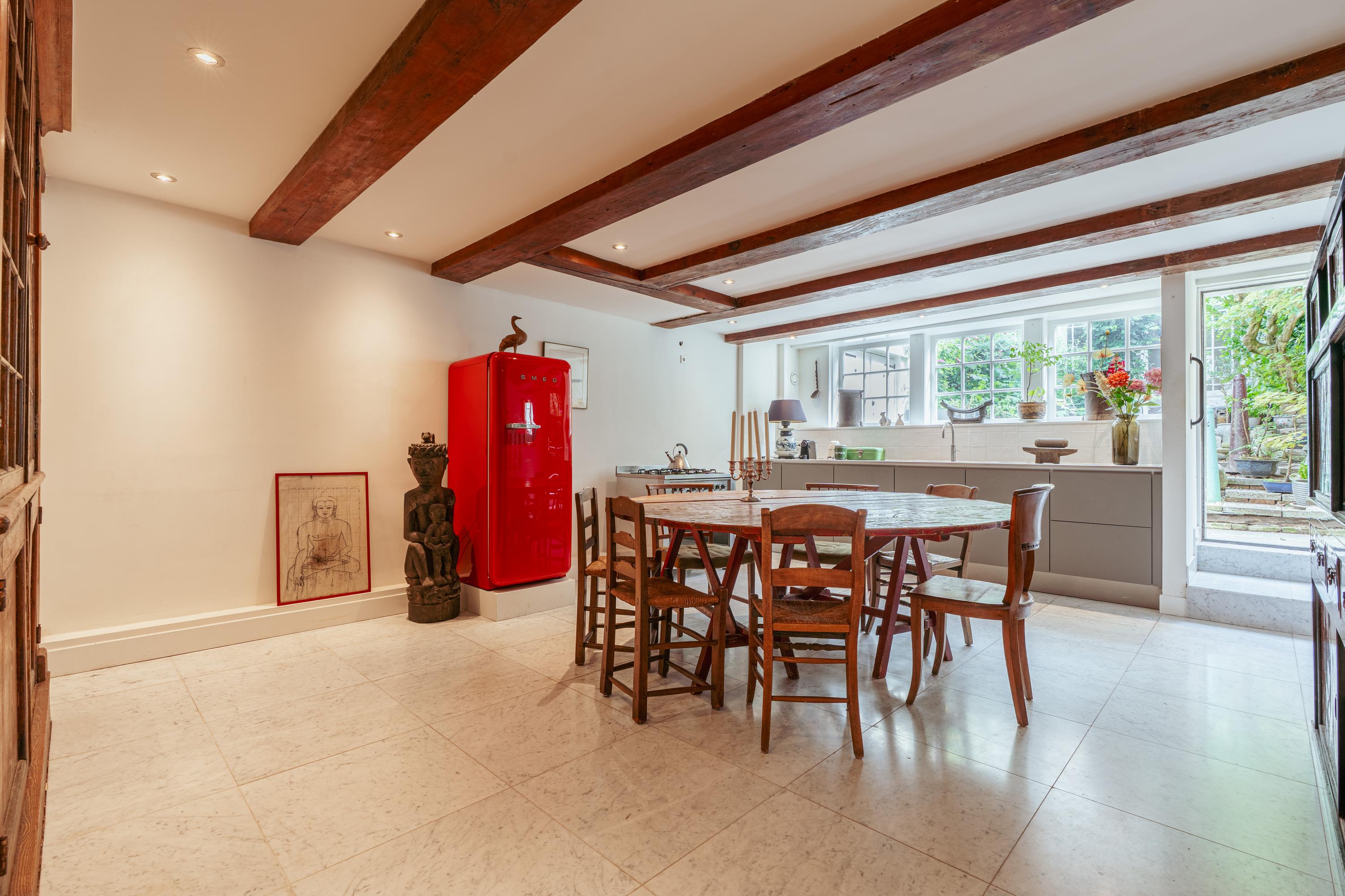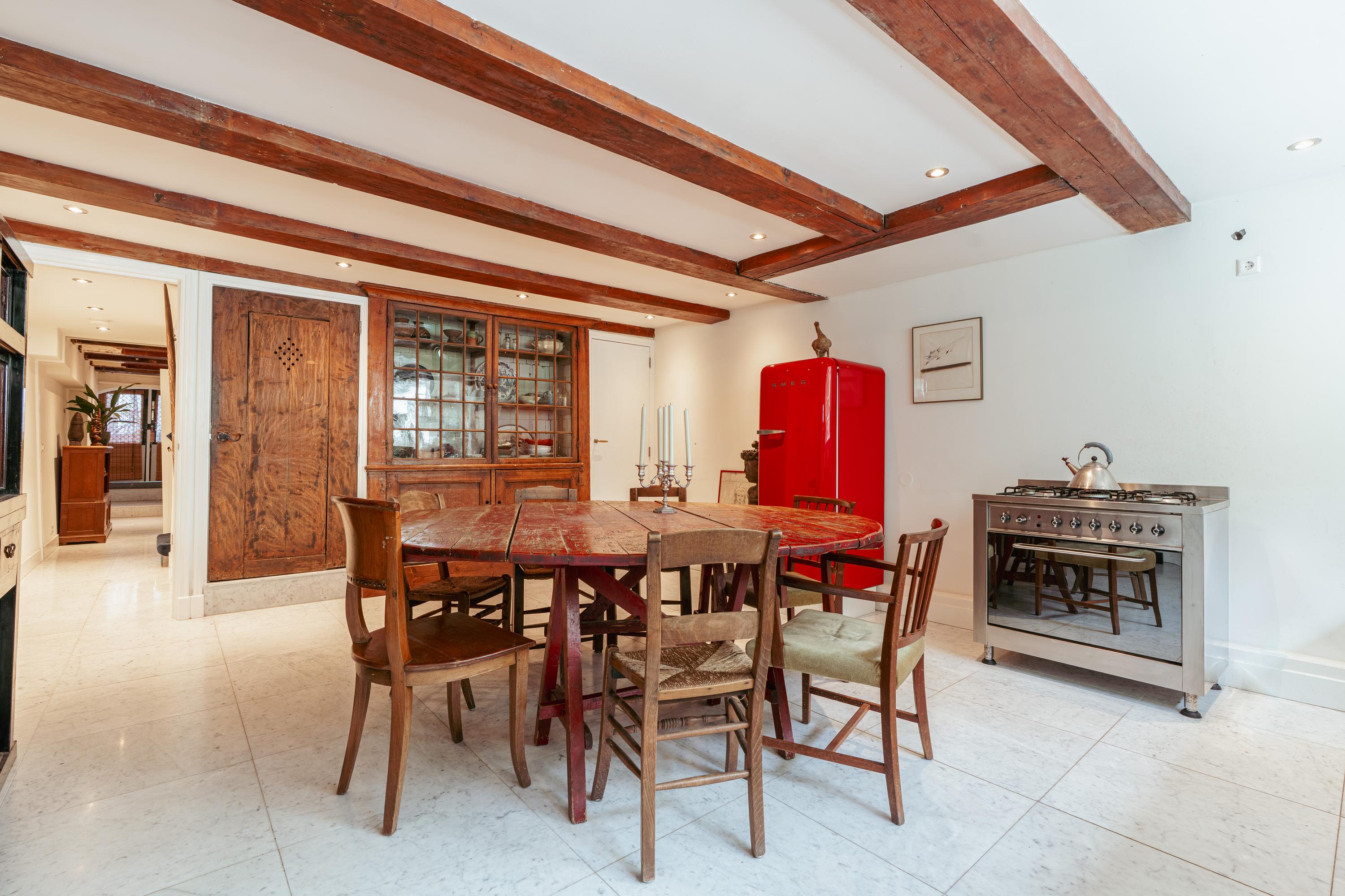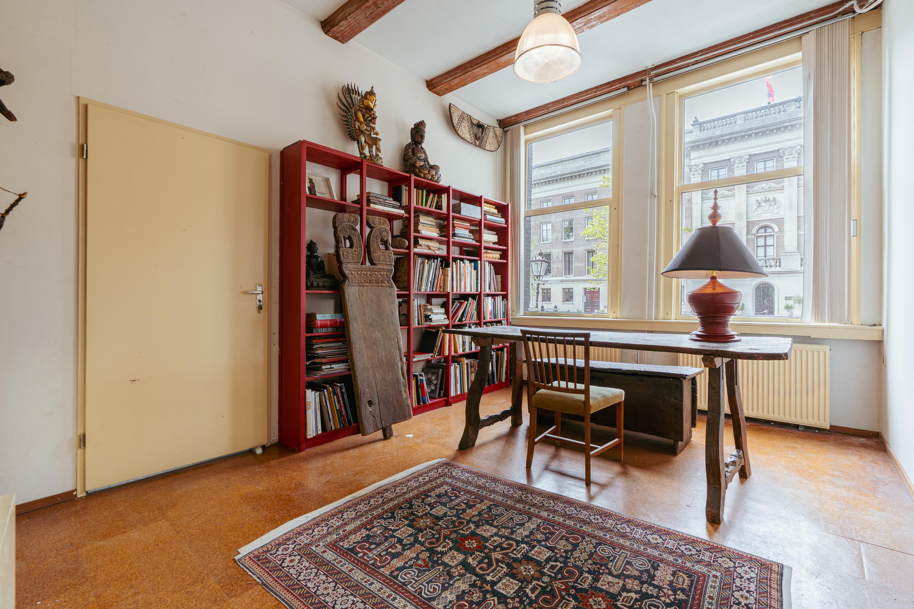 Aan de voorzijde bevindt zich een ruime kamer, ideaal als werkkamer of aparte eetkamer. Deze kamer beschikt bovendien over een eigen toegangsdeur vanuit de gemeenschappelijke hal. Aan de achterzijde ligt de woonkamer met uitzicht op de binnentuin. Beide kamers zijn voorzien van karakteristieke houten balken en hoge ramen, wat zorgt voor een prettige lichtinval.