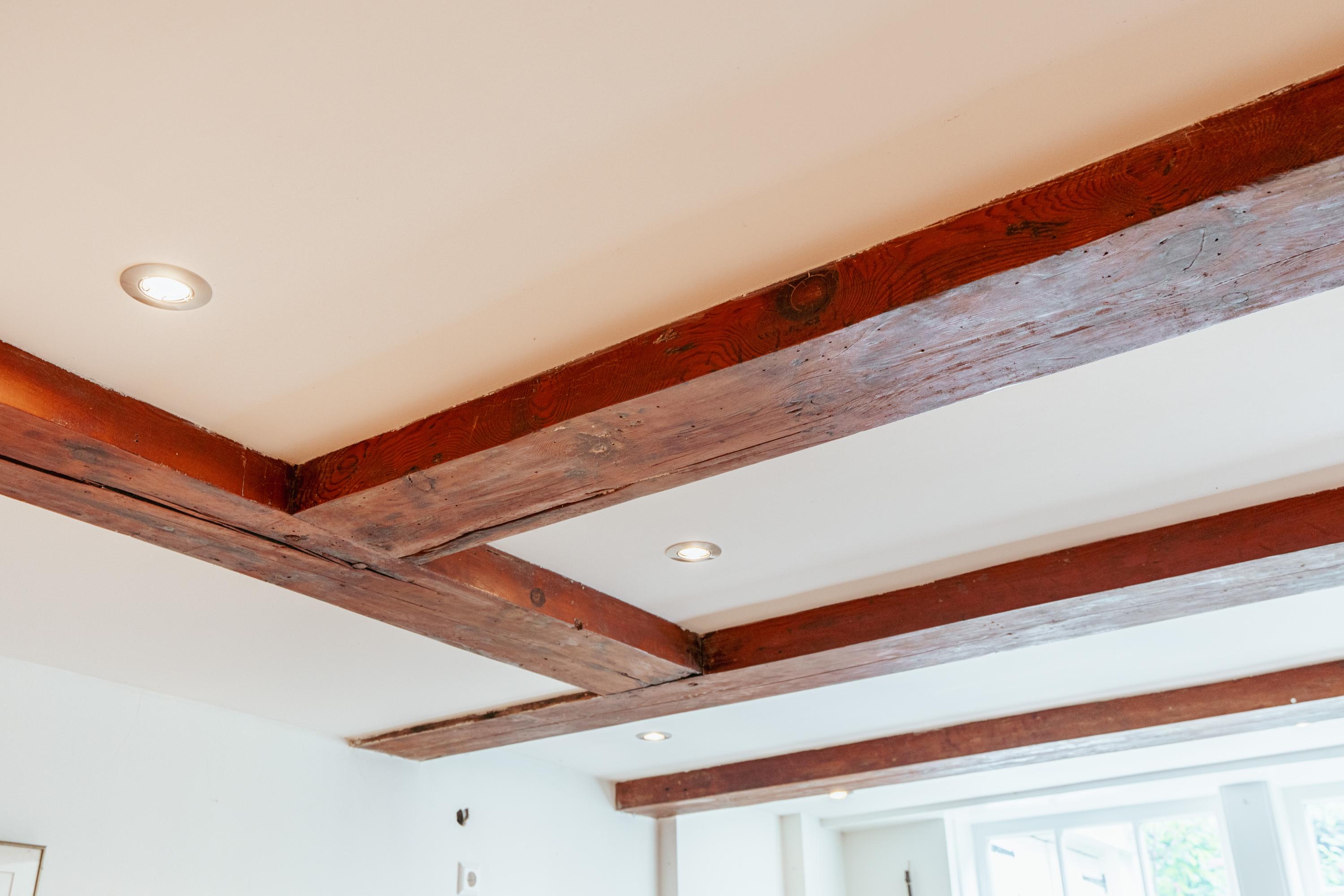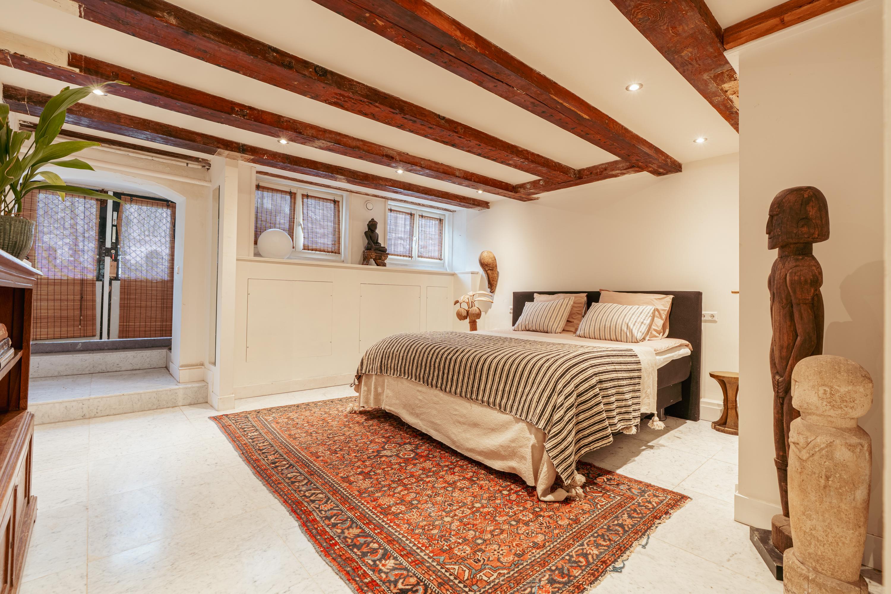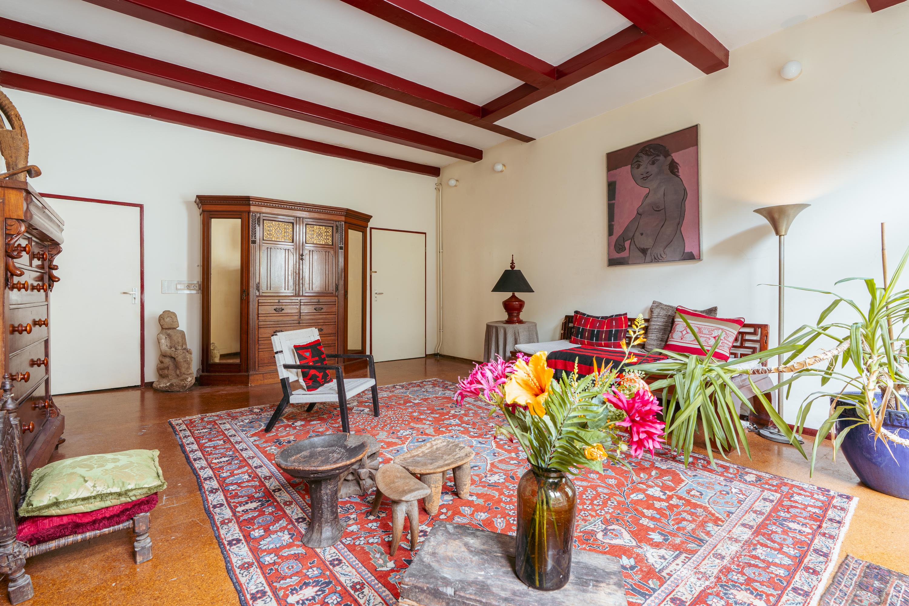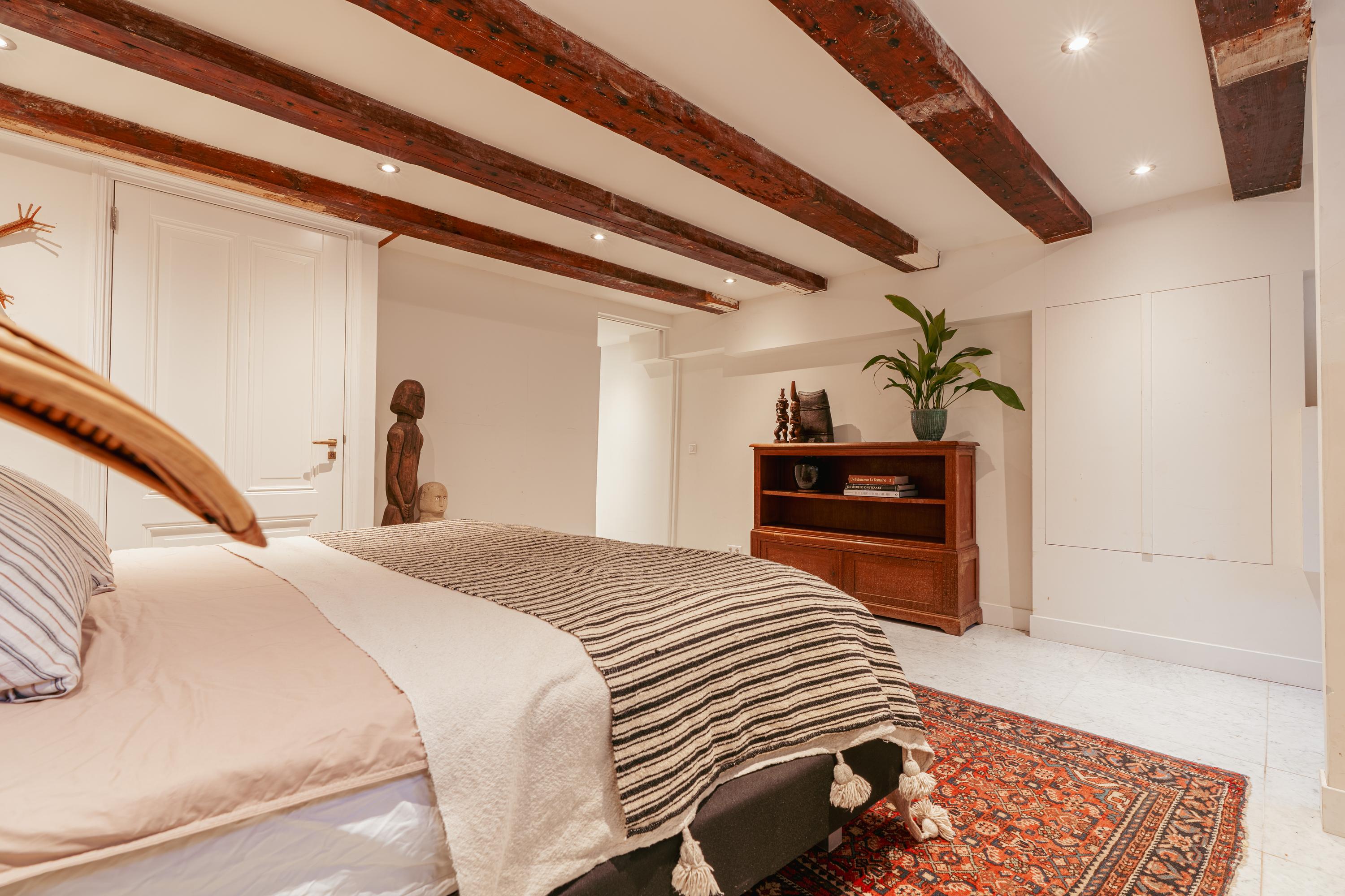 Aan de voorzijde bevindt zich een ruime kamer, ideaal als werkkamer of aparte eetkamer. Deze kamer beschikt bovendien over een eigen toegangsdeur vanuit de gemeenschappelijke hal. Aan de achterzijde ligt de woonkamer met uitzicht op de binnentuin. Beide kamers zijn voorzien van karakteristieke houten balken en hoge ramen, wat zorgt voor een prettige lichtinval.
