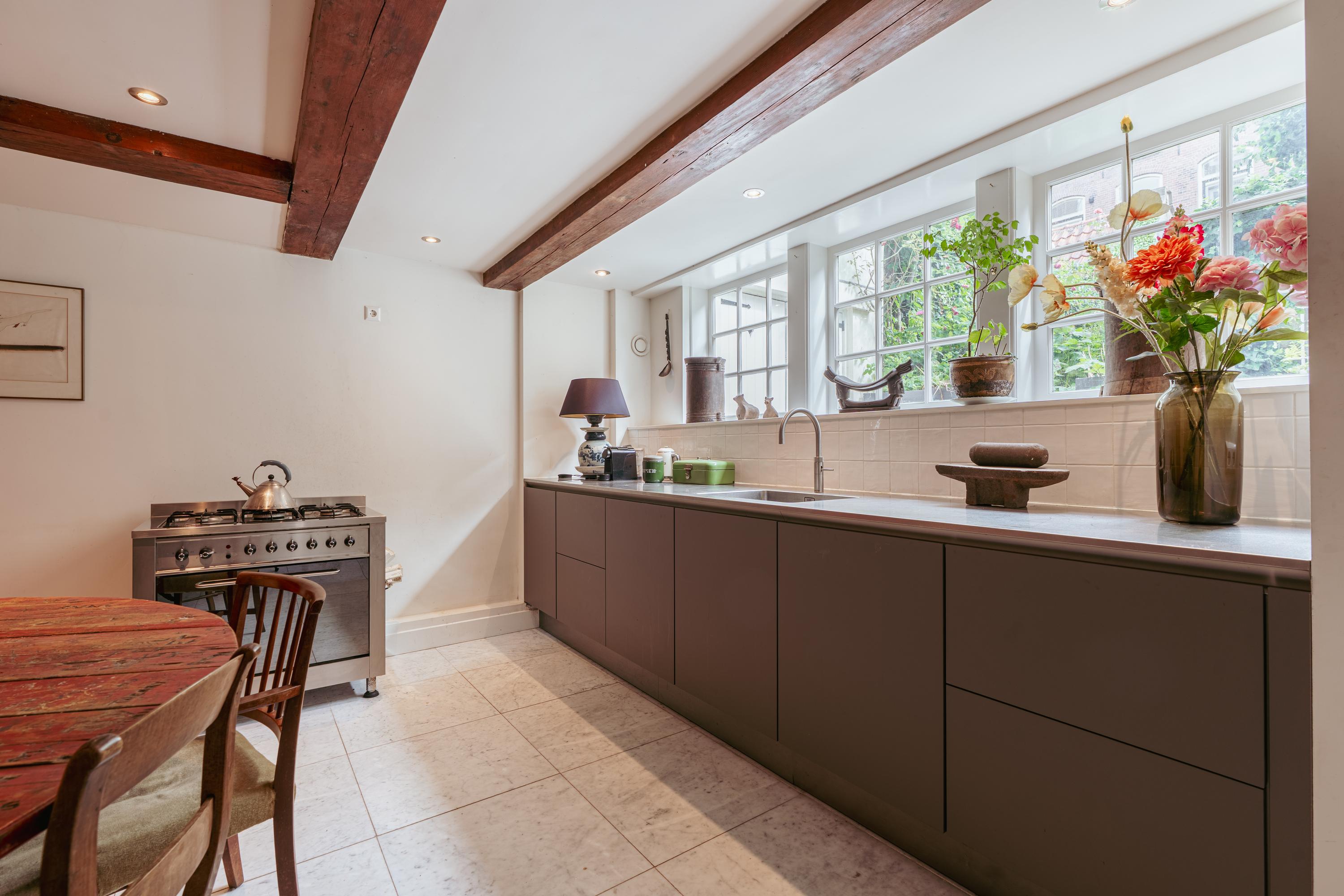 Via de interne trap bereikt u het souterrain, dat ruim en functioneel is ingedeeld. Aan de achterzijde bevindt zich de eetkamer met aangrenzende keuken. De keuken is aan de tuinzijde gesitueerd en biedt directe toegang tot de diepe achtertuin, waardoor binnen en buiten op een prettige manier met elkaar zijn verbonden. De keuken is voorzien van een Quooker, vaatwasser, een los gasfornuis met oven en een koel-vriescombinatie. Daarnaast beschikt de keuken over prachtige ingebouwde houten kasten, ideaal voor extra bergruimte. Vanuit de keuken is er toegang tot een aparte ruimte met opstelplaats voor wasmachine en droger.