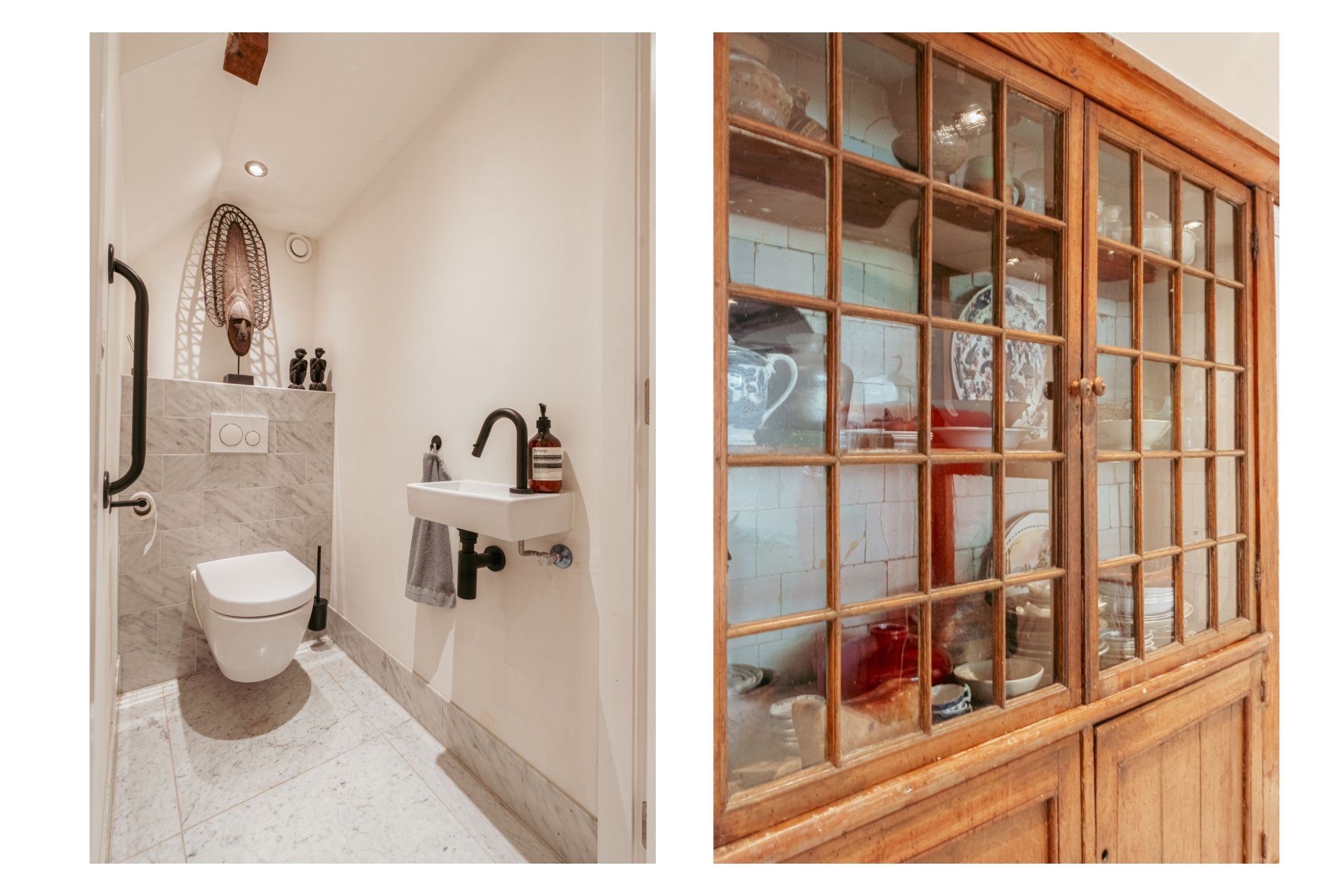 De twee vertrekken worden van elkaar gescheiden door een toilet met separaat fonteintje, bereikbaar vanuit beide kamers.