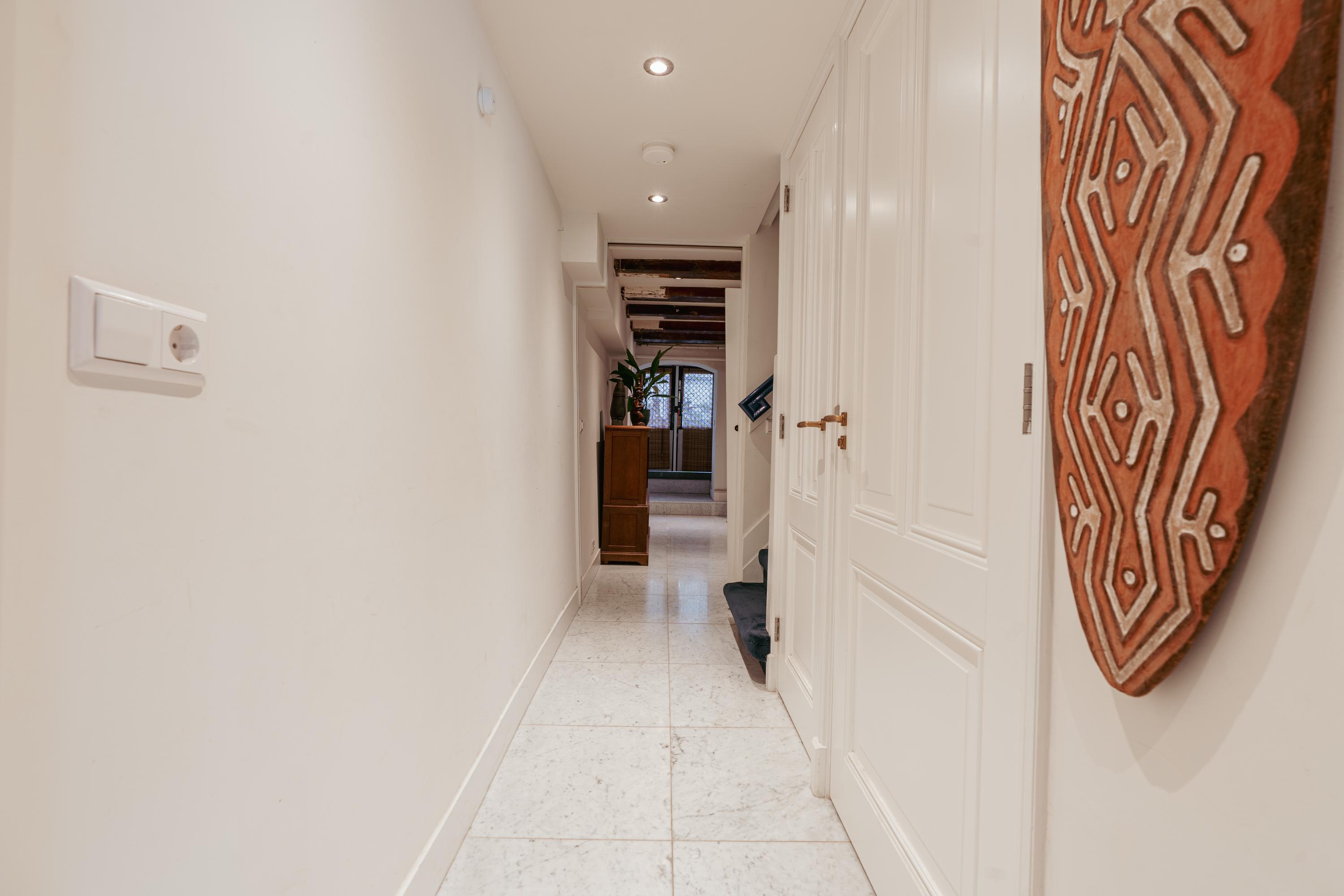 Via de gemeenschappelijke entree aan de Prinsengracht bereikt u aan het einde van de hal de woning op de bel-etage. U komt binnen in een hal met een separate kast, die toegang biedt tot de vertrekken op deze verdieping én de trap naar het souterrain. De bel-etage heeft een warme, karaktervolle uitstraling met veel lichtinval en vrij uitzicht op de gracht.