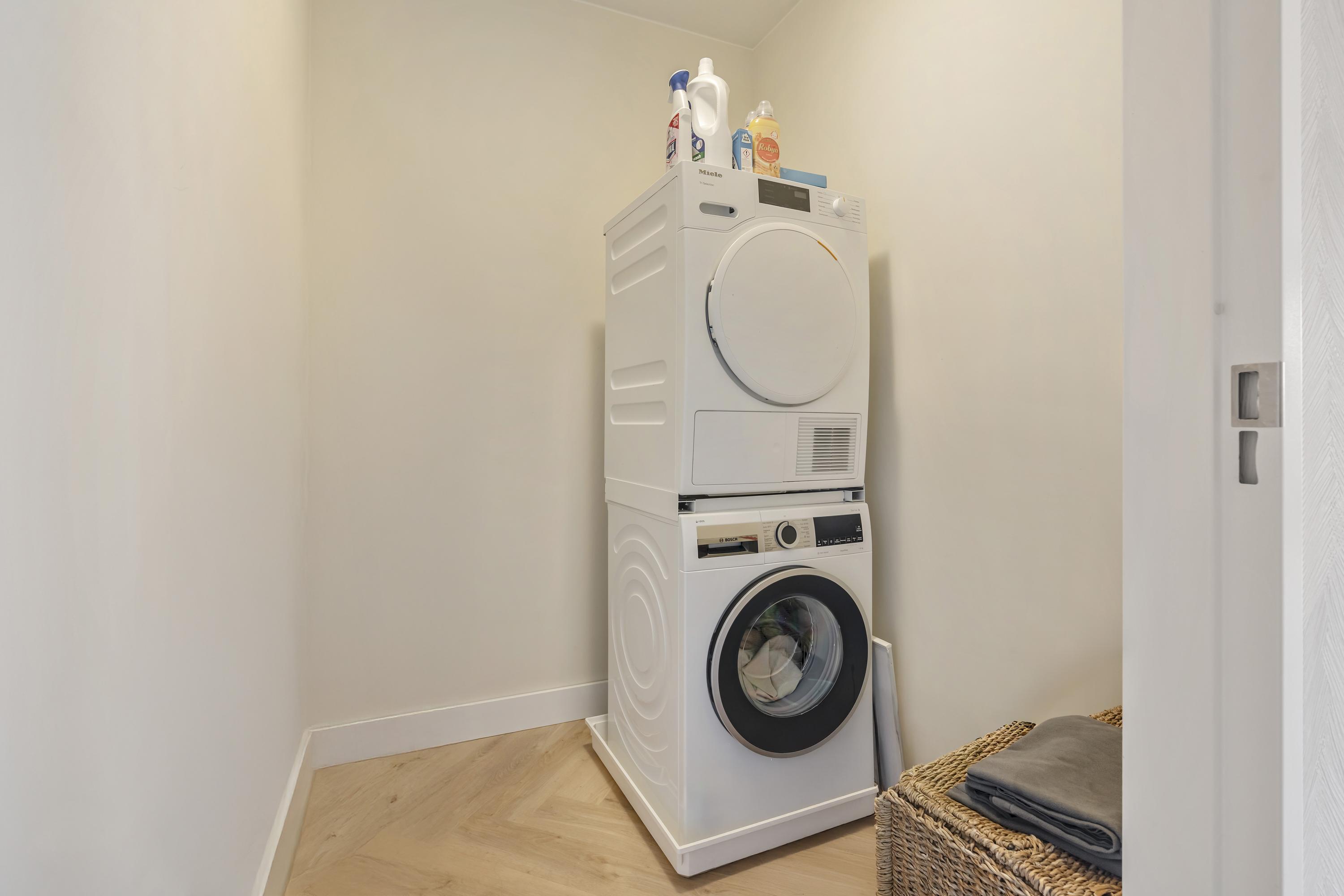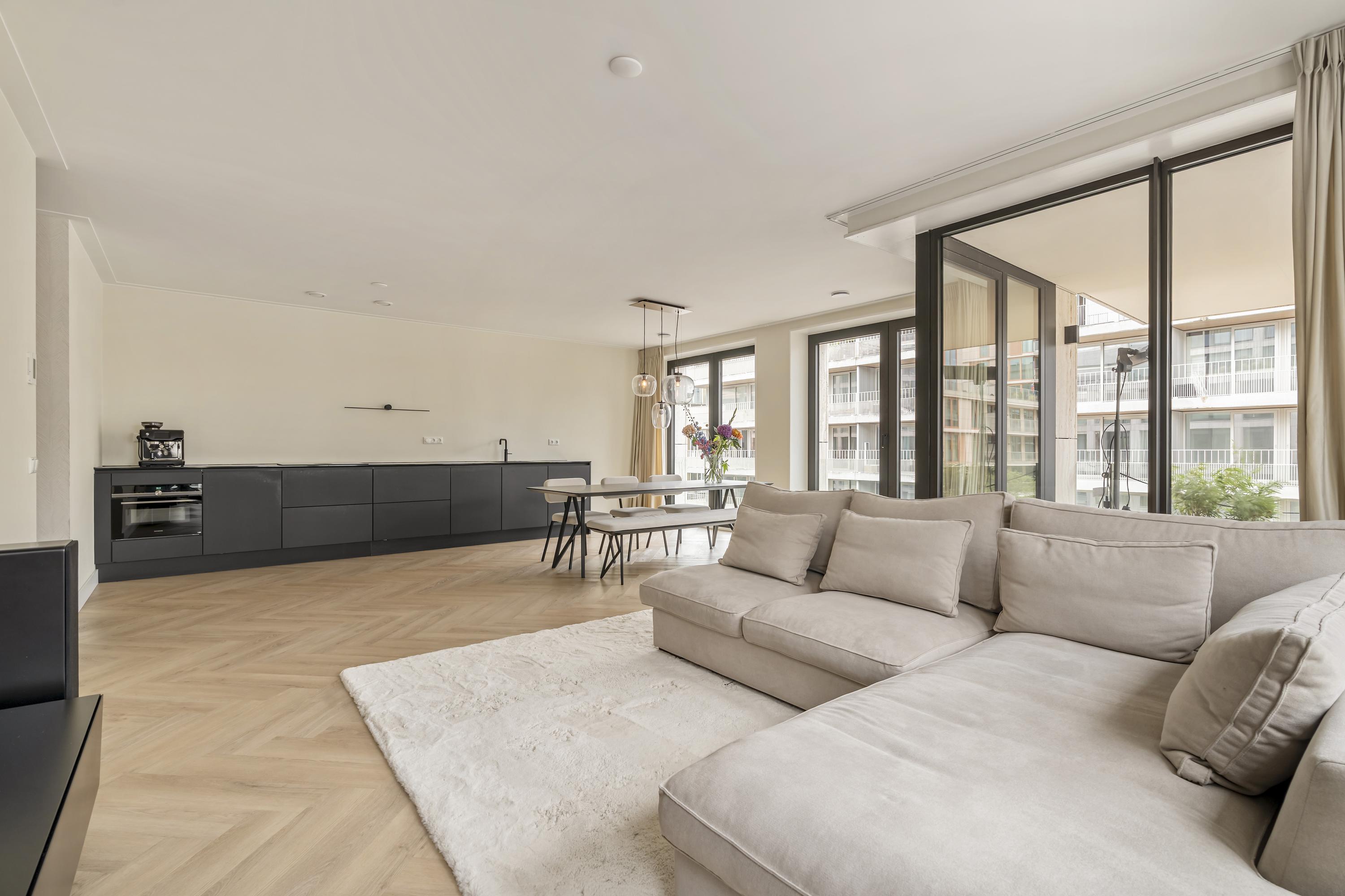 De keuken is uitgevoerd in matzwart design en voorzien van alle denkbare inbouwapparatuur, waaronder een inductiekookplaat, combi-oven, vaatwasser en een Quooker. Er is meer dan genoeg opbergruimte. Vanuit de woonkamer is er toegang tot het ruime balkon op het zuidwesten, waar u geniet van de middag/avond zon en een prachtig uitzicht op het groene plein.