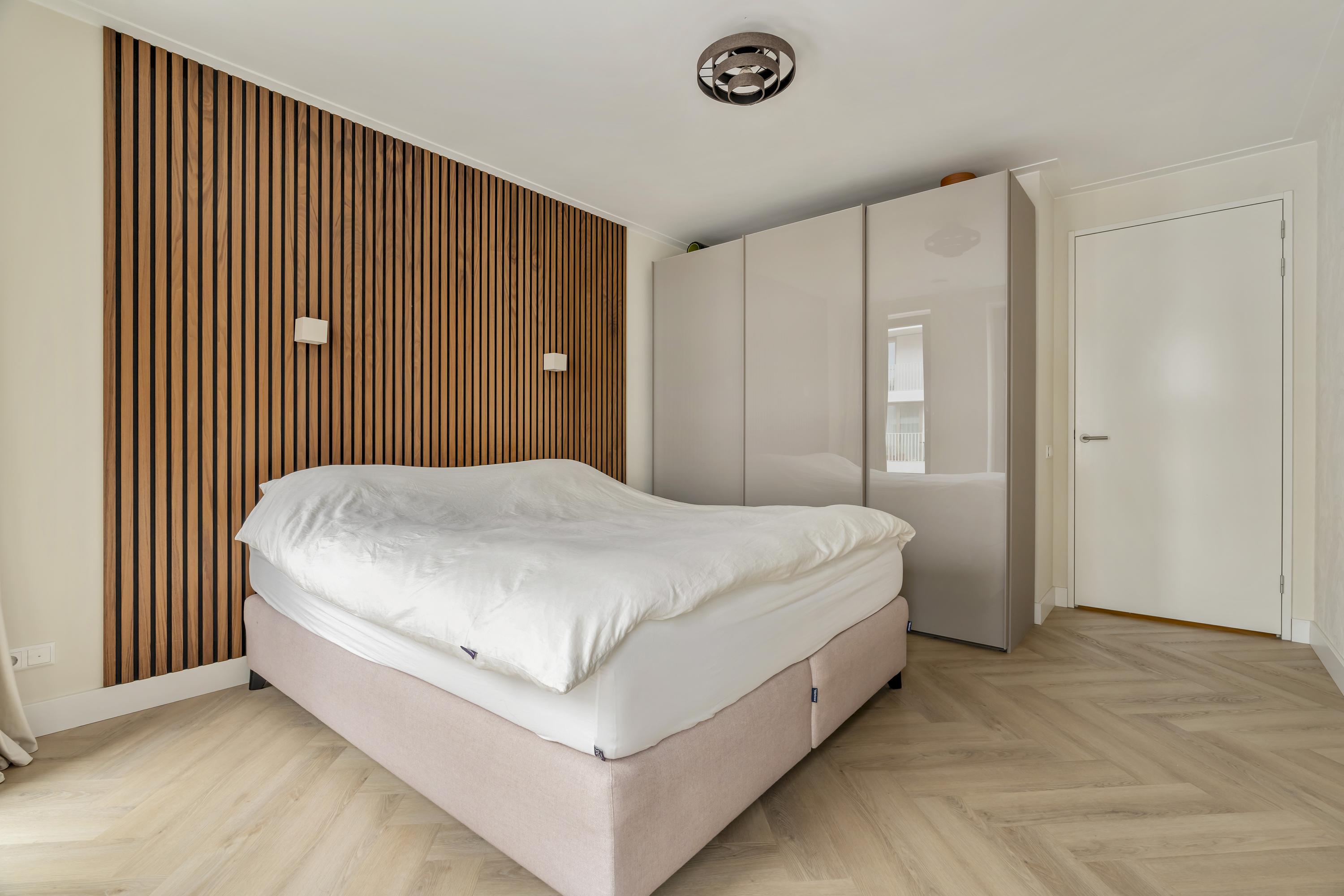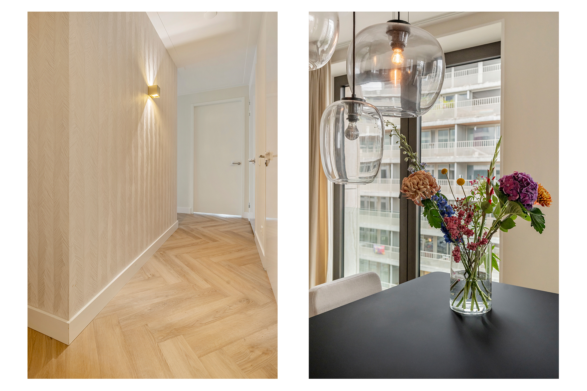 Bij binnenkomst in de ruime hal valt direct de verzorgde afwerking op: een lichte visgraatvloer, zachte tinten en subtiele wandverlichting geven het geheel een rustige, moderne uitstraling. De hal biedt toegang tot alle vertrekken en beschikt over een ruime berging, een aparte wasruimte met aansluitingen voor wasmachine en droger en een separaat toilet met fontein. De drie naast elkaar gelegen slaapkamers zijn licht en sfeervol dankzij de hoge ramen en warme kleurtonen. De kamers zijn goed bemeten en voorzien van imposante raampartijen.