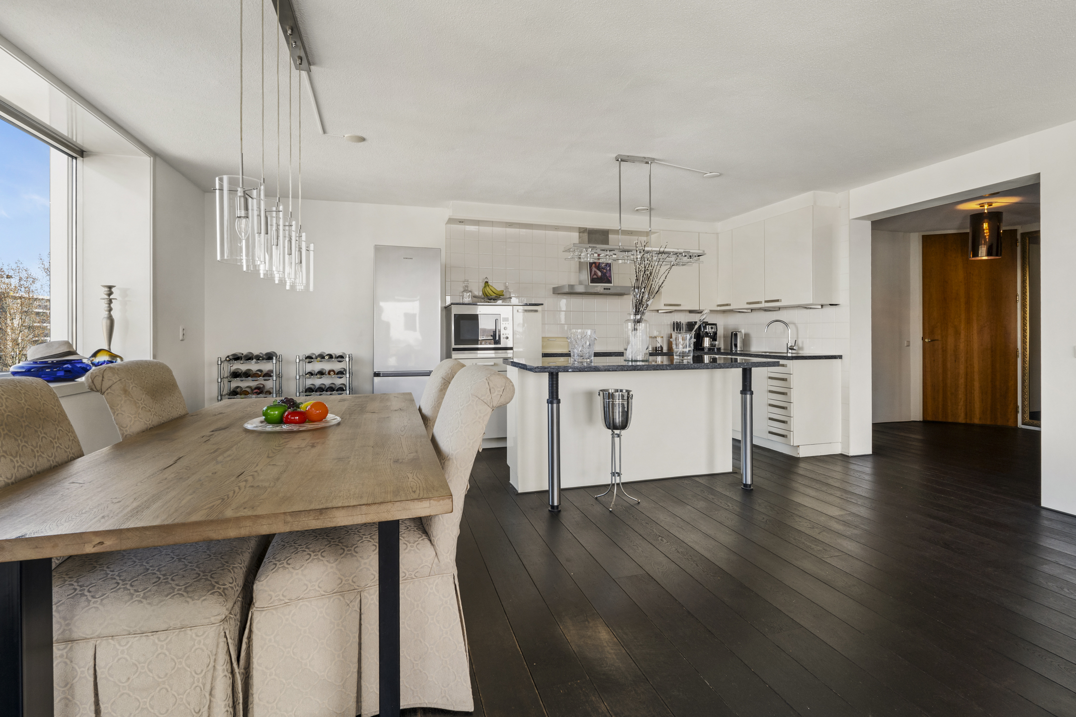 Door de ligging en de vele ramen aan zowel de zuidwest als aan de noordkant in combinatie met een ligging op de zevende (!) verdieping heeft het appartement een spectaculair uitzicht over het water en de skyline van de Amsterdamse Zuidas.
