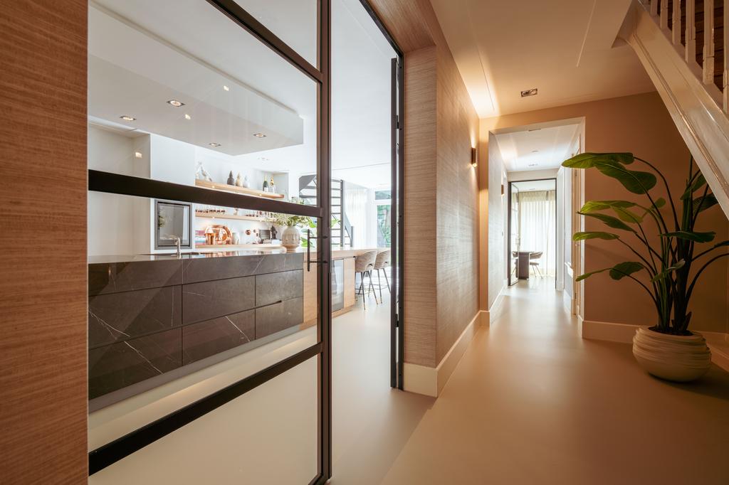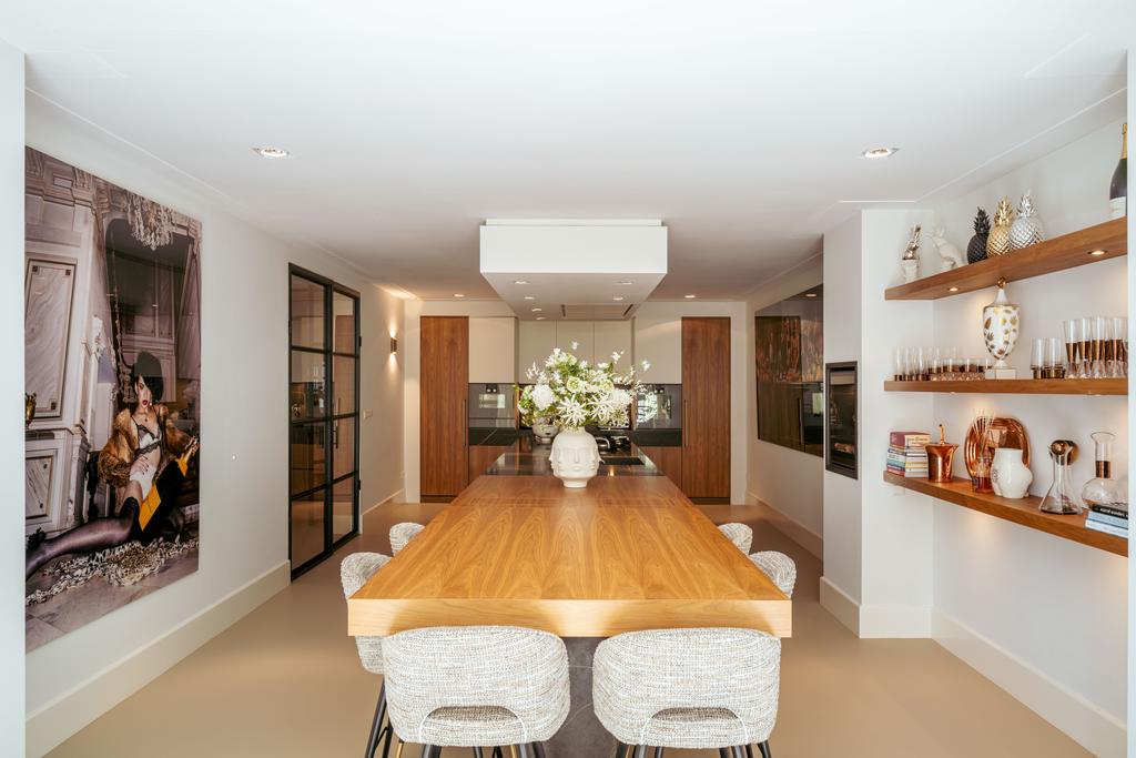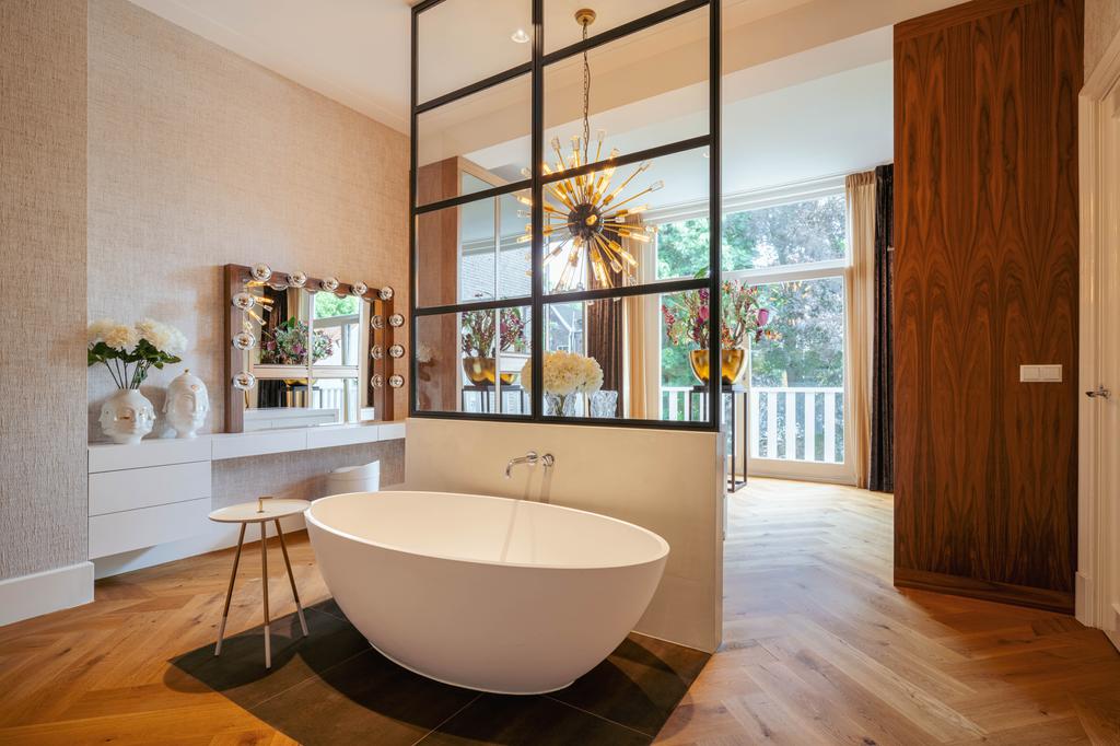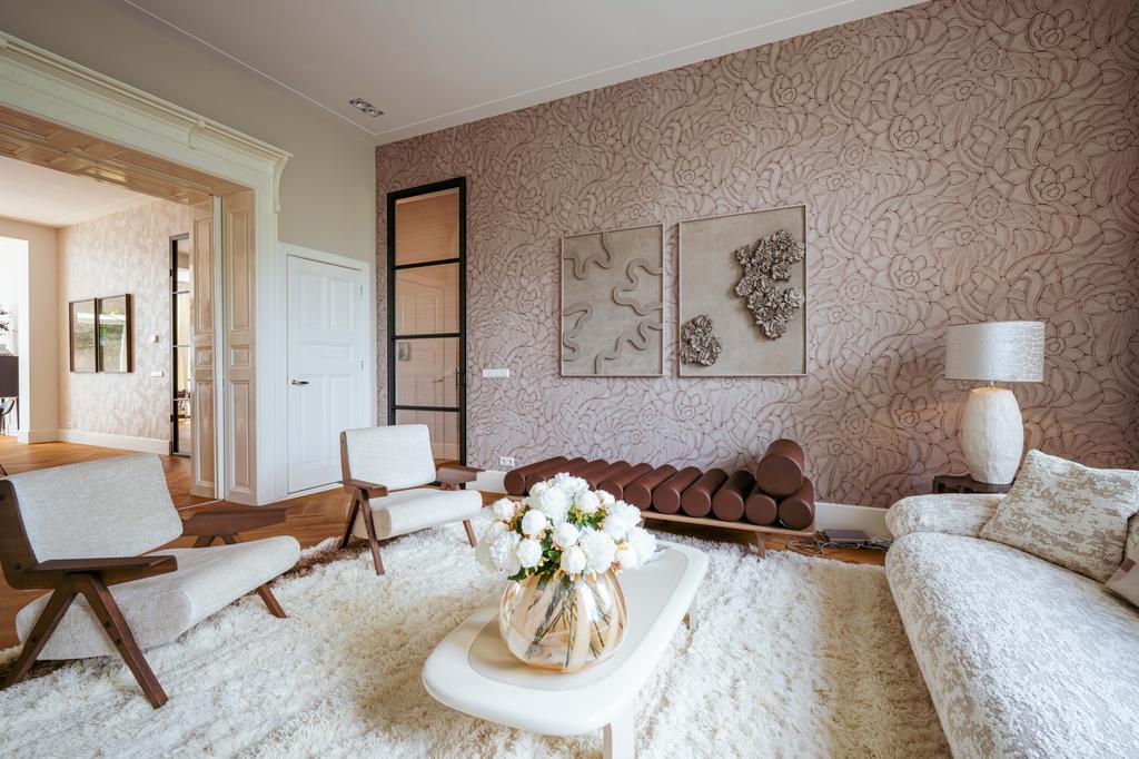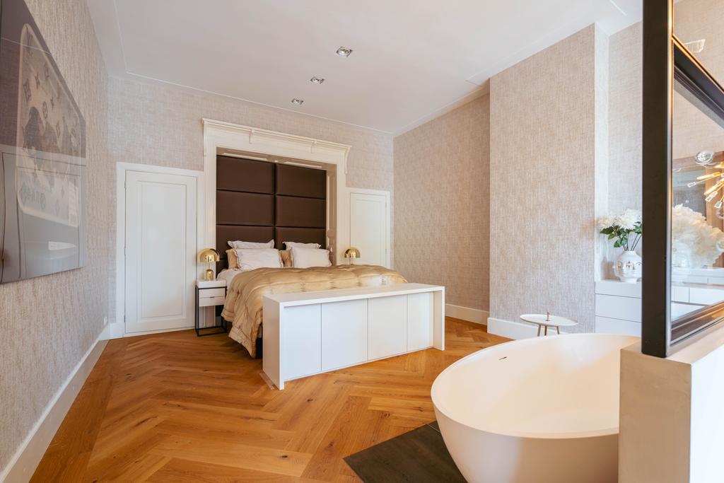 De gehele verdieping is hoogwaardig afgewerkt met stijlvol en sfeervol behang, wat de ruimte warmte en karakter geeft. Grote raampartijen aan beide zijden van de verdieping zorgen voor een uitzonderlijke hoeveelheid daglicht en benadrukken de ruimtelijkheid en luxe van het geheel.