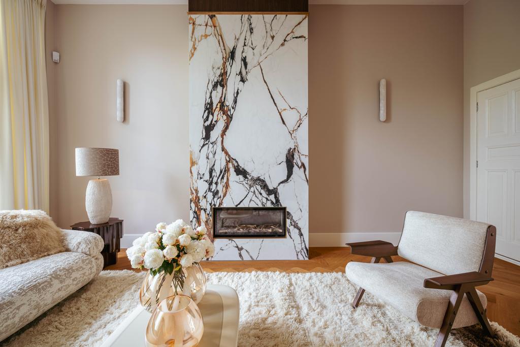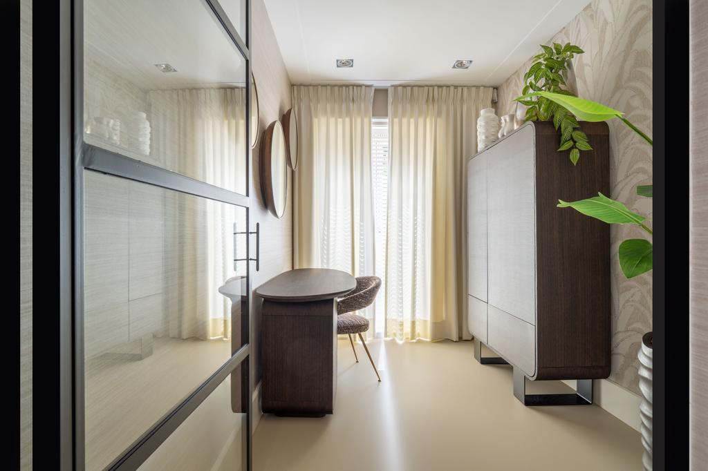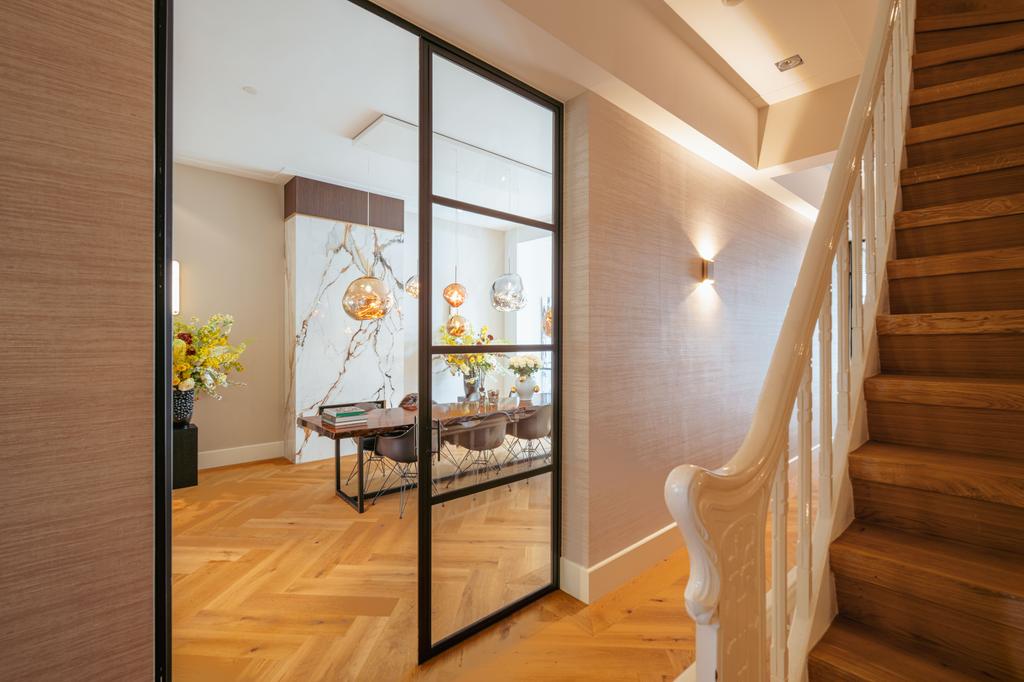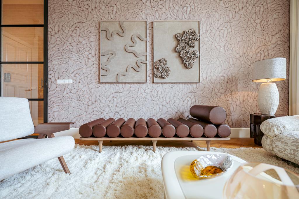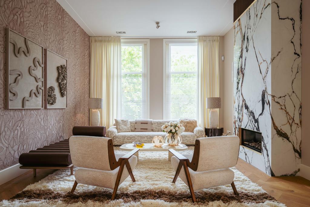 De gehele verdieping is hoogwaardig afgewerkt met stijlvol en sfeervol behang, wat de ruimte warmte en karakter geeft. Grote raampartijen aan beide zijden van de verdieping zorgen voor een uitzonderlijke hoeveelheid daglicht en benadrukken de ruimtelijkheid en luxe van het geheel.