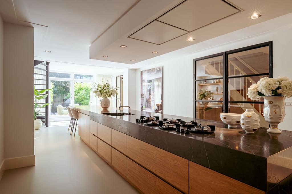 De woning is toegankelijk zowel vanaf de bel-etage als vanuit het souterrain, dat bereikbaar is via de trap of lift vanuit de hal of direct vanuit de bovengelegen eetkamer. Bij binnenkomst op deze verdieping treedt u de hal binnen, waar zich een separaat toilet bevindt. Aan de voorzijde ligt een slaapkamer met een en-suite badkamer, voorzien van een wastafel en douche. Deze multifunctionele ruimte wordt momenteel gebruikt als gym, maar is flexibel inzetbaar. De luxe uitgevoerde open woonkeuken bevindt zich aan de achterzijde en vormt het kloppend hart van deze verdieping. De keuken is uitgerust met hoogwaardige inbouwapparatuur van het merk Gaggenau, waaronder een koelkast, vriezer, Quooker, vijfpits gasfornuis geïntegreerd in het aanrecht, oven, stoomoven, vaatwasser en wijnklimaatkast. Het massief natuurstenen aanrechtblad in combinatie met het houten bargedeelte zorgt voor een warme, stijlvolle uitstraling. De keuken beschikt bovendien over bijzonder veel opbergruimte en is toegankelijk vanuit de eetkamer op de bel-etage of via openslaande deuren vanuit de hal. Een sfeervolle gashaard maakt de ruimte helemaal af. Aangrenzend aan de keuken bevindt zich een slaapkamer – momenteel in gebruik als werkkamer – die, net als de keuken, via openslaande deuren directe toegang biedt tot het ruime terras. Dit terras leidt via een trap naar de fraai aangelegde, op het zuiden gelegen achtertuin, die ook bereikbaar is via een achterom aan het Schapenburgerpad. Deze toegang biedt de zeldzame mogelijkheid om de achtertuin te betreden en bijvoorbeeld fietsen direct in de tuin te plaatsen, uniek in het centrum van Amsterdam. De tuin, onder architectuur aangelegd door Erik van Gelder, beschikt over een complete buitenkeuken, ideaal voor lange zomeravonden, en is ook voorzien van een vrijstaande berging. Hier geniet u in alle rust van zon en privacy, tot in de late uurtjes.