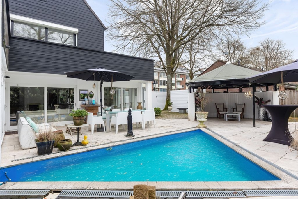 Met een woonoppervlakte van maar liefst 230 m² biedt deze woning uitzonderlijk veel ruimte voor zowel wonen als werken. De woning werd in 1987 ontworpen en gebouwd door een architect als eigen woonhuis, wat zichtbaar is in de bouwkwaliteit en de doordachte indeling. De entreehal met dubbele deuren geeft toegang tot een royale T-vormige living en een ruime woonkeuken, beide voorzien van vloerverwarming. De tuinkamer, geïsoleerde voormalige garage, zes slaapkamers en twee badkamers maken de woning multifunctioneel. De vele raampartijen zorgen voor een prettige lichtinval en dragen bij aan het aangename woonklimaat.