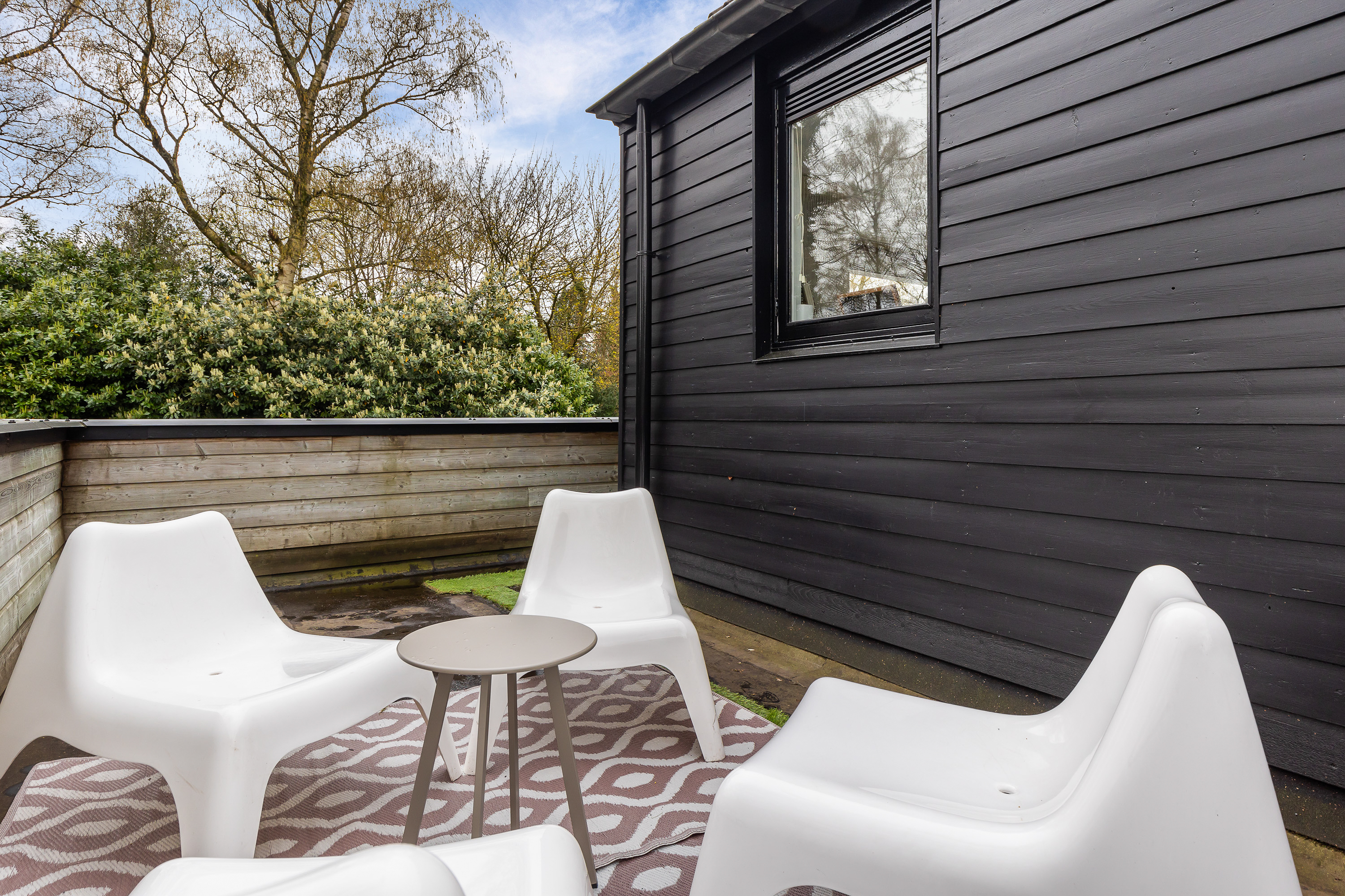 De aangrenzende living biedt verschillende indelingsmogelijkheden met meerdere zithoeken. Een moderne gashaard vormt het centrale punt, terwijl de schuifpui directe toegang biedt tot de achtertuin. Aansluitend is de tuinkamer gerealiseerd, compleet met airconditioning en warmtewisselaar. Dit is een comfortabele ruimte om te gebruiken als tweede zithoek, televisiekamer of thuiskantoor.