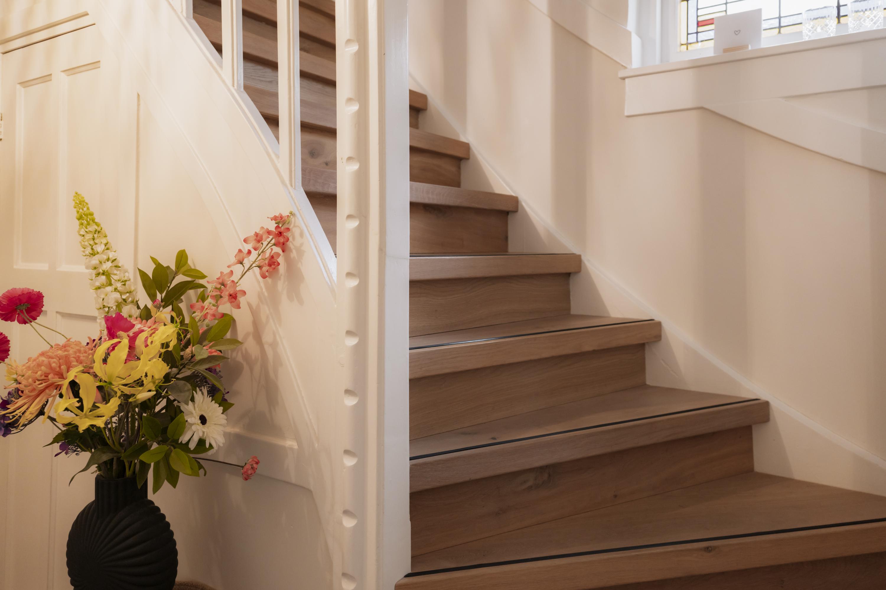 Entree met originele granitovloer, trapopgang, toilet en toegang tot de ruime kelder. De woonkamer met erker en houthaard biedt een fijne, royale leefruimte met volop mogelijkheden voor een comfortabele loungehoek. De luxe woonkeuken vormt het hart van de woning: ruim, licht en stijlvol afgewerkt, met kookeiland en hoogwaardige inbouwapparatuur. Vanuit de keuken is er een prettige verbinding met de entree en met de achtergelegen bijkeuken, inclusief een separate wasruimte.