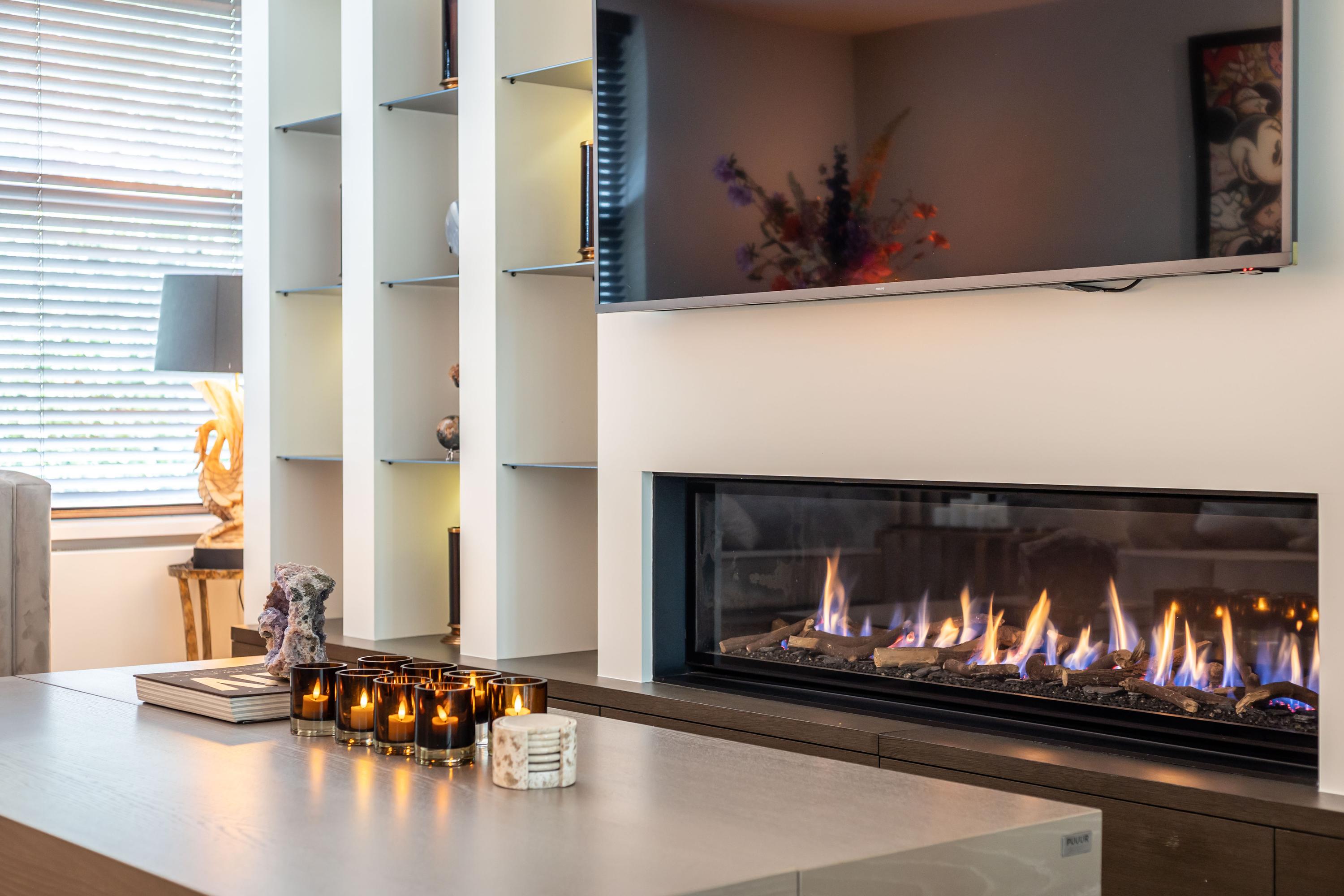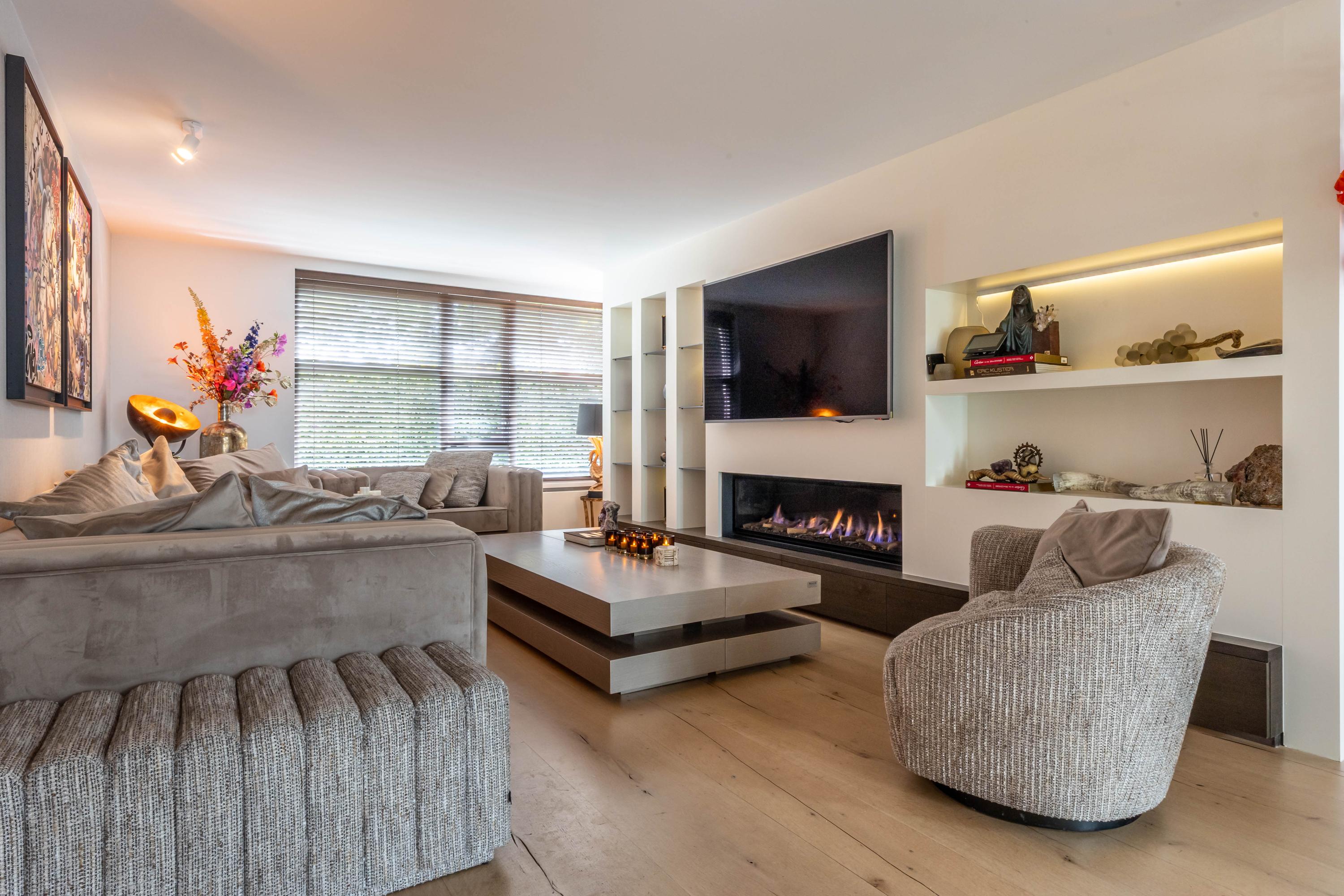 De living ademt rustige luxe, met een sfeervolle gashaard, maatwerkkasten en een geïntegreerde televisieopstelling. Grote raampartijen verbinden het interieur naadloos met de tuin; het lichtspel in huis is spectaculair.