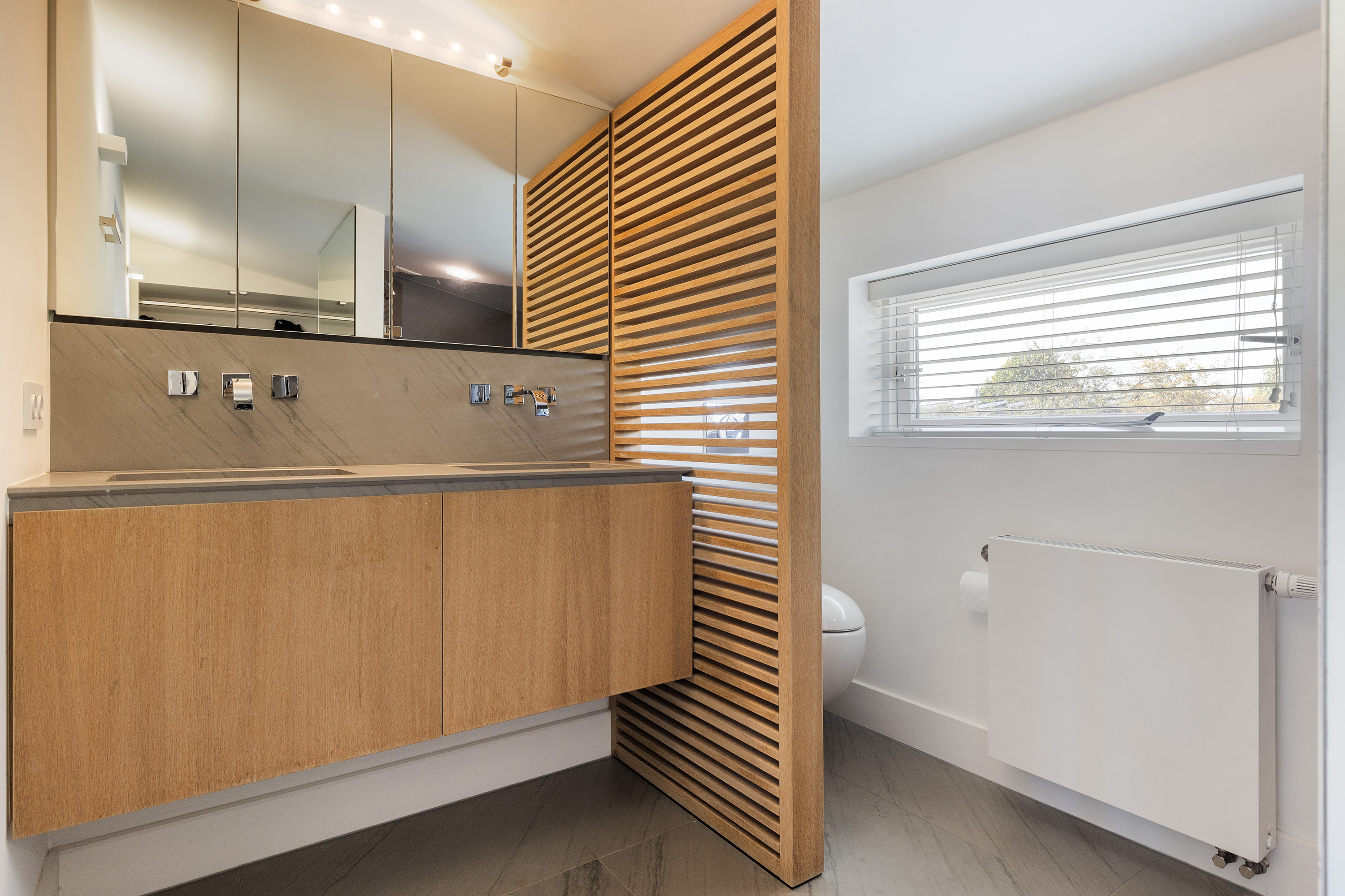 De entree is royaal, met open eiken trappen en sfeervolle verlichting. Het toilet is luxe uitgevoerd met een wandcloset, urinoir en marmeren wastafelmeubel.