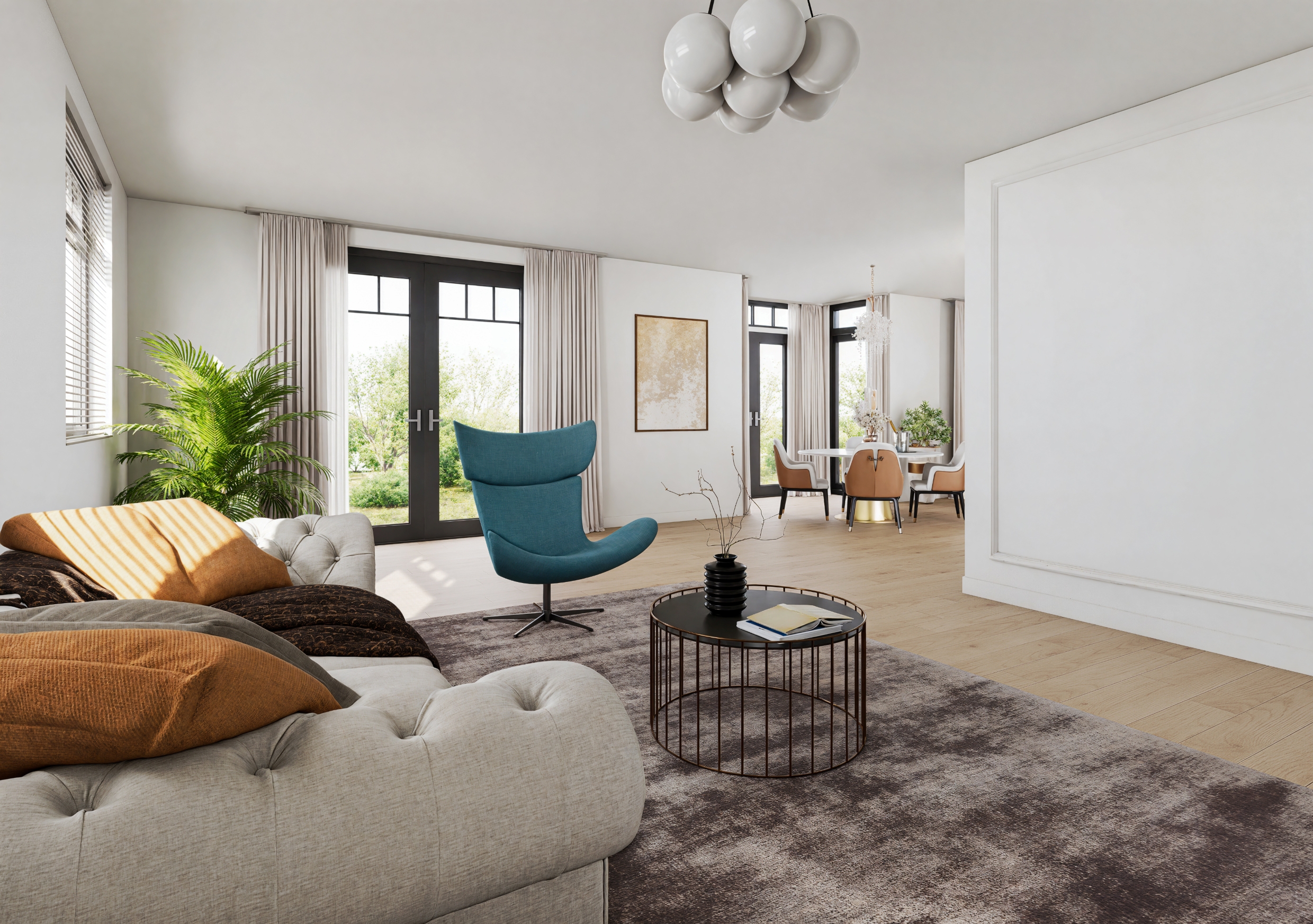 De ruime woon- en eetkamer biedt plek voor het hele gezin, met een op maat gemaakte cinewall en sfeervolle HR-gashaard voor extra warmte en gezelligheid.