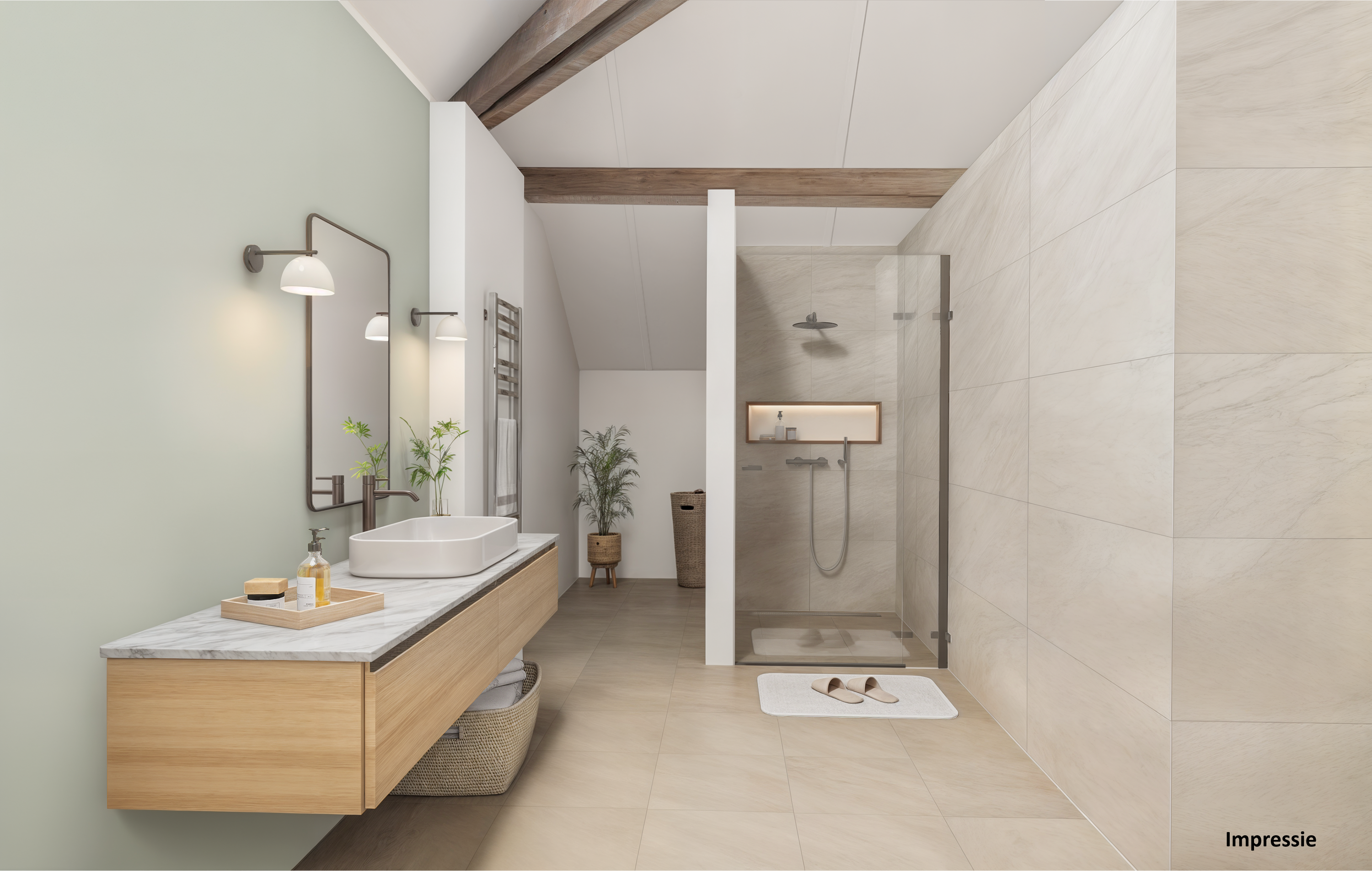 Ruime badkamer met ligbad, inloopdouche, thermostaatkraan, op maat gemaakte wandkast en dubbele wastafel. Dimbare spots verwerkt in de oude balken zorgen voor extra sfeer.
