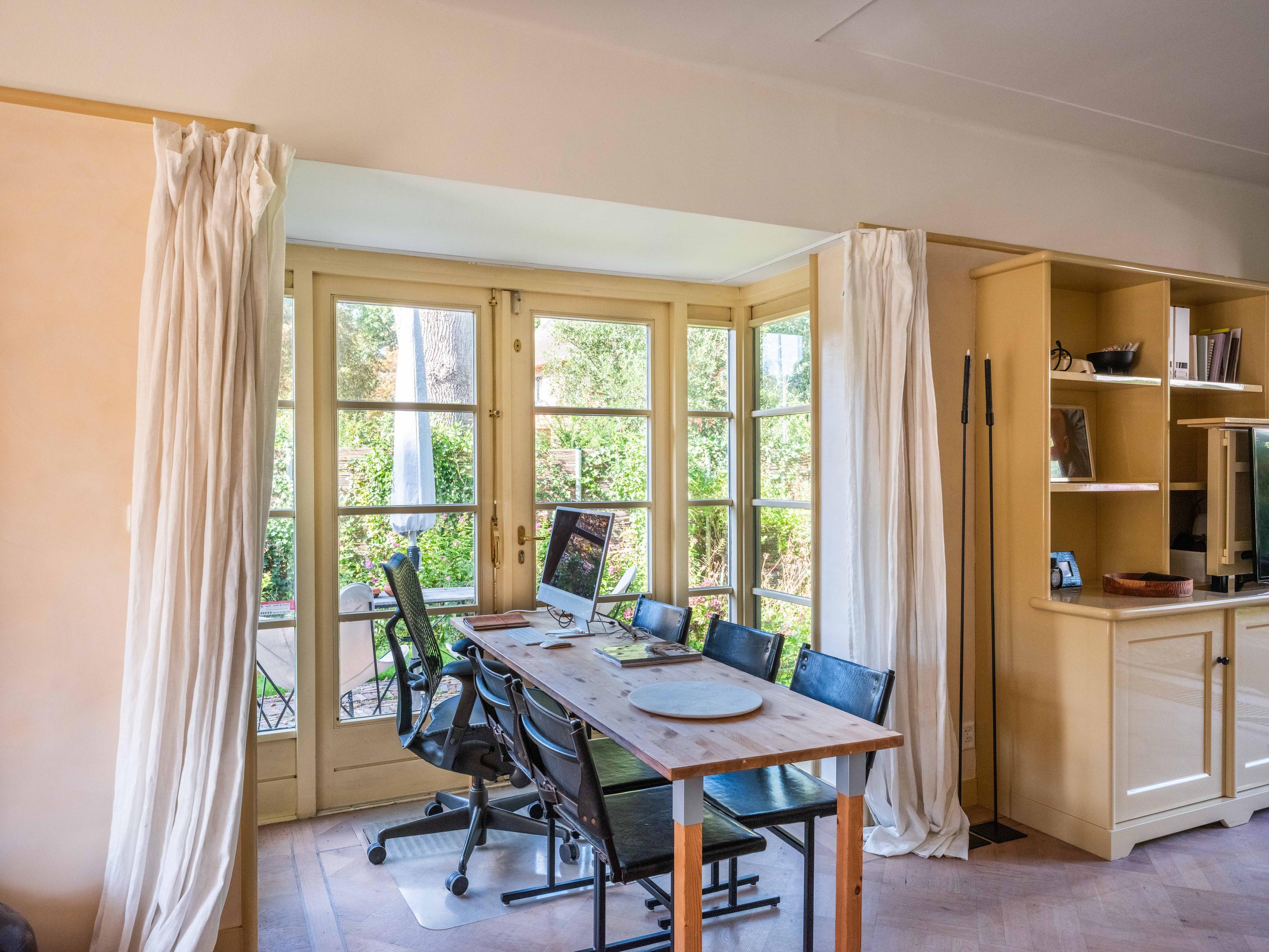 De woonkamer met erker is heerlijk licht. Een parketvloer met bies geeft een chique uitstraling. Openslaande deuren leiden naar diverse terrassen, waar u ervoor kunt kiezen heerlijk in de zon of in de schaduw te gaan zitten.