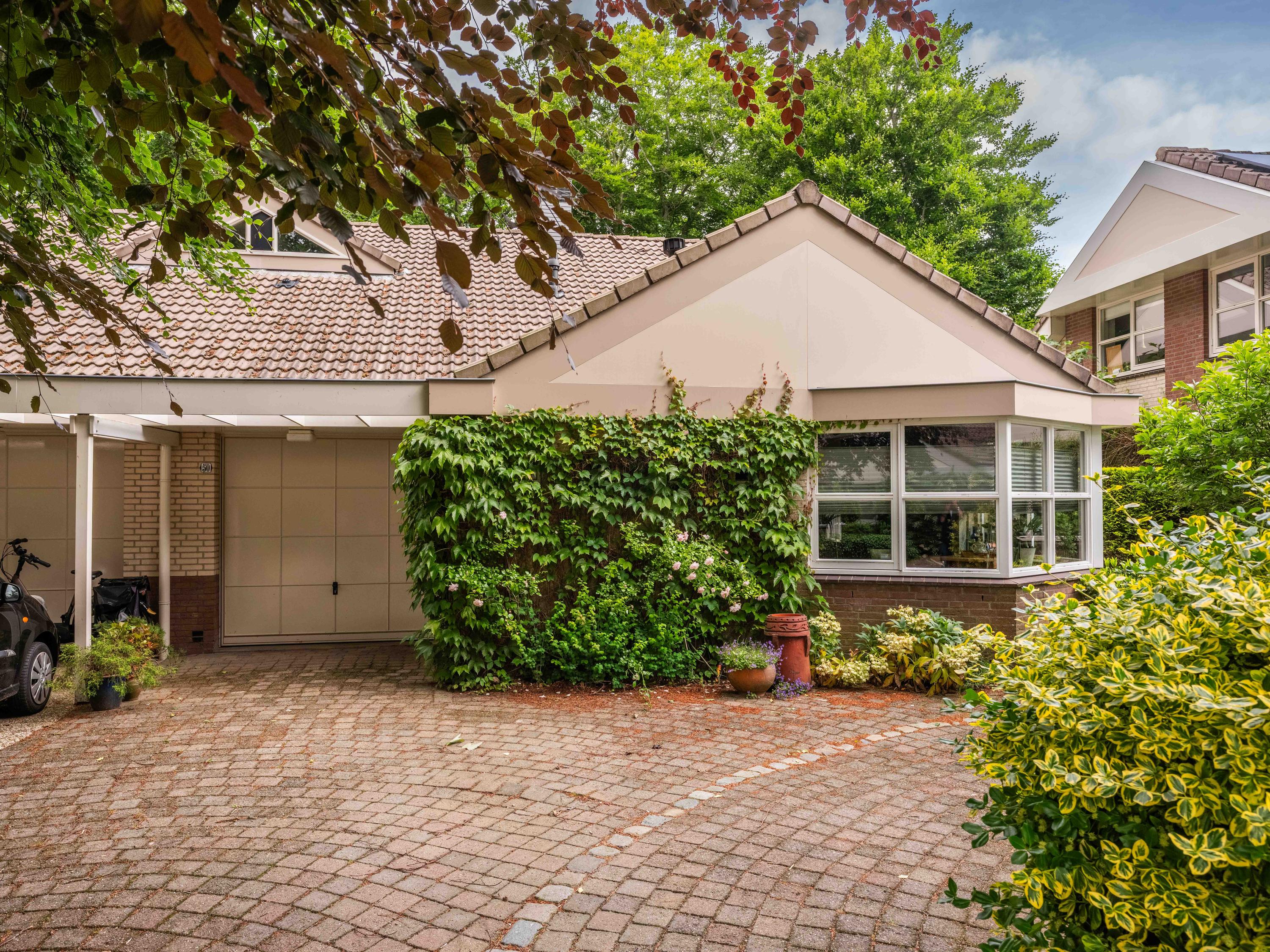 De inpandige garage is via de hal bereikbaar en biedt ruimte voor één auto, maar op het pad kan ook prima geparkeerd worden.